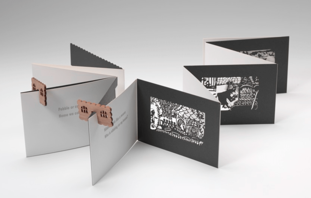 The first artists book I discovered was the Hansel and Gretel book, I was initially attracted to this by its opening. Upon investigating further I discovered that the pages are laser cut, the book can be read as a book or shine a light through the pages to project the artwork’s shadow onto a wall! I like the idea of this book being able to be viewed in two completely different ways.