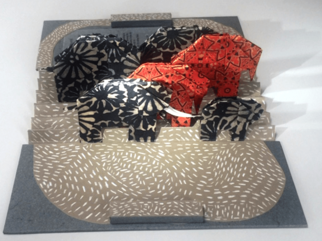 “Save the Elephants was designed to bring awareness of their struggle as the population is rapidly declining due mainly to poachers.” Initially I was drawn to this artist book by the carefully crafted origami elephants. I feel that this carries an important message in regards to the safety of the elephants in the wild.