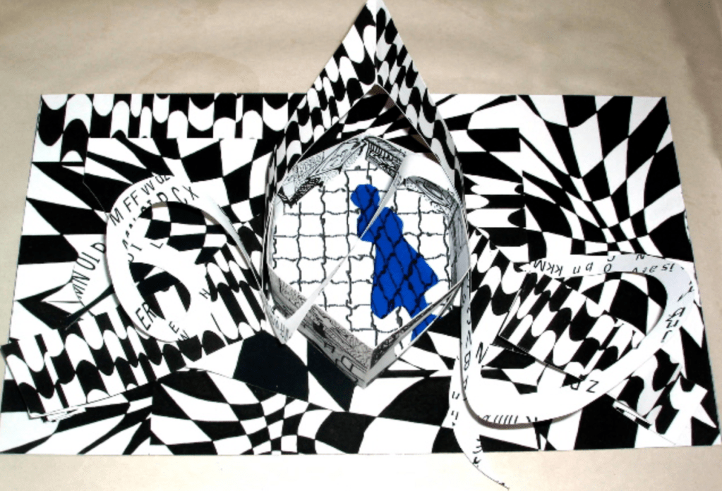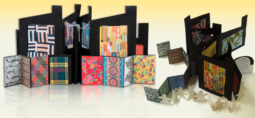 “The interweaving accordion book represents Triple-decker houses which were built in the United States to accommodate newly arrived immigrant workers and their families. The apartments are decorated with textiles, fabric and tiles that are visually integrated with those of other ethnic families signally a wide range of diversity.” There seems to be a lot going on within this artist book, but that is why I find it interesting. I like the use of the bright bold colours and patterns on the black paper. I would love to be able to examine this book in person as from the images it isn’t very clear where one part stops and the other starts. It appears that the larger folded books centre has the smaller book attached with the paper people chain connecting. Very busy and confusing but very interesting and intriguing.