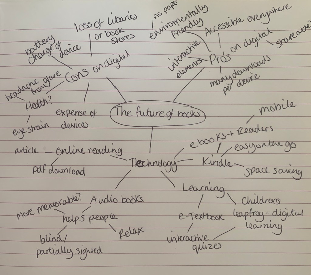 I started off by creating a mind map to help stimulate ideas of what I think the future of the book is.