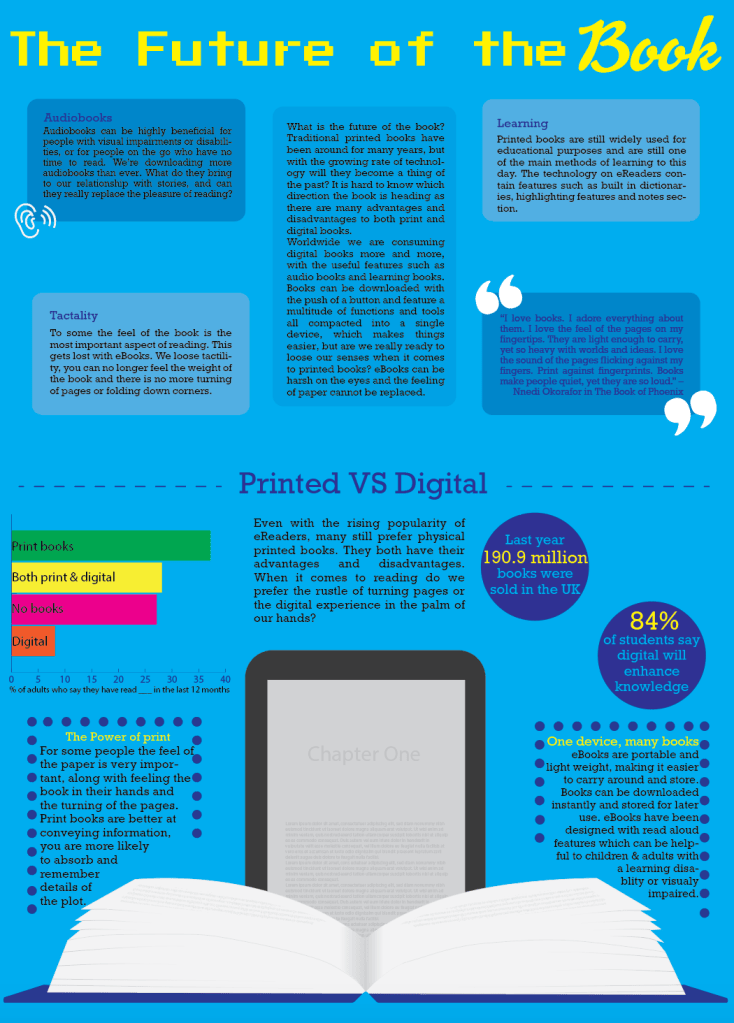 Going back to my infographic, I thought of ways that I could add more information on what ‘I’ thought the future of the book is. Originally looking back at the brief, my work and my tutors feedback I think I became slightly lost, as I simply compared printed and digital without touching on the future so I thought I would recreate the infographic with the correct information!