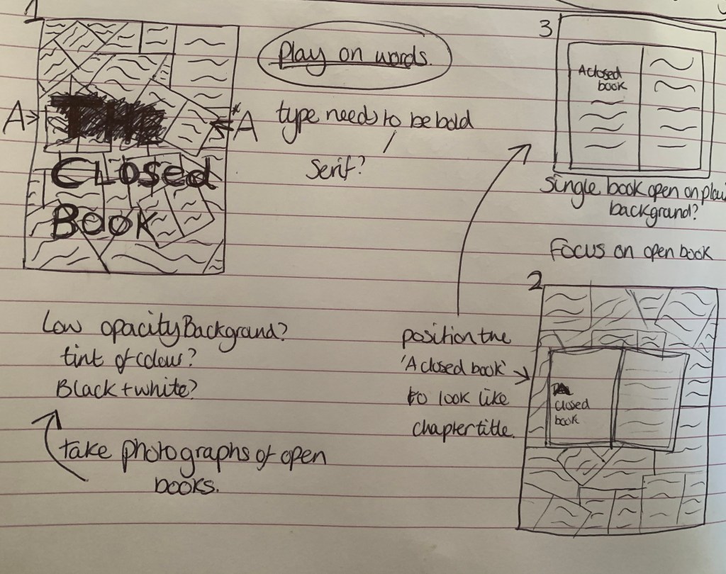 Open pages: I like the play on words for this design with the whole background being made of open books and the typography of ‘A Closed Book’ made to stand out. The best way to achieve this is by having the background in black and white, or of a tinted colour? And to choose a clear but formal typeface and colour.