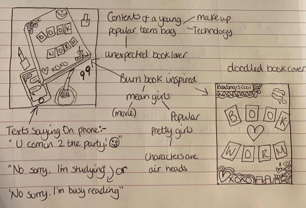 Out of the above sketches I am drawn to the word book made from a worm, the stack of books with the worm coming from the pages and the worm made of books underground. I also like the bottom centre design of an unexpected book lover, I have created the cover of a book in the style of ‘Mean girls – Burn book’ surrounded by other girly items and technology.