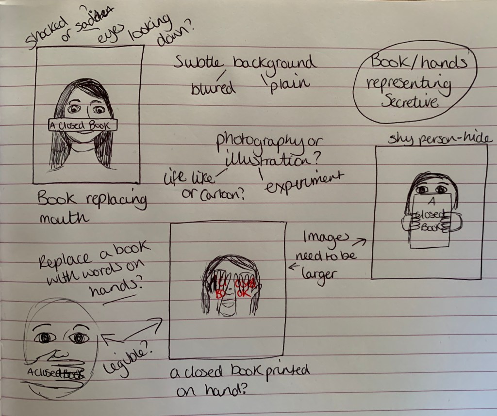 Woman and book: The idea behind this sketch is to show either a shocked or shy expression on the woman’s face with the spine of a book in front of her mouth. This is to try represent how being a closed book represents someone who is shy, quiet and reserved. The woman could either seem shocked that her mouth has been replaced – without her realising she is hard to read and is reserved, or it could be expected by the woman and she could just simply have a shy blushing expression on her face. I will experiment with both photography and illustration for this design.