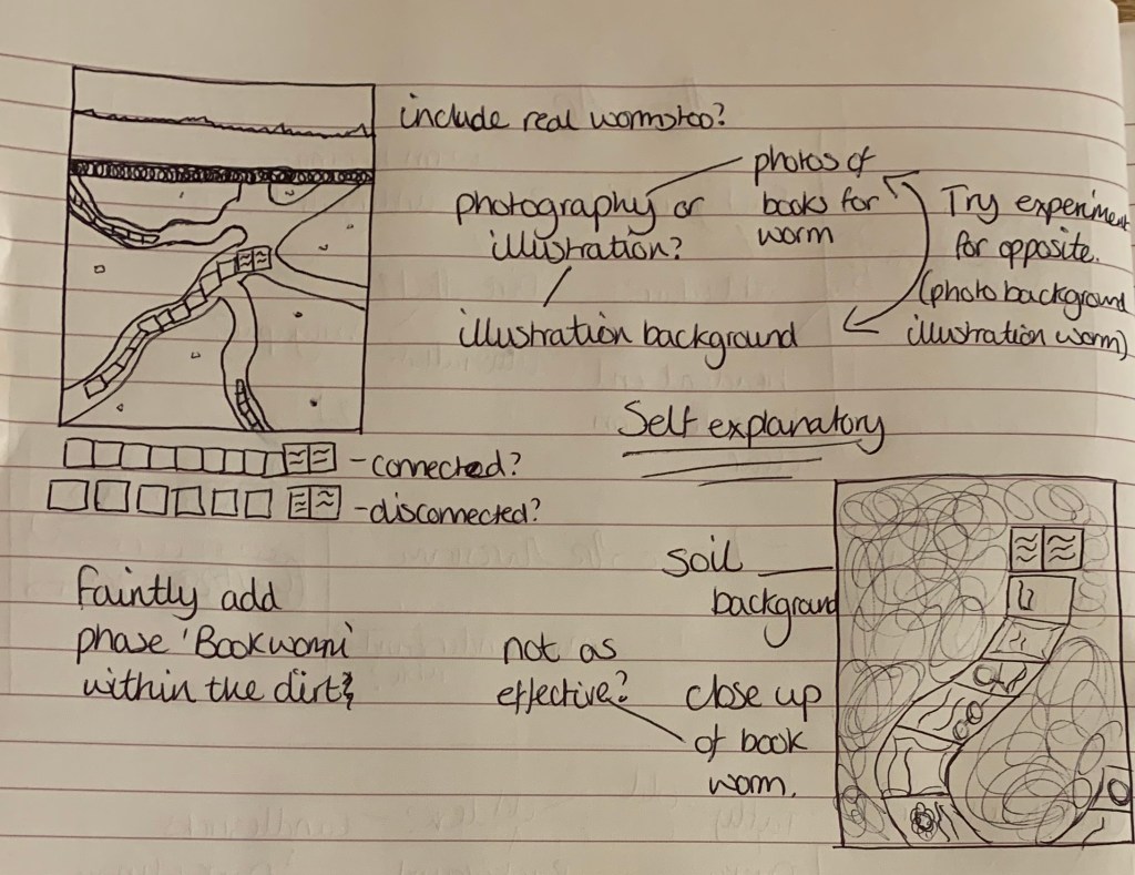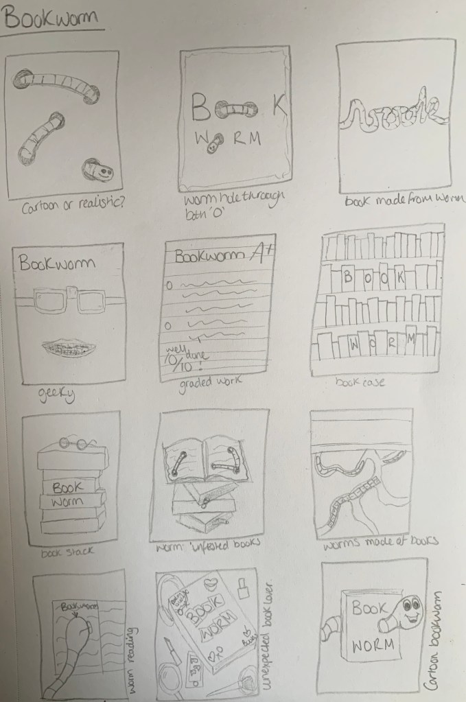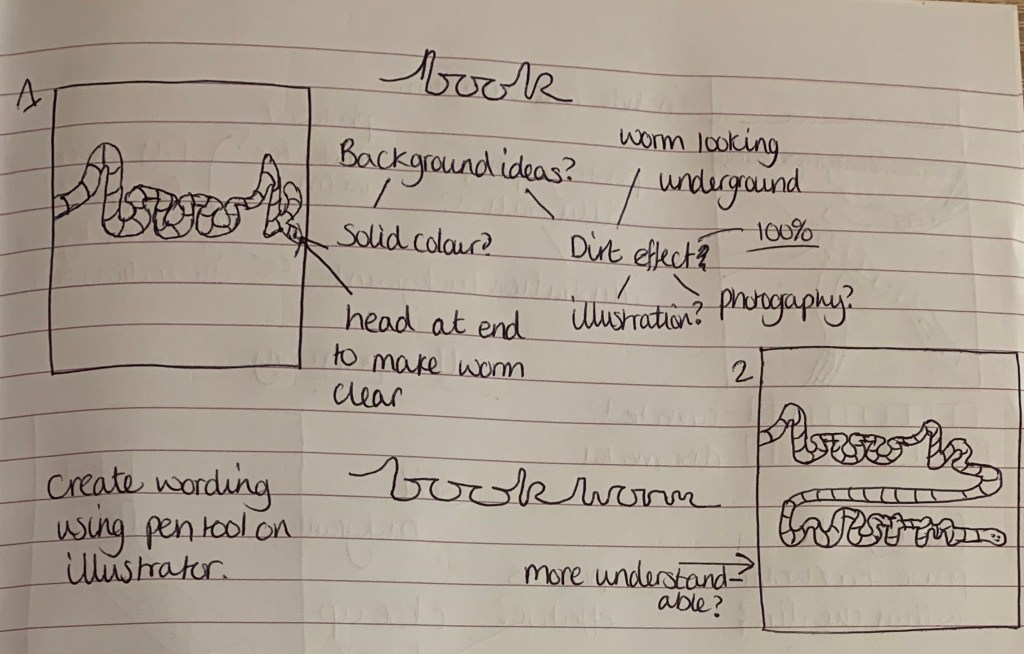 Worm Word: I like the idea of this design with the word ‘Book’ being made from a worm to create a say what you see design. To make it clear that it is a worm I will make sure to include a head at the end of the ‘k’ rather than the design carrying on past the edge.