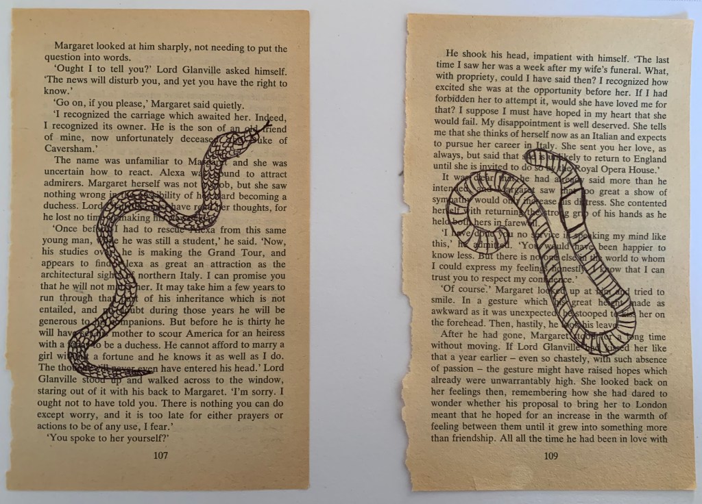 Whilst looking at the images above, it reminded me of gothic things, I then started to think about snakes with this design. Instead of going to my sketchpad I decided to test out some sketches on old book pages. I really like this look! I just think that for this particular design I have a more detailed idea in mind. (I will defiantly remember this for future exercises if required)