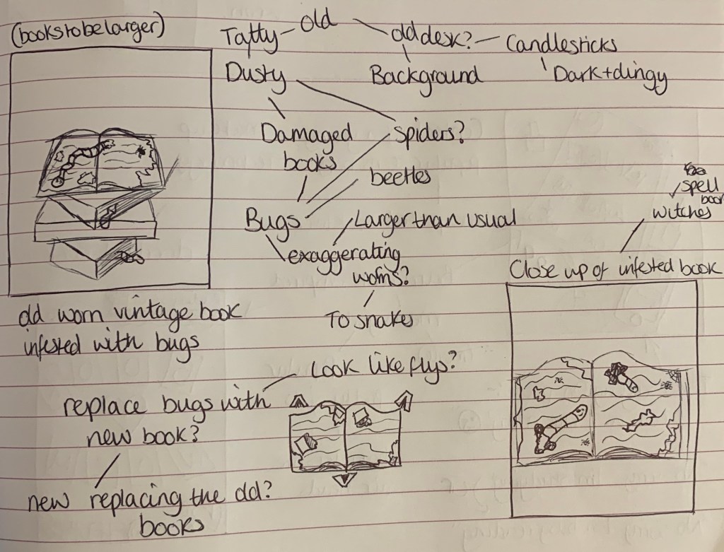 I wanted to take this design from the approach of book eating bugs. I imagine the scene of this being in a dark old fashioned abandoned study dimly lit by a candle stick in the background, the desk would be made from a dark polished wood, covered in thick dust with a stack of books which have been infested with bugs. This then made me think of witches and it being an old creepy spell book. However I’m not sure if my imagination is running off course with the phrase, I just wanted to come up with a design not so obvious to the phrase. However I’m not sure if the background will over complicate the design and take away the focus of the books. This will be something I can experiment with.