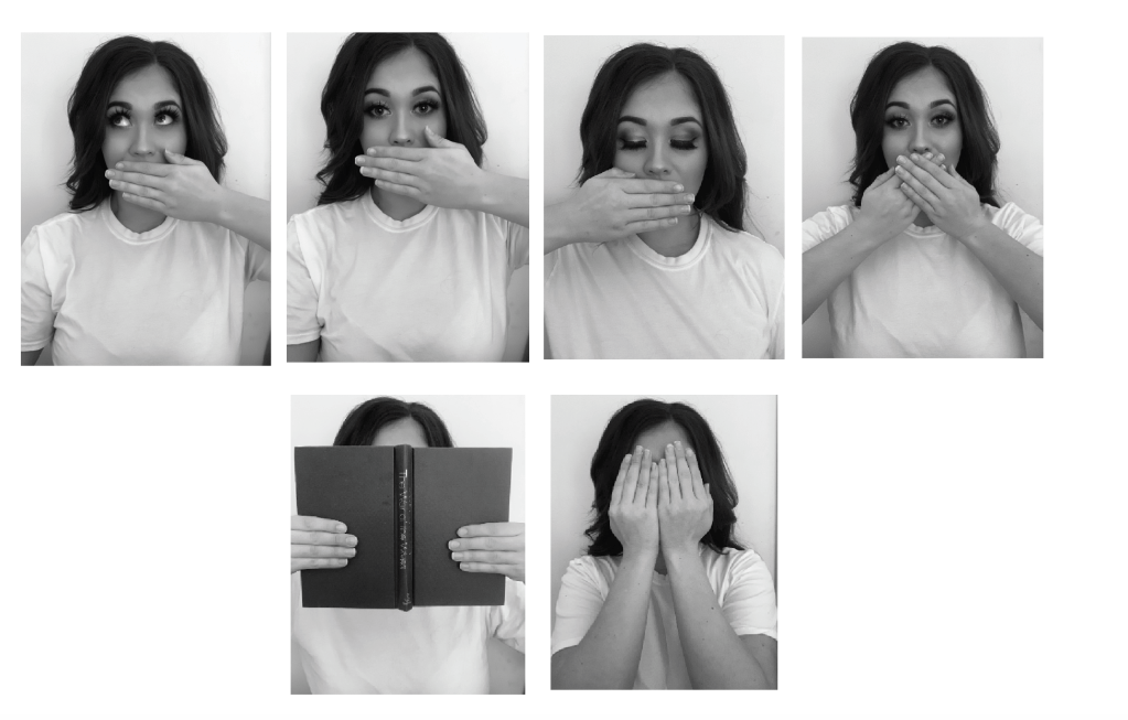 I felt that the stamp effect typeface works best for this particular design. Out of both images I feel that both hands covering the face is more fitting to the phrase, as this gives nothing away. You can see non of her face giving an intriguing feel.. What does she look like? Why is she hiding?