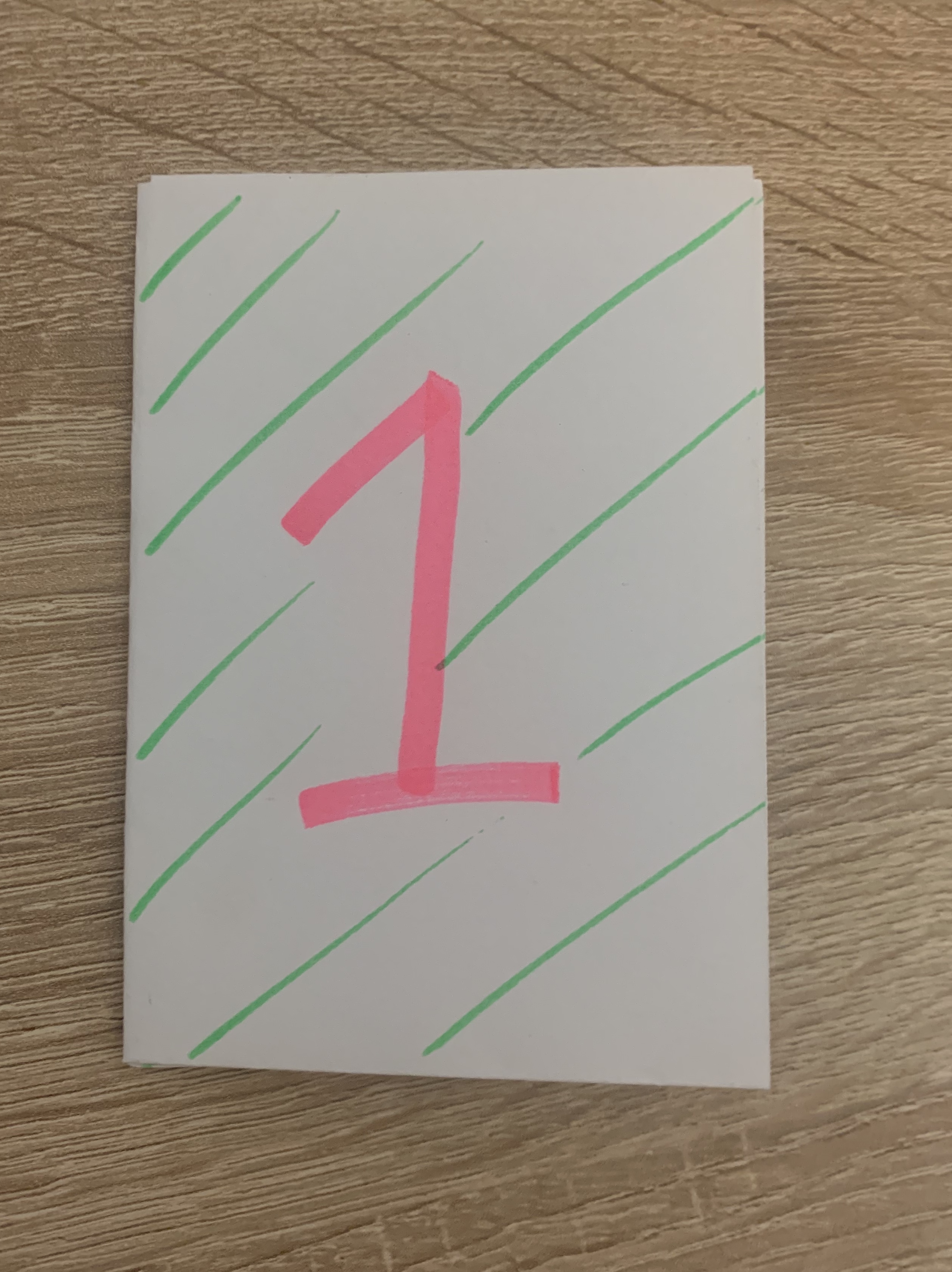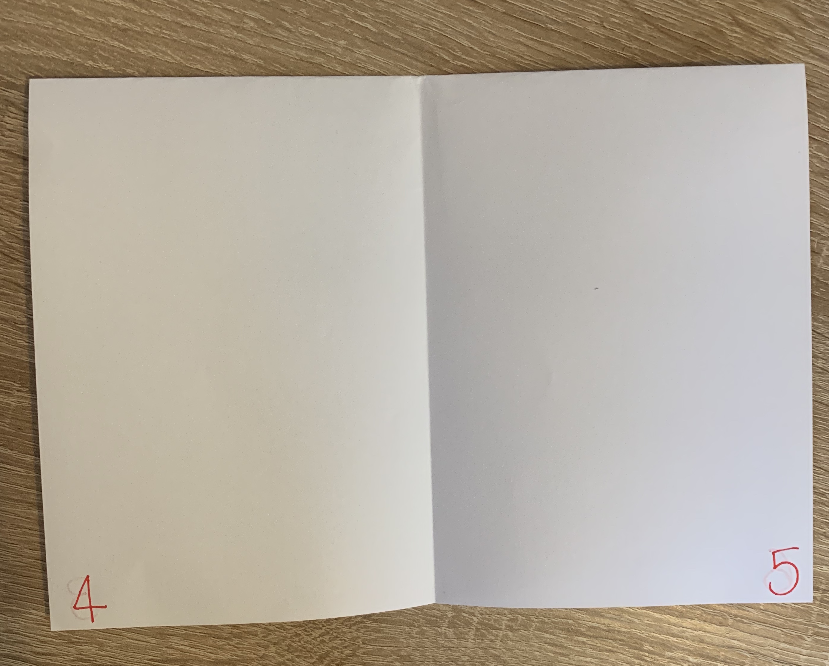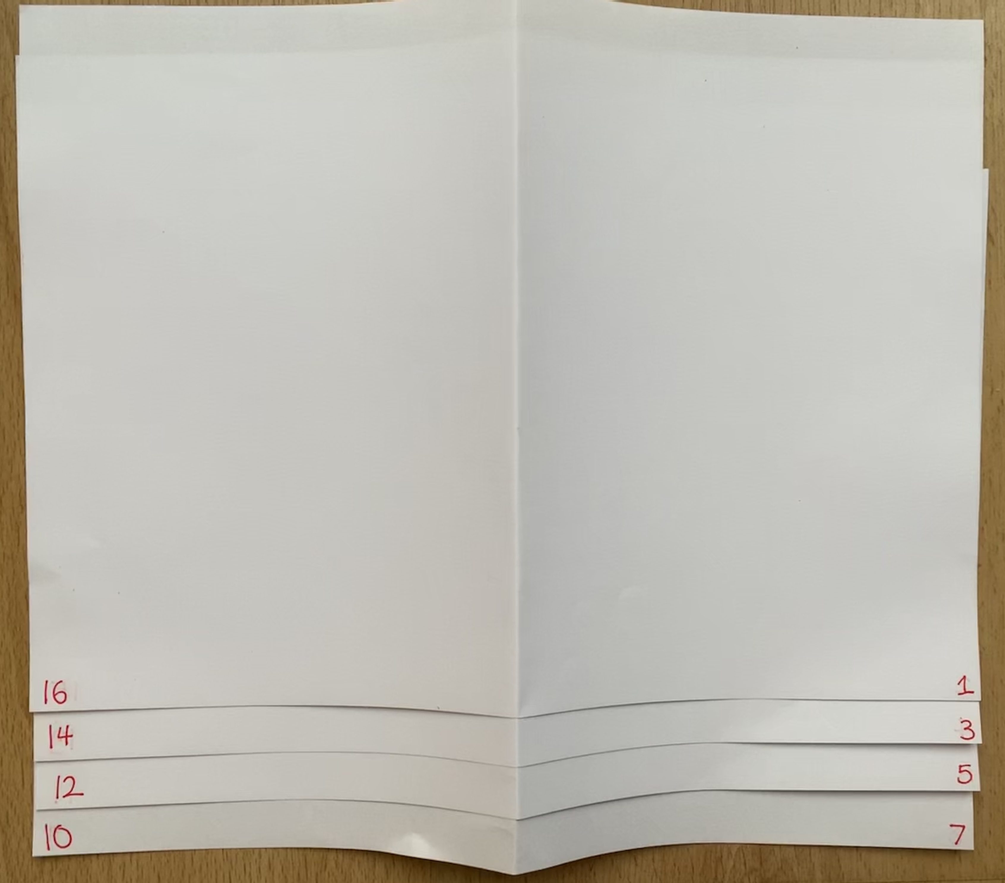 Number each of your sixteen pages from front to back cover. Unpack the document and notice how the relationship of the numbers on the front and back of each sheet. For example, 1 and 16 should be alongside each other, with 2 and 15 on the reverse. These numbers dictate where your content will go, and how this content needs to be printed, and are known as ‘printers pairs’.
