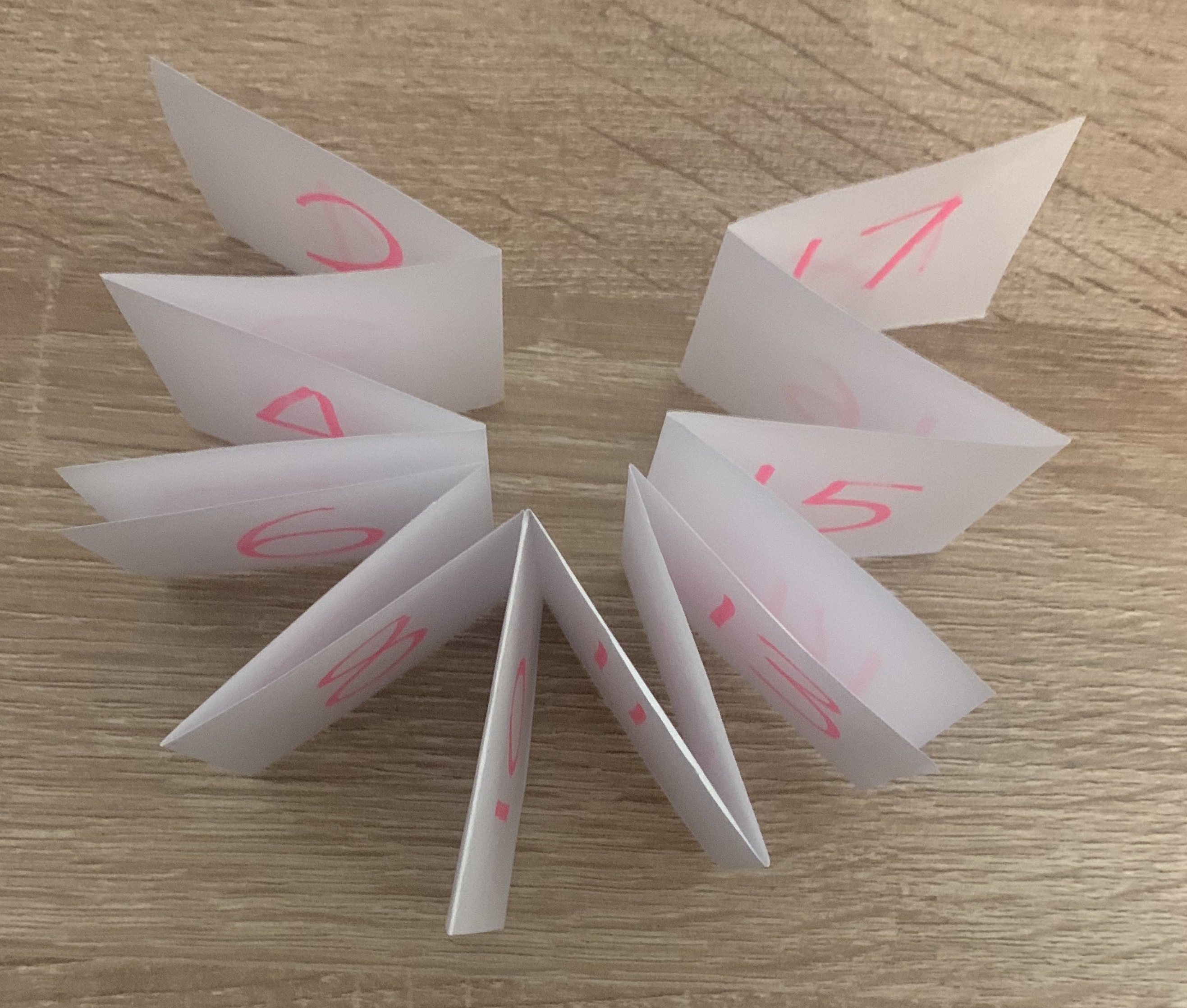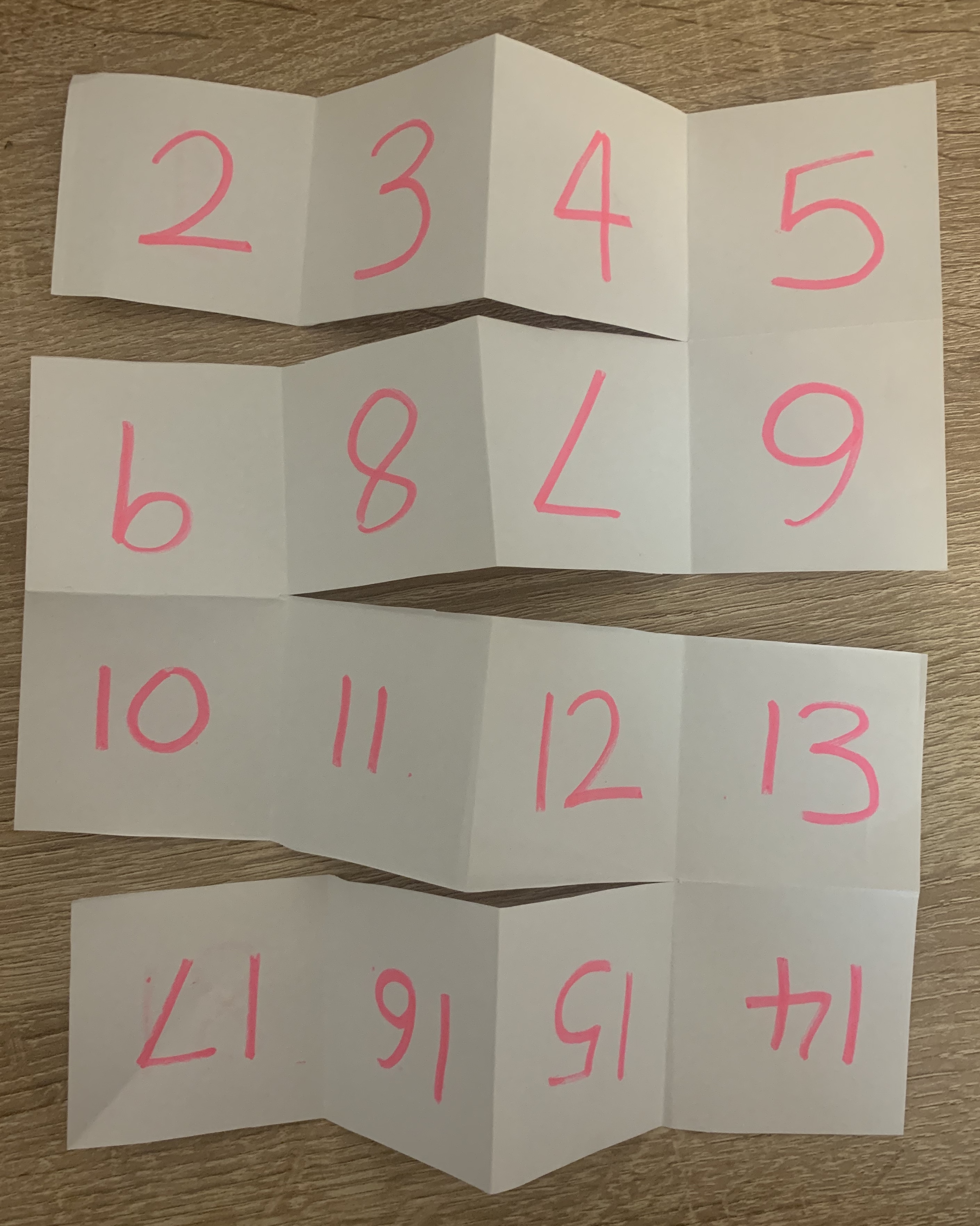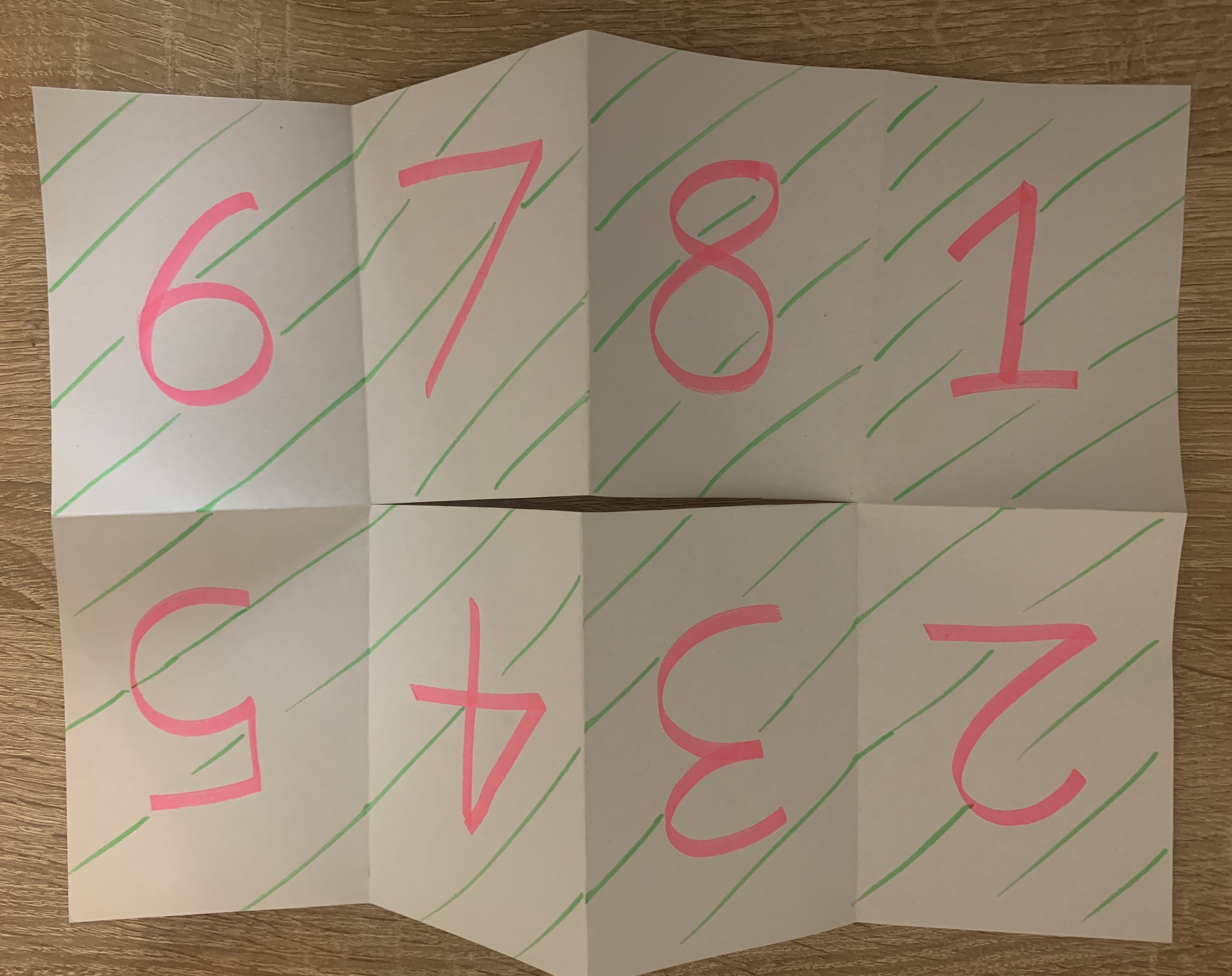 Number each of your sixteen pages from front to back cover. Unpack the document and notice how the relationship of the numbers on the front and back of each sheet. For example, 1 and 16 should be alongside each other, with 2 and 15 on the reverse. These numbers dictate where your content will go, and how this content needs to be printed, and are known as ‘printers pairs’.