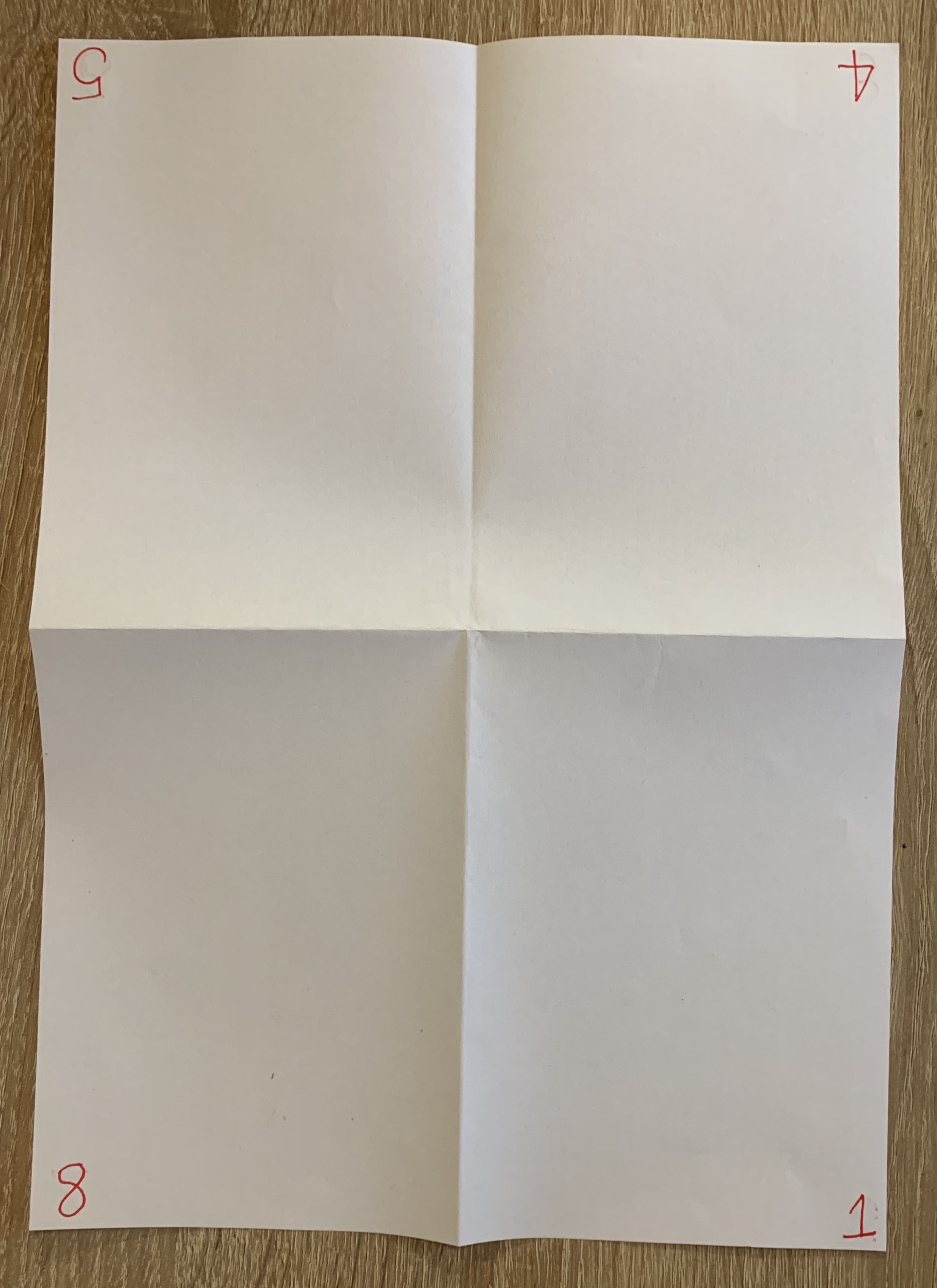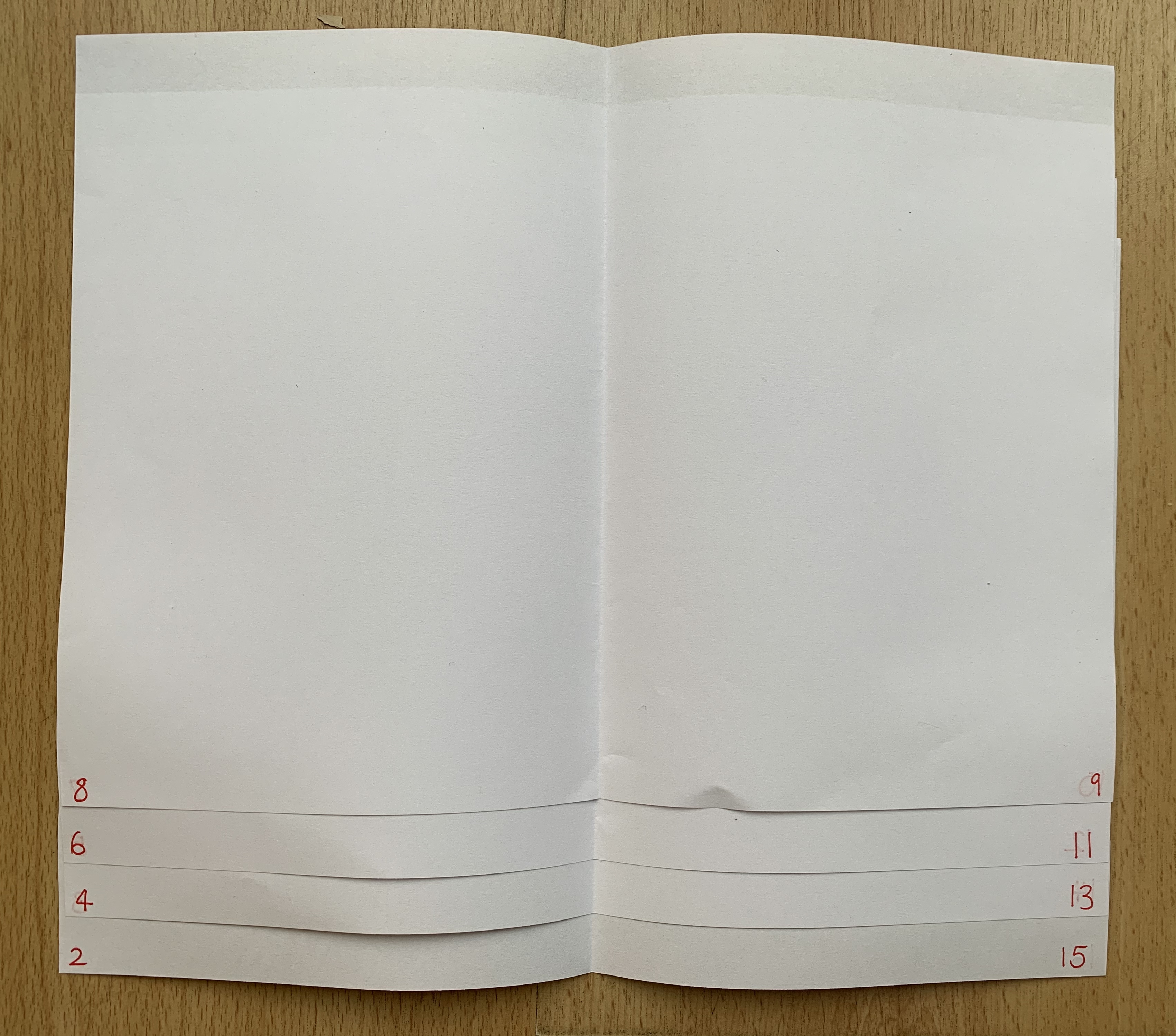 Creating a small mock up: Printers use large sheets of paper to print multiple pages, which are then cut and folded. You’re going to use a simple A4 sheet to recreate the process of imposition and folding into ‘sections’ or signatures at a smaller scale.