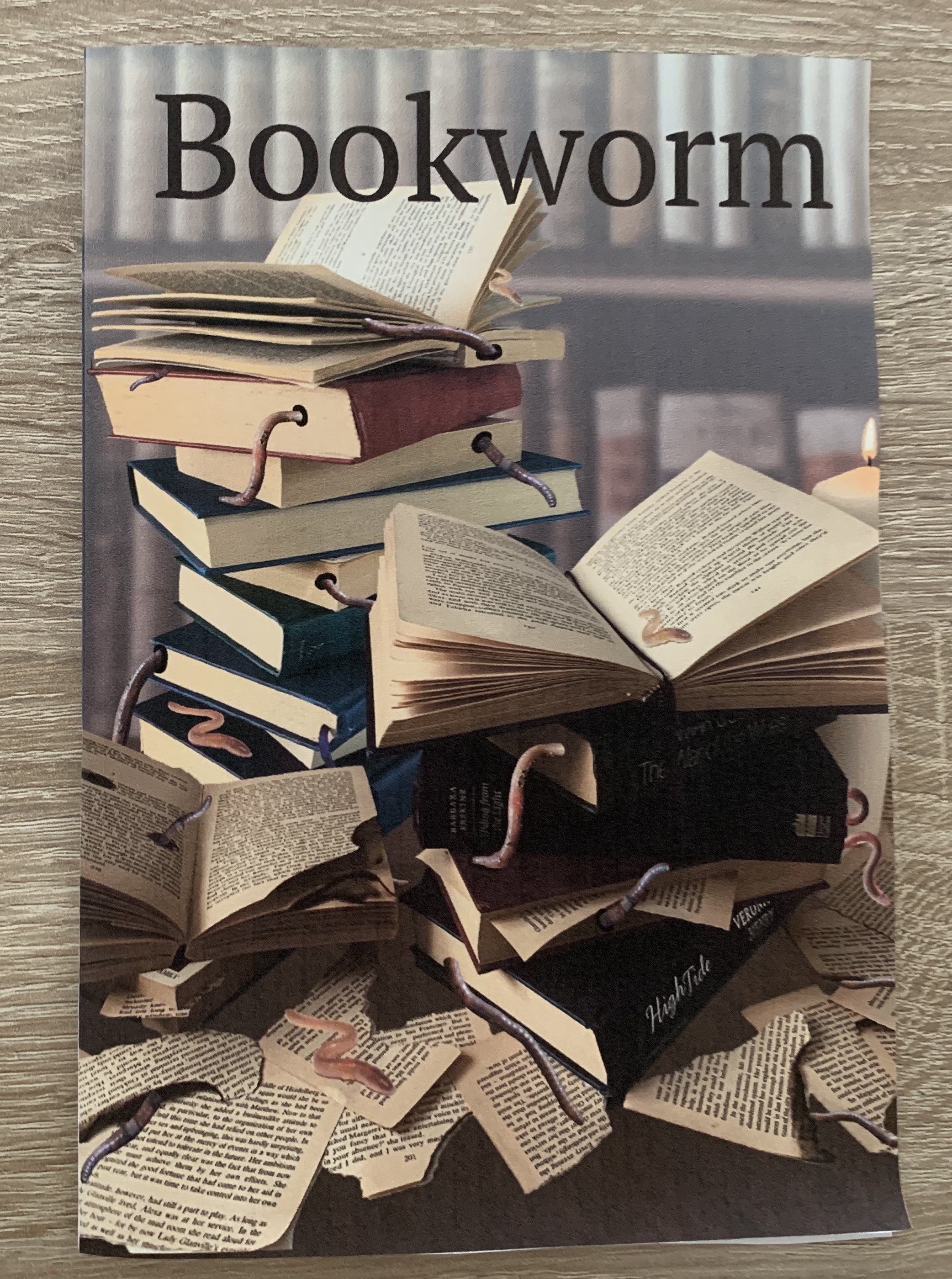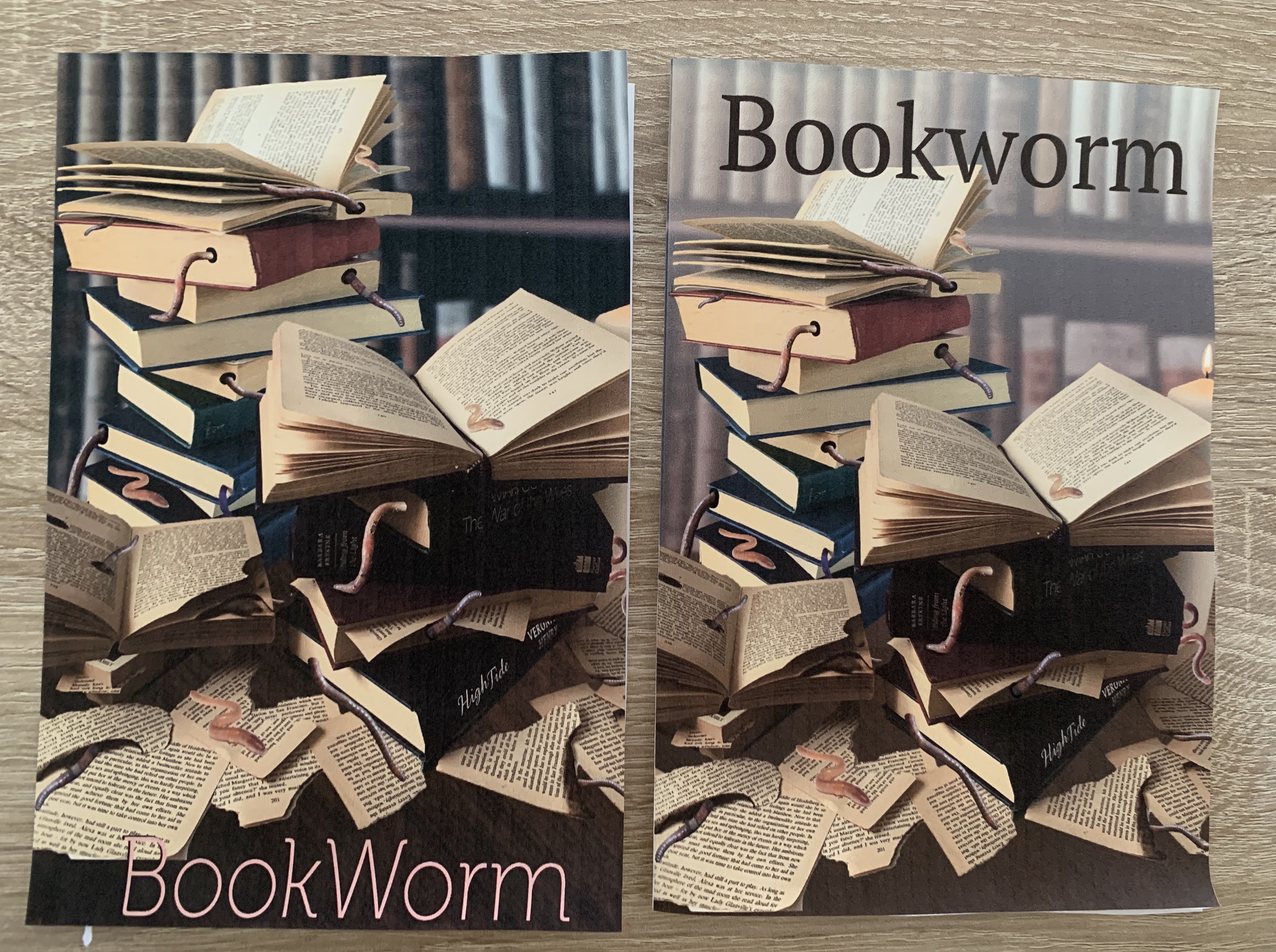 One of my main concerns with this design is that it was a lot darker printed than I wanted, I feel like the main focal point of the stacked books and worms gets lost with the darkness of the background, it all seems to merge together which I find makes it less appealing. However during my design process I had noted that I wanted the image to look as if it was set in an old dimly lit abandoned study, so from that respect I feel it fits my criteria. I have just changed my mind slightly after seeing the design printed off, it really shows the importance of experimenting with mockups.