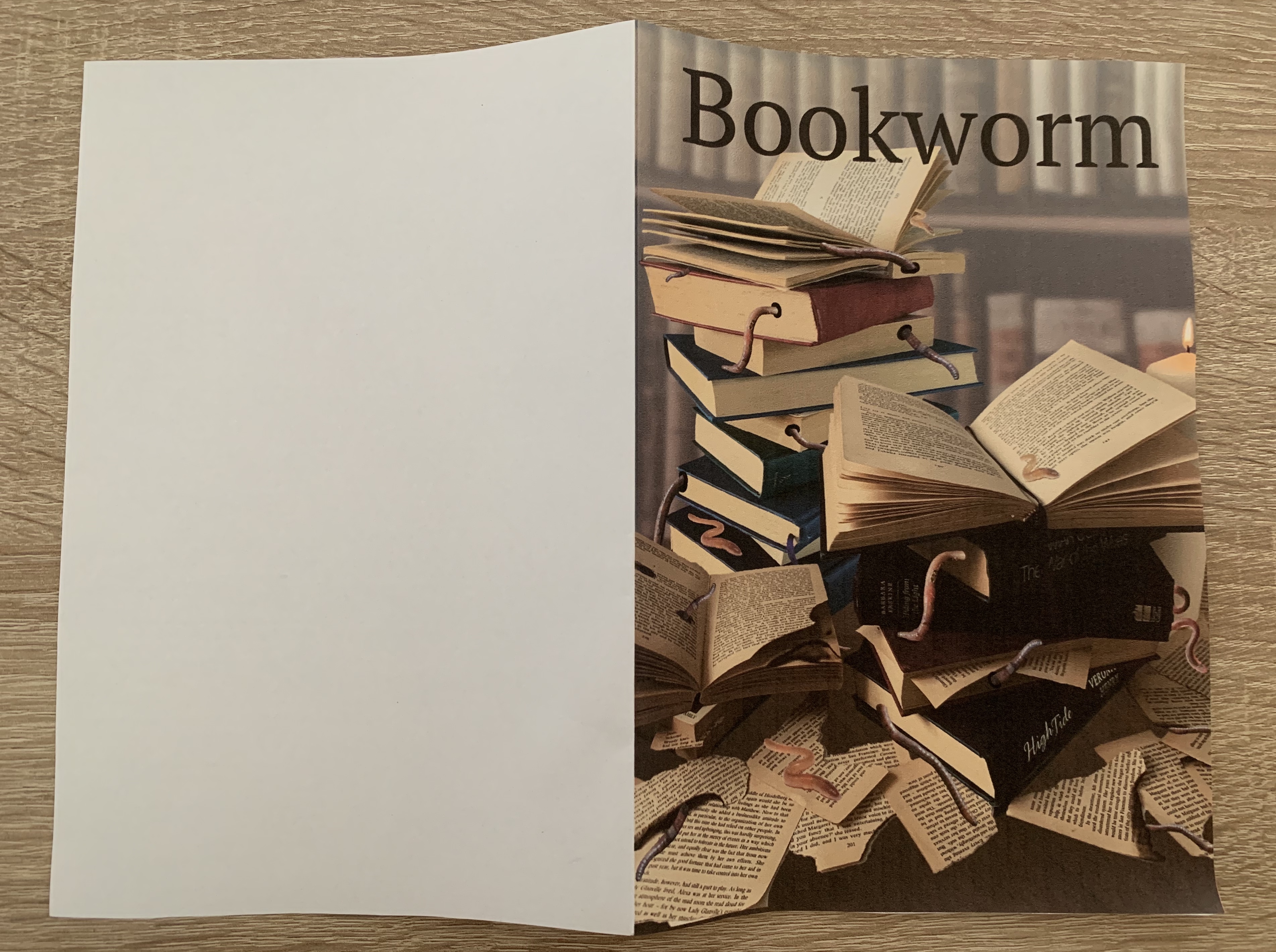 I printed off my new design to see how it looked as a folded mock-up. I felt that by lightening the background it has made a huge difference, the before design looked far too dark and everything seemed to blend together, where as now the focal point is the stacked books and the worms. The font used is also more noticeable.