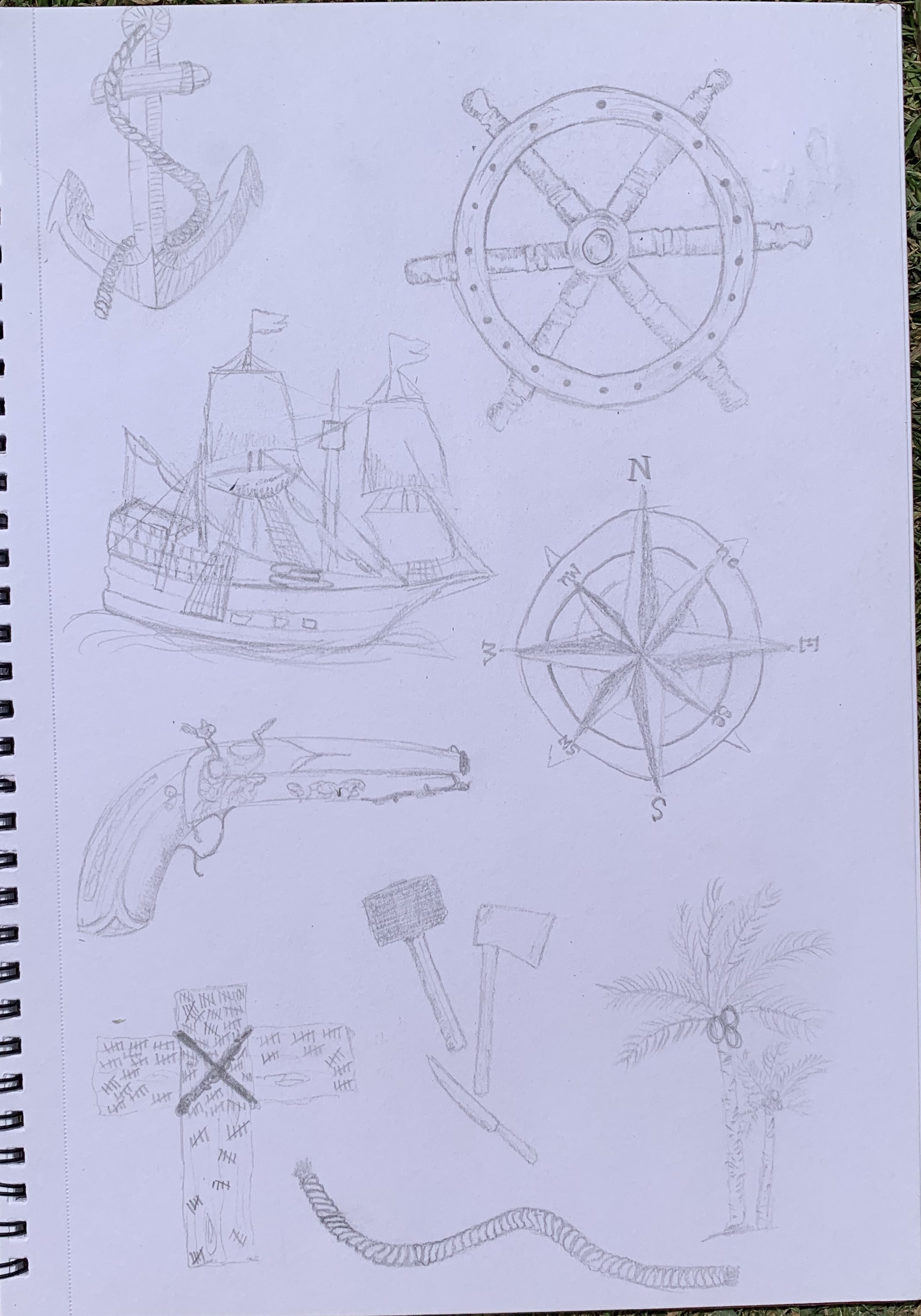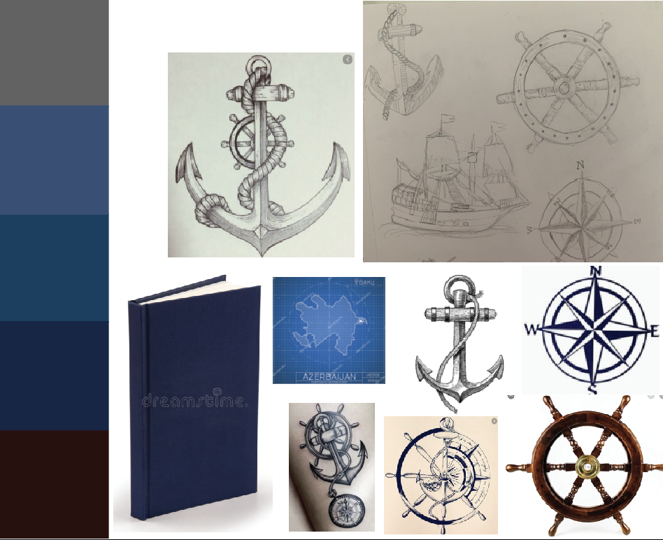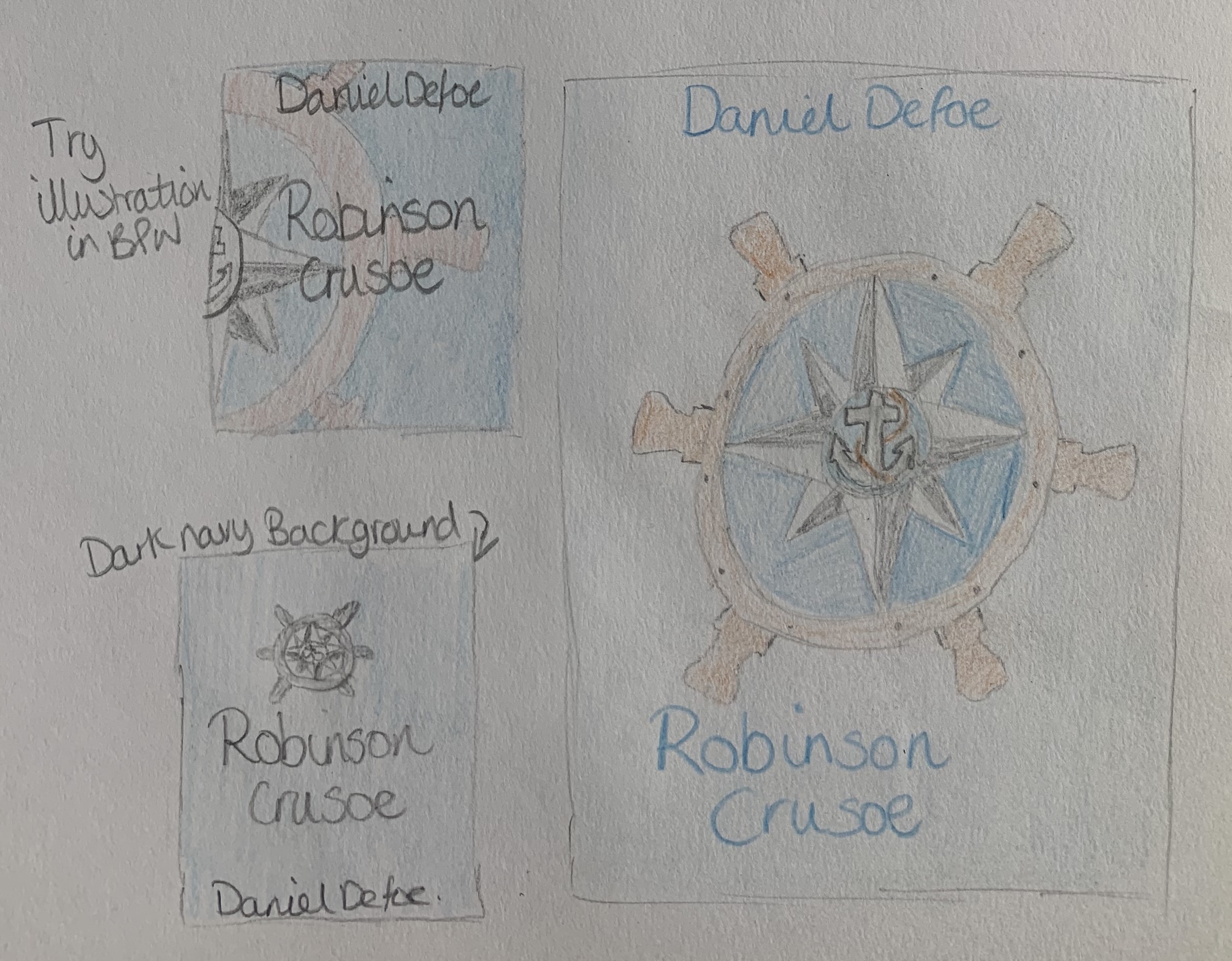 Looking at my sketches of the anchor, wheel and compass I decided to look at combining these three items giving the book a nautical theme focusing on the sailing part of the book, before the ‘disaster struck’. I would like to experiment with this design and the visual dynamics to see which layout works best. This design would also be worth thinking about for the more Deluxe version too.