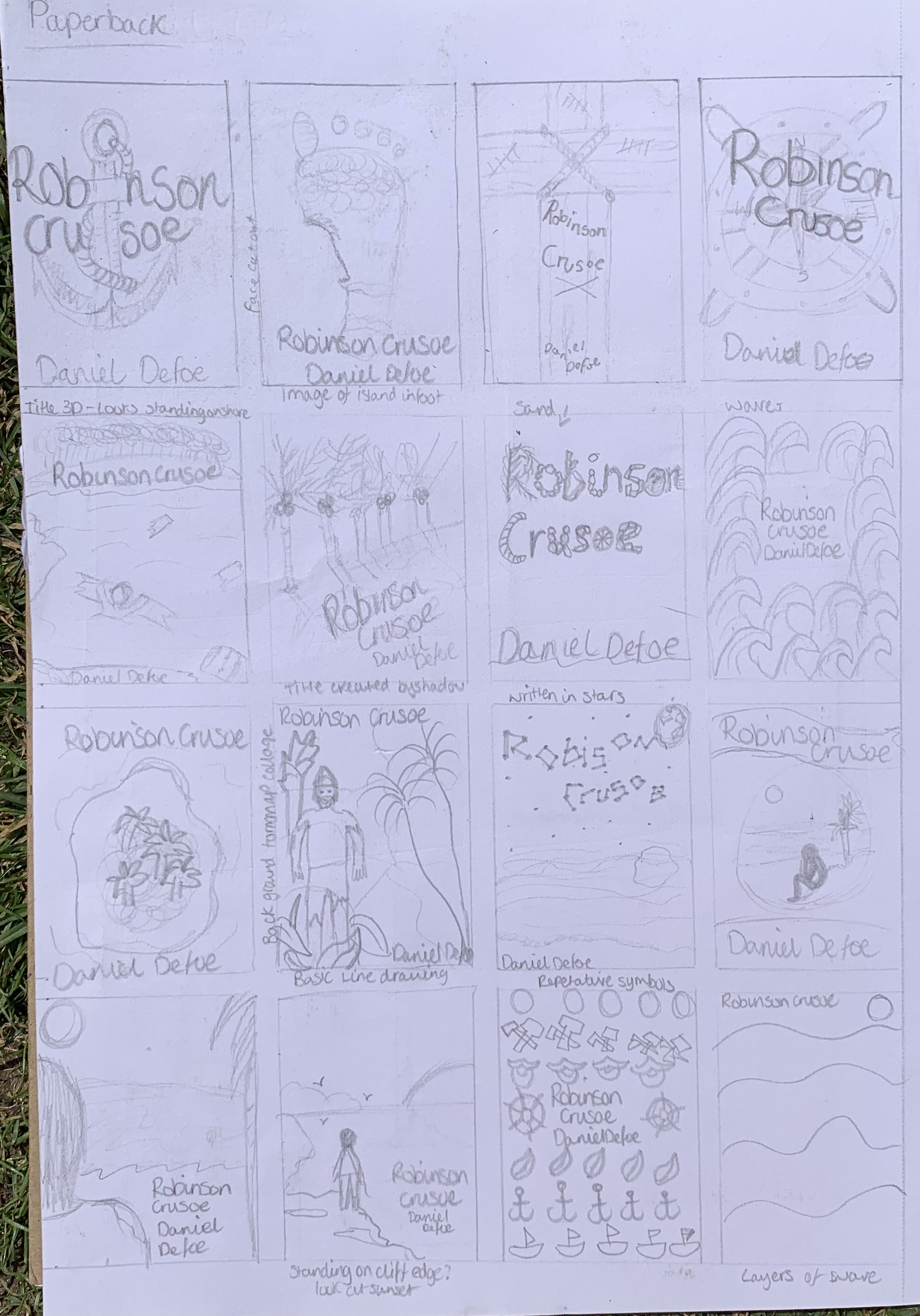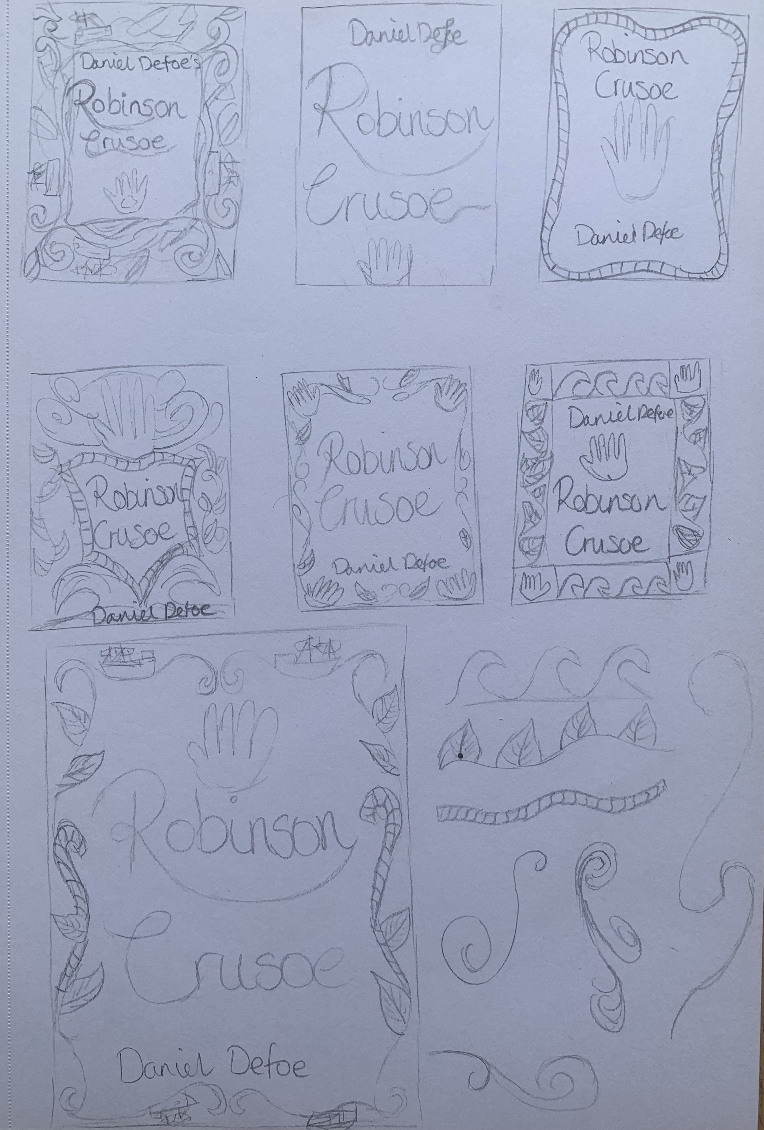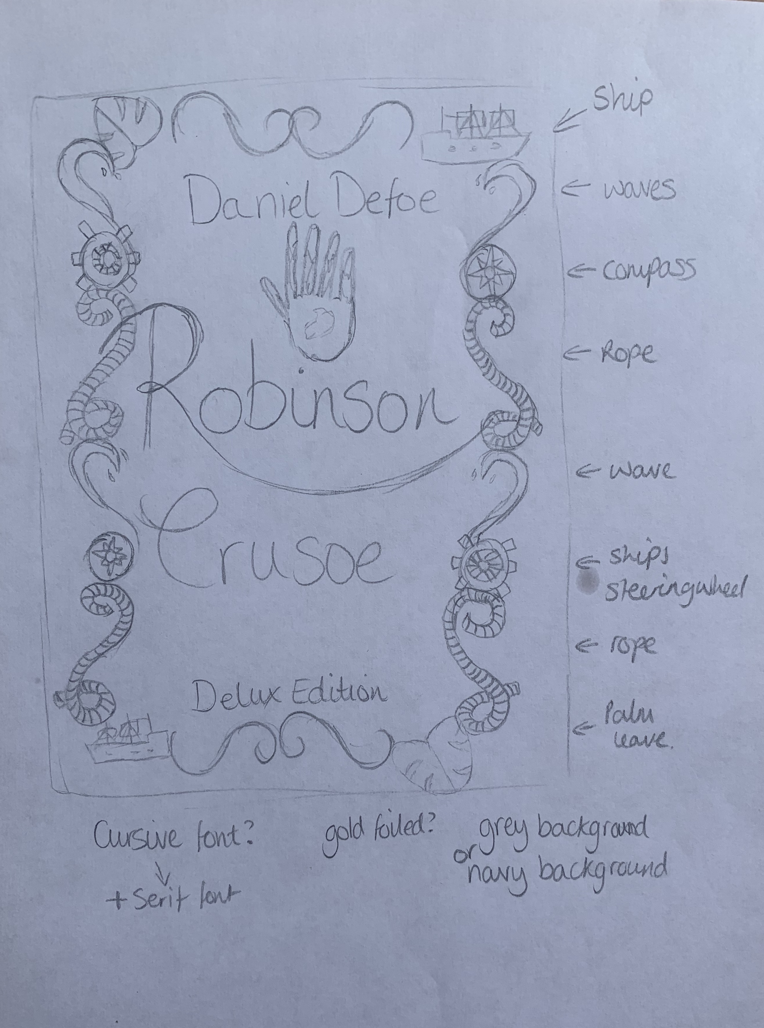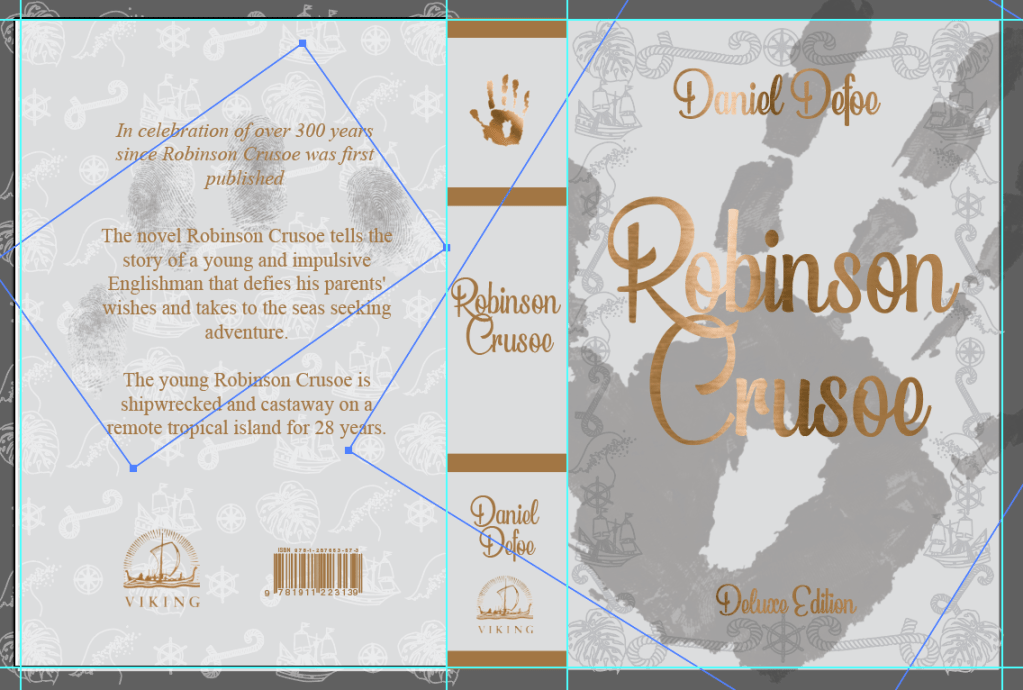 I also reminded myself that the brief had said to create a larger and luxurious cover for Robinson Crusoe. Reflect on the content of the story. Reference the historical nature of the story and the history of the book. This will be seen as a collectors book.