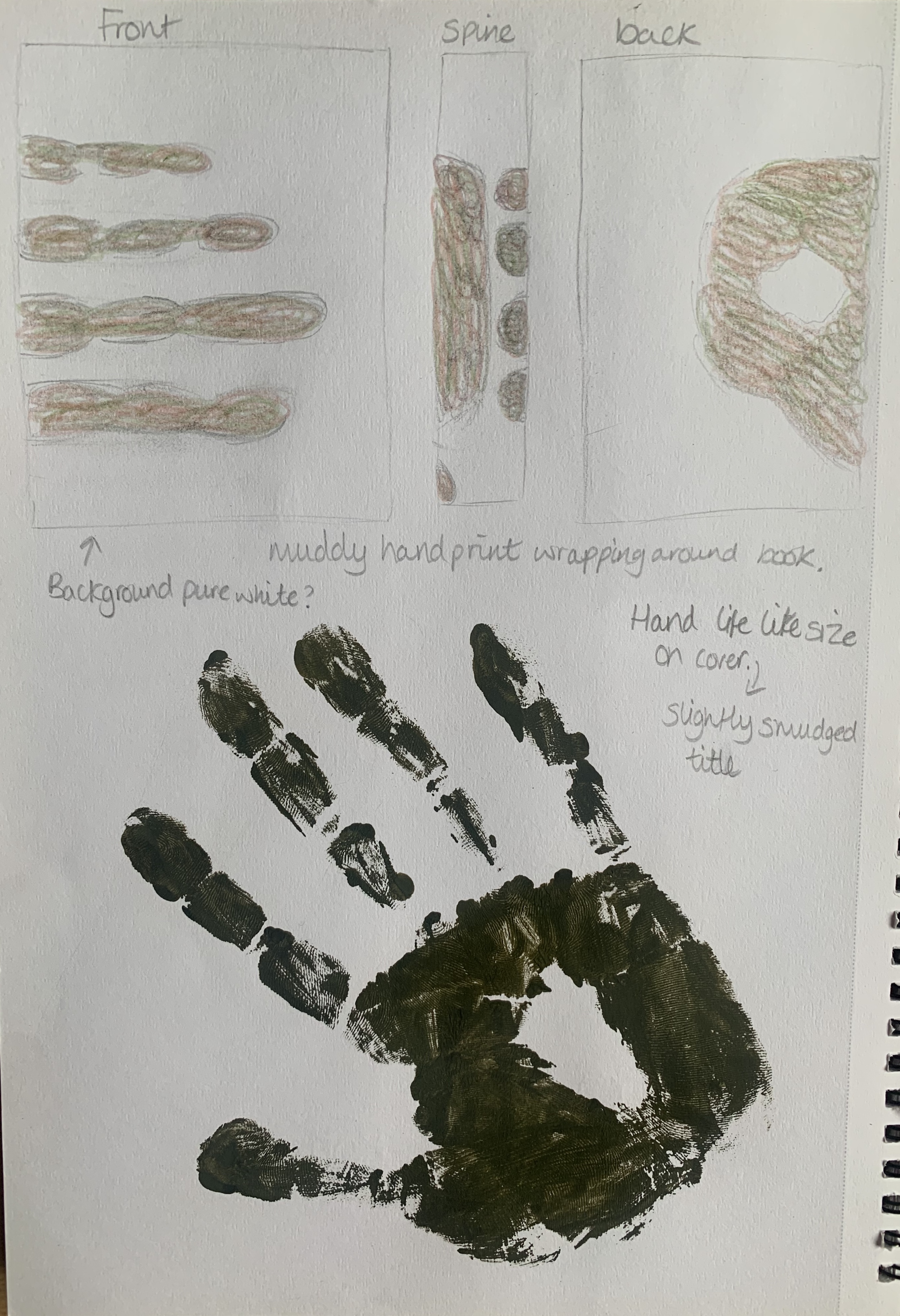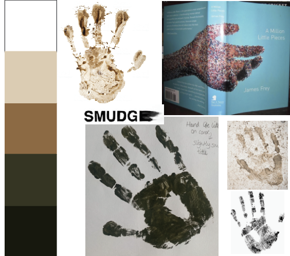 My final design is one which isn’t included in my thumbnail sketch’s, this design came to me whilst creating my mood boards. I like the idea of having a crisp white background with a dirty muddy handprint wrapped around the book, looking like it was held by someone. I then remembered from a previous exercise the cover ‘A Million Little Pieces’ by Rodrigo Corral which I found very interesting. At this moment the handprint design is my favourite.
