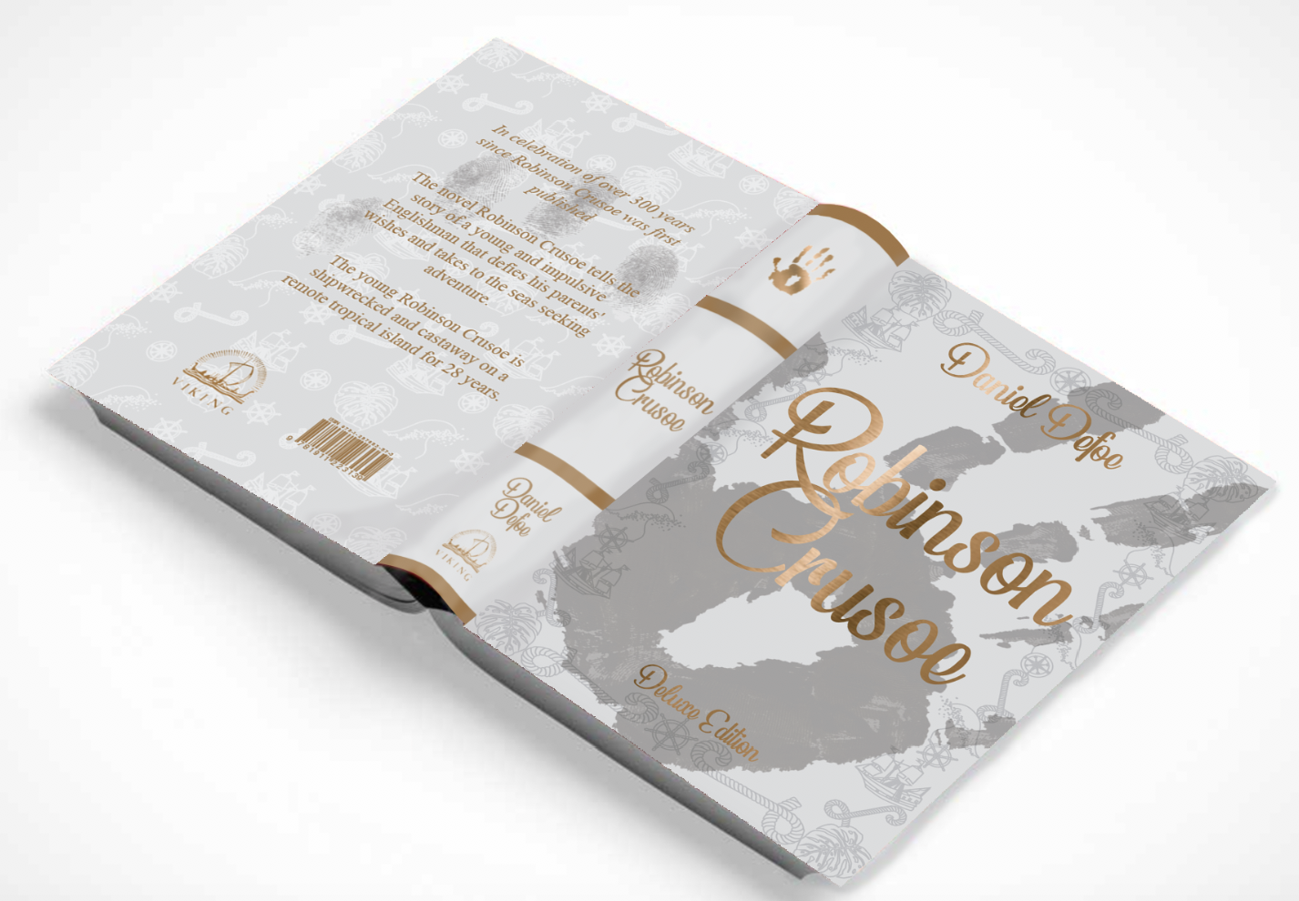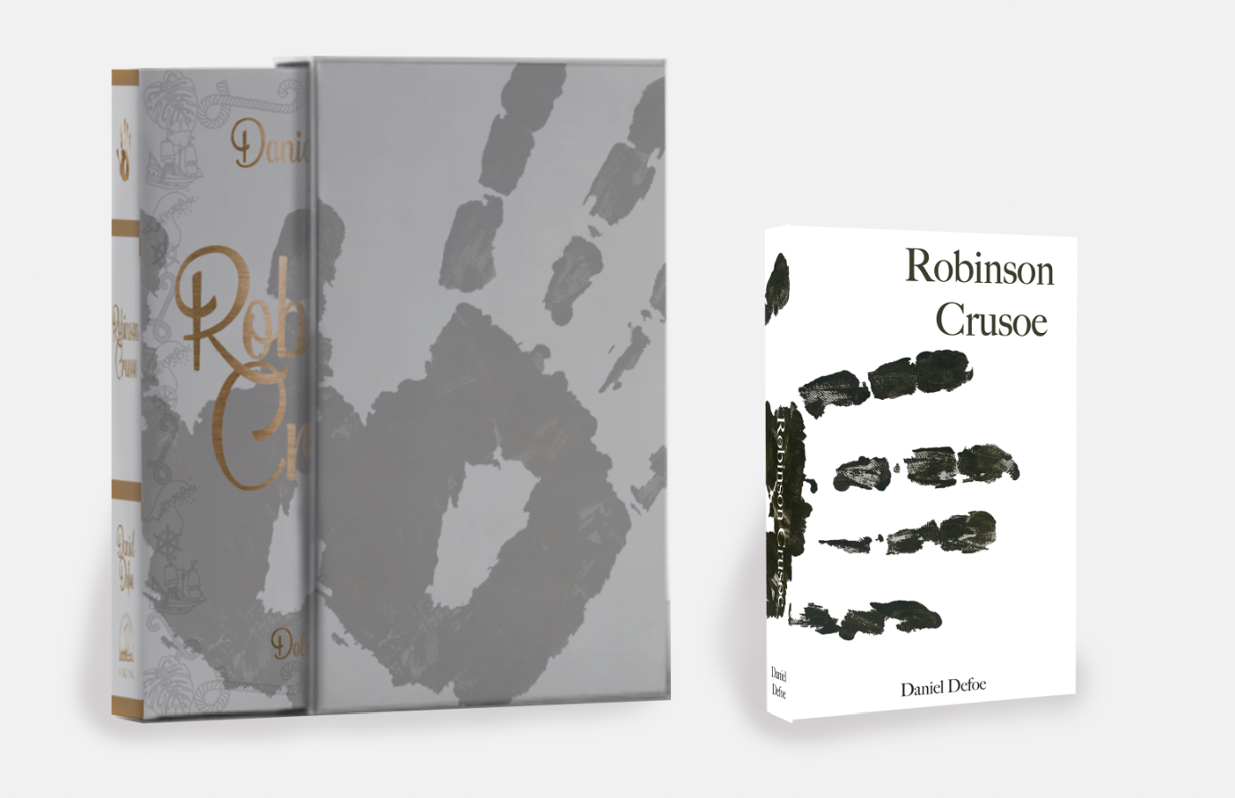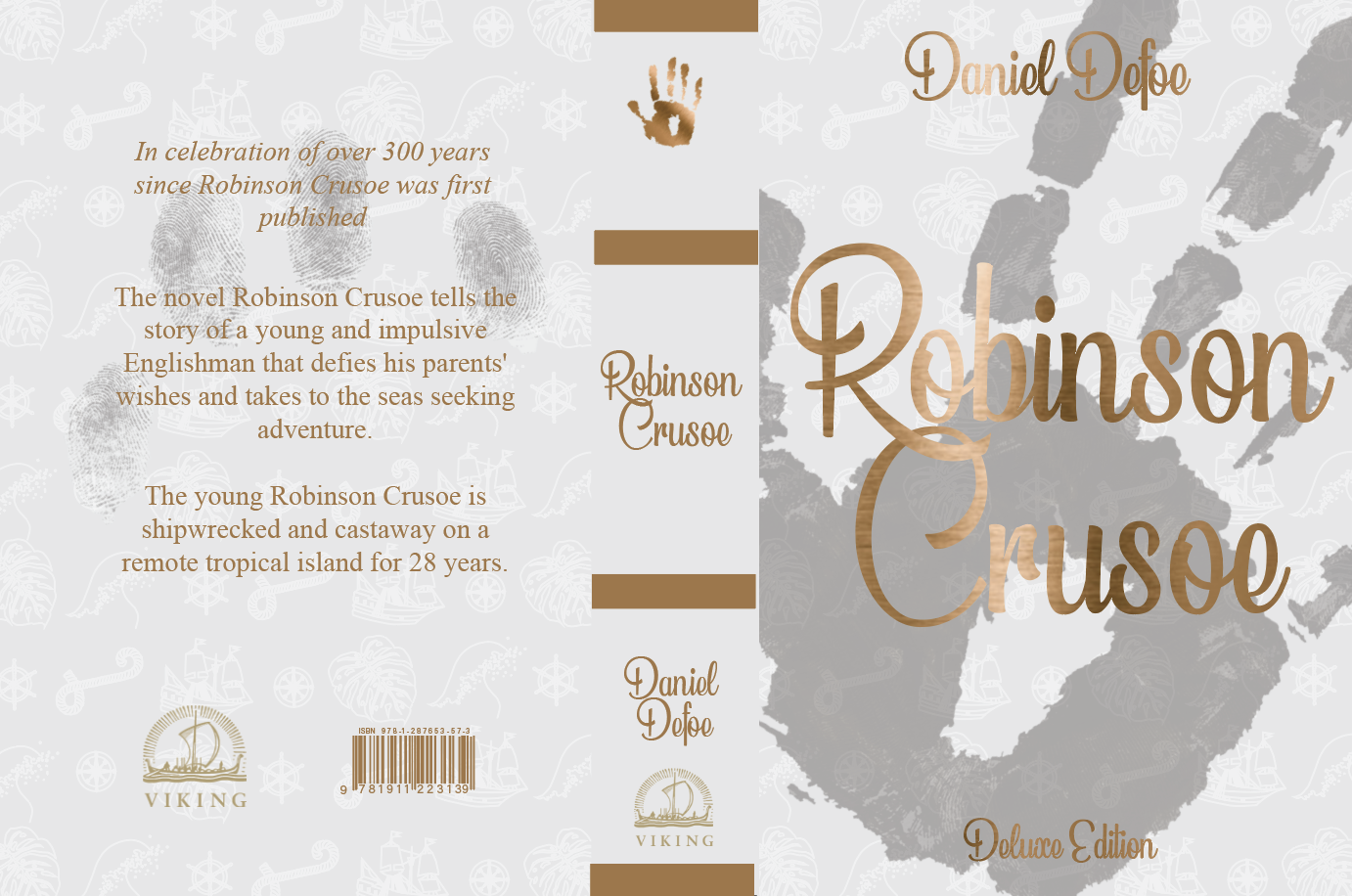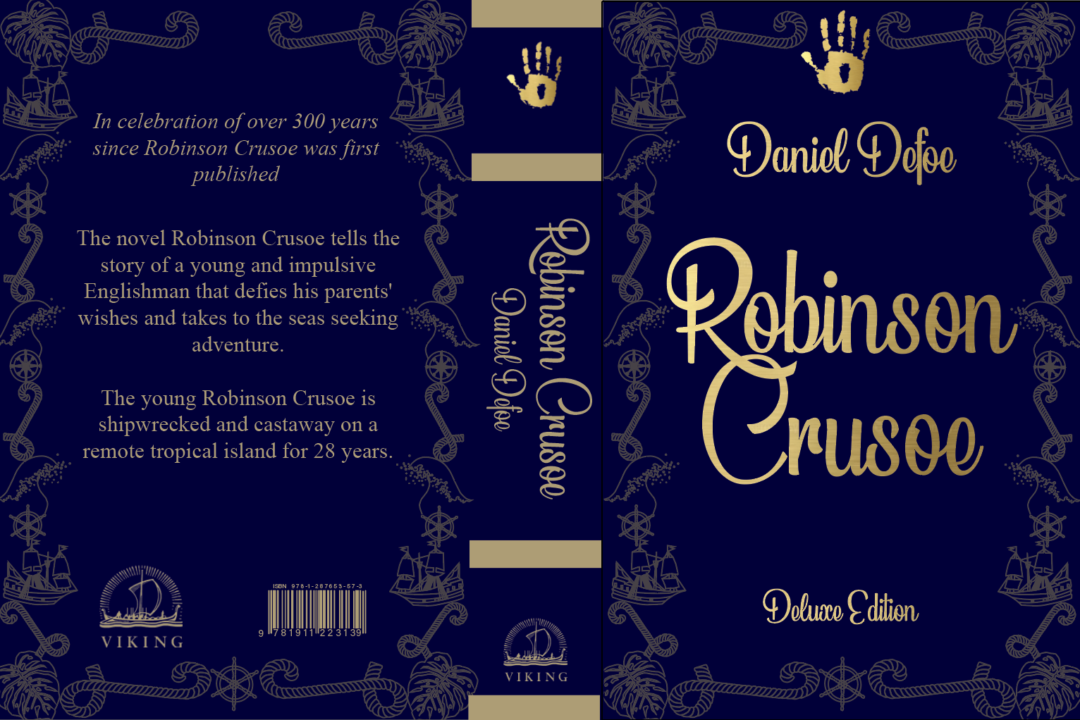 Brief: Design the book format and cover artwork for two different versions of Daniel Defoe’s classic 1719 novel Robinson Crusoe. The publishers, Viking Press, have decided to re-release this title as a new pocket edition for readers on the move that reflects the adventurous nature of the story within a contemporary setting. This paperback version should have a modern visual feel that can compete with new titles in the bookshop. They also want a deluxe edition for armchair readers and classic book collectors that references the historical nature of the story and its associations. Produce book design ideas and cover artwork to reflect the content of the story across both formats and contexts. Be creative and inventive with both the look and format of these books.