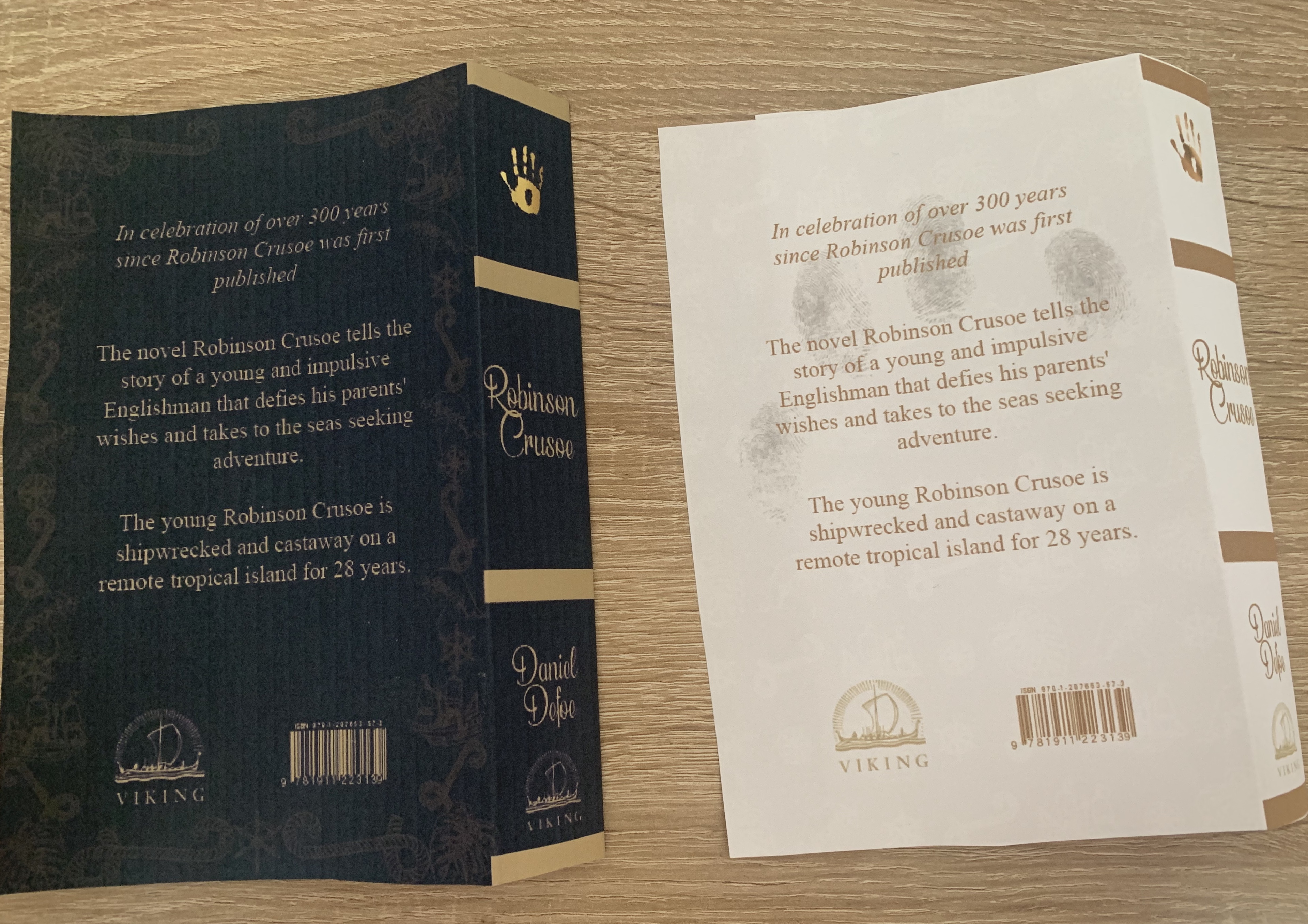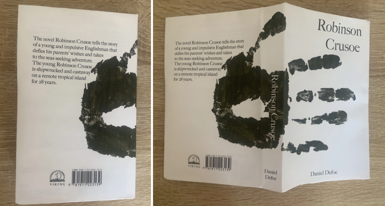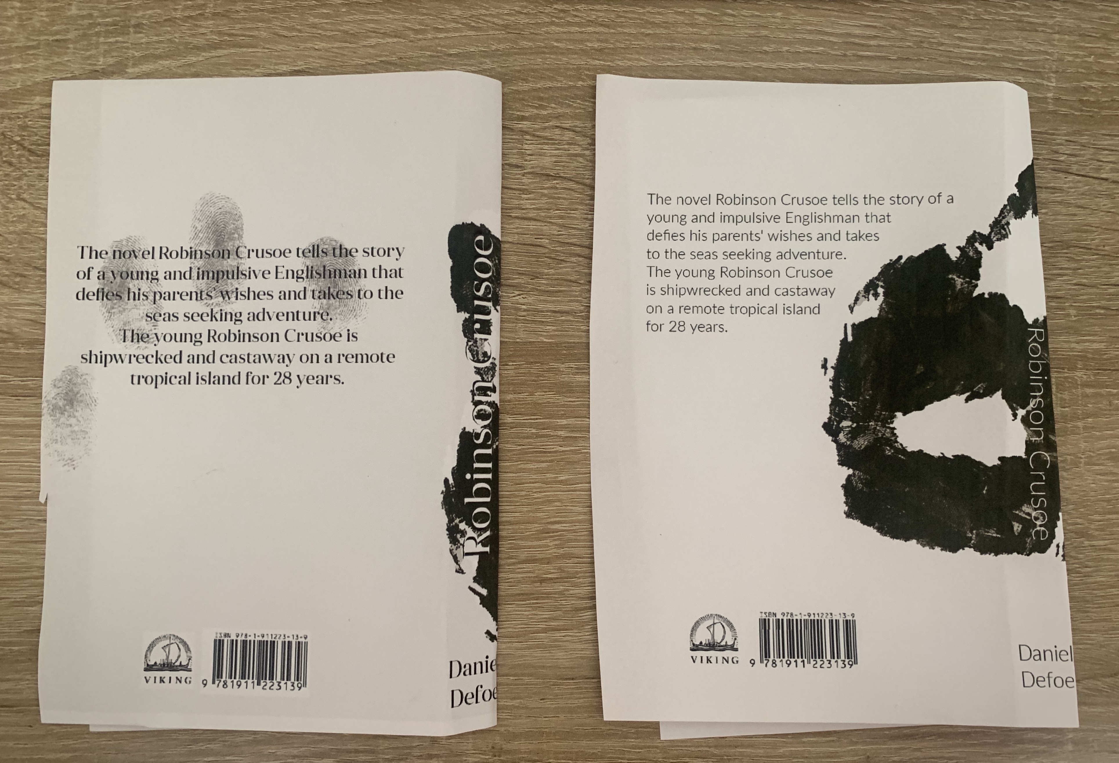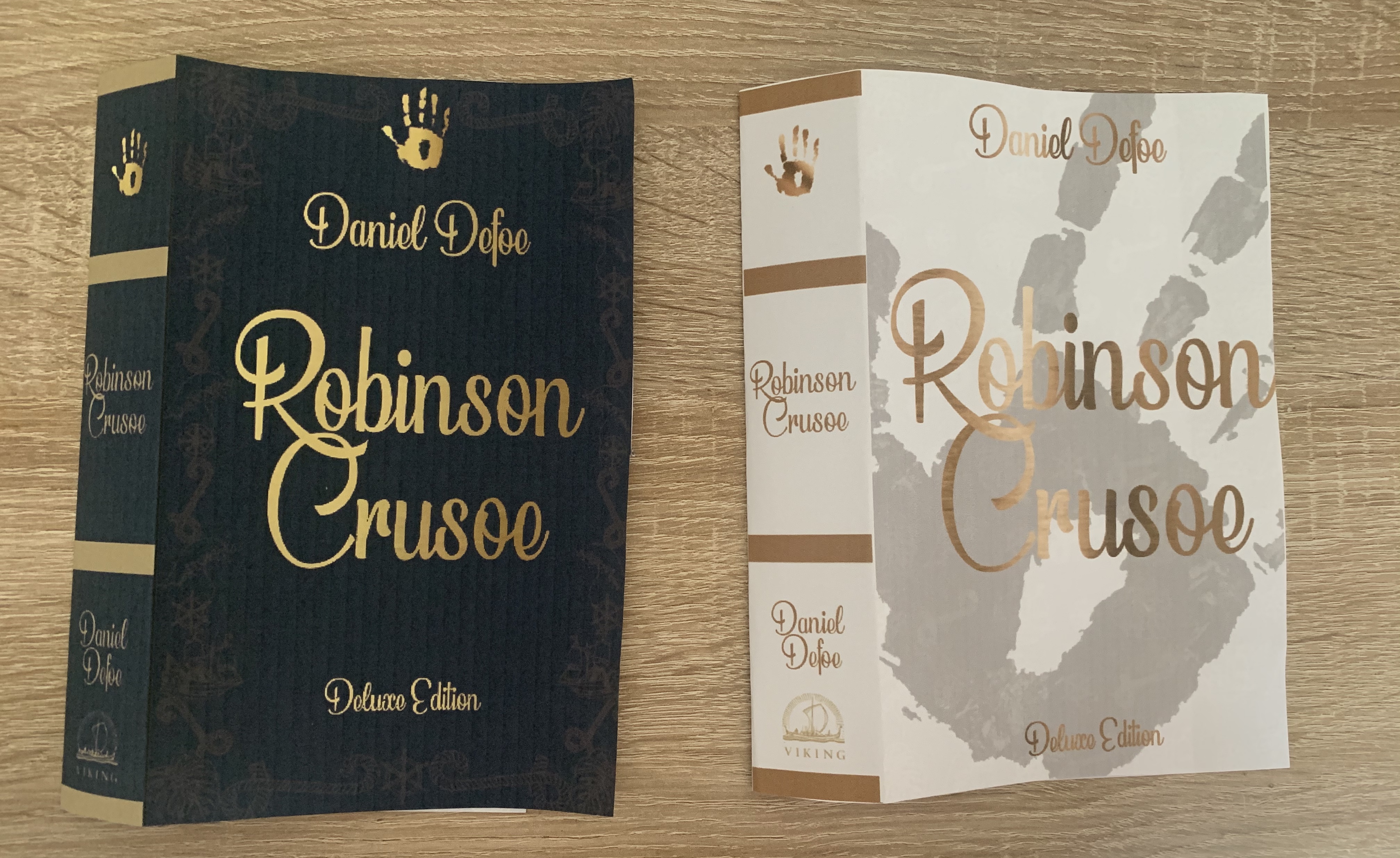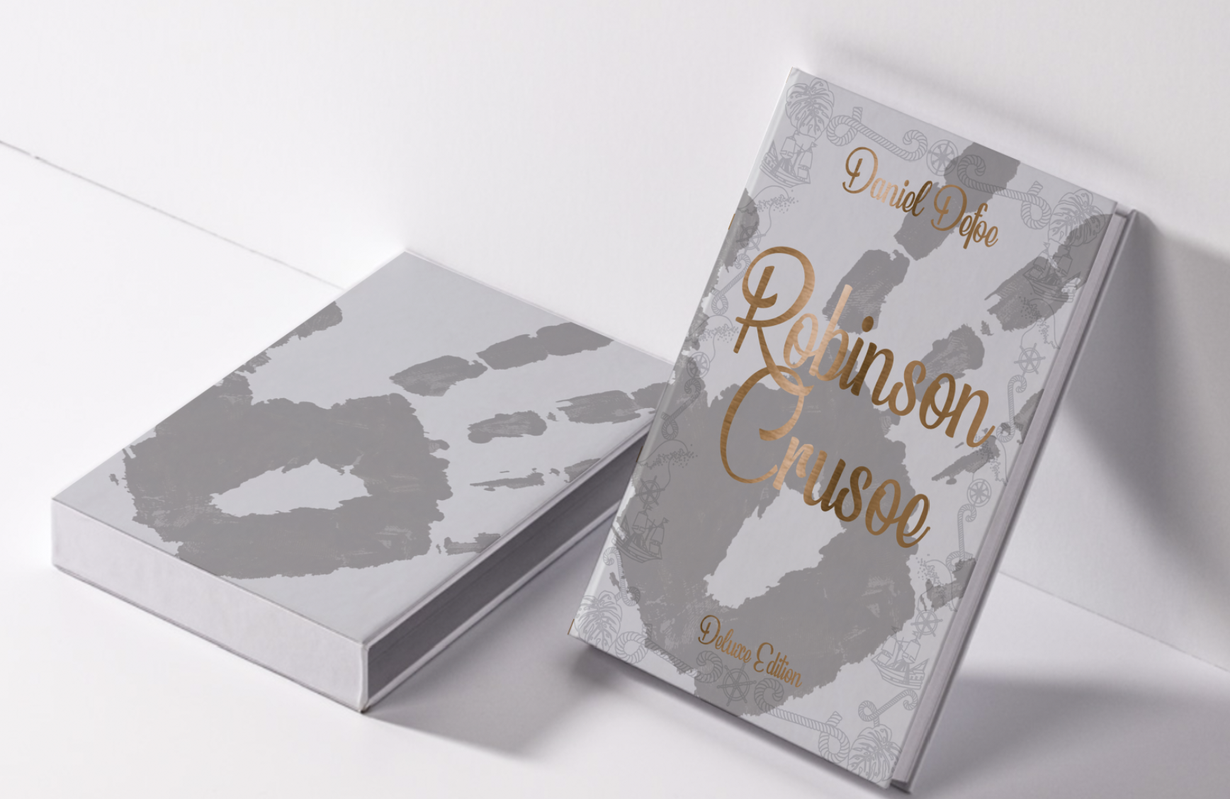 Brief: Design the book format and cover artwork for two different versions of Daniel Defoe’s classic 1719 novel Robinson Crusoe. The publishers, Viking Press, have decided to re-release this title as a new pocket edition for readers on the move that reflects the adventurous nature of the story within a contemporary setting. This paperback version should have a modern visual feel that can compete with new titles in the bookshop. They also want a deluxe edition for armchair readers and classic book collectors that references the historical nature of the story and its associations. Produce book design ideas and cover artwork to reflect the content of the story across both formats and contexts. Be creative and inventive with both the look and format of these books.