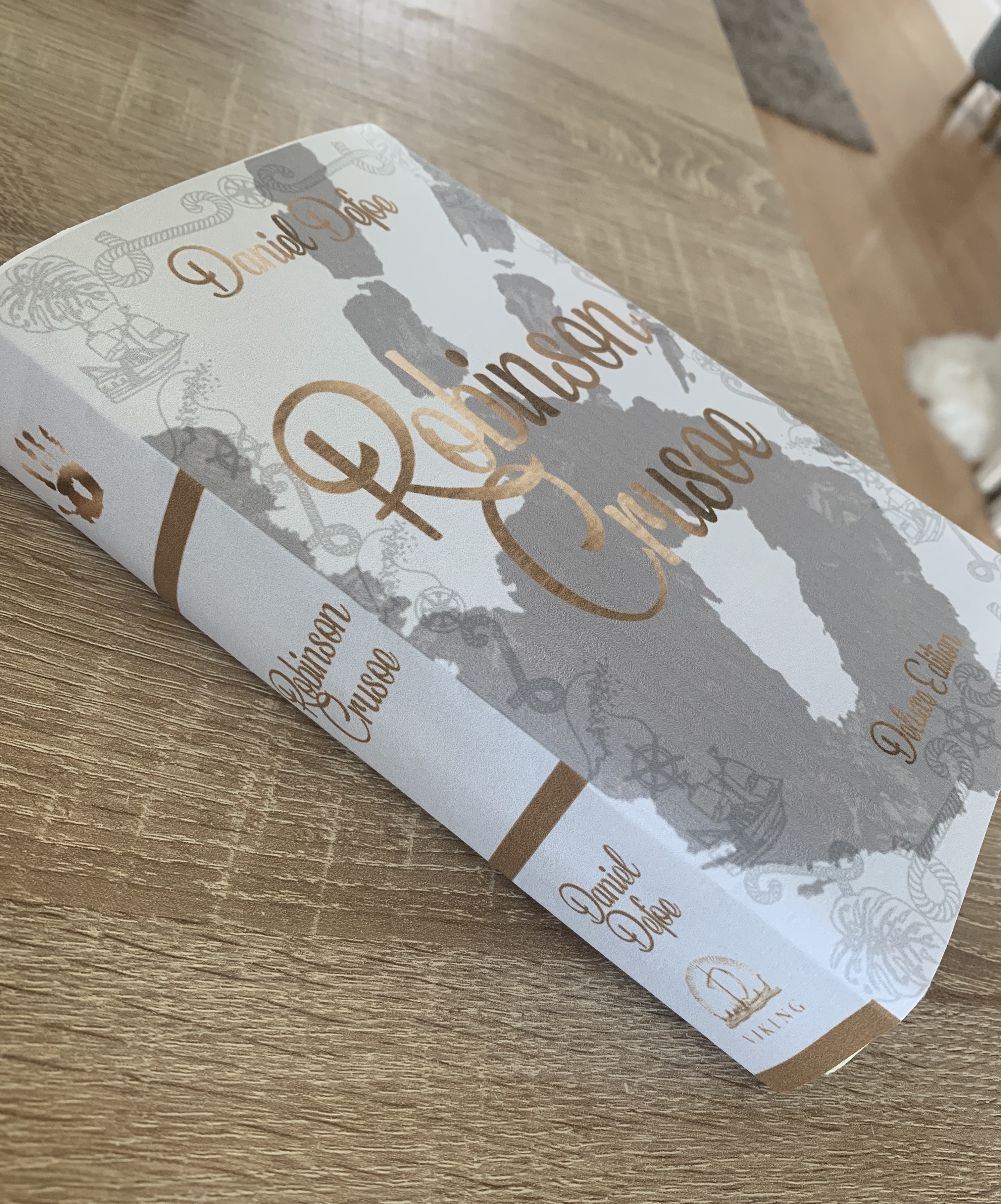 This clothbound edition has a foil stamped design making this more of a Deluxe edition. The design doesn’t really explain what the books about, to me this looks like different stages of the moon perhaps? Which could represent the passing of time Robinson spent on the island. Thinking back to previous exercises, the pattern used is very much Coralie’s style with the use of repetitive pattern and clear typography.