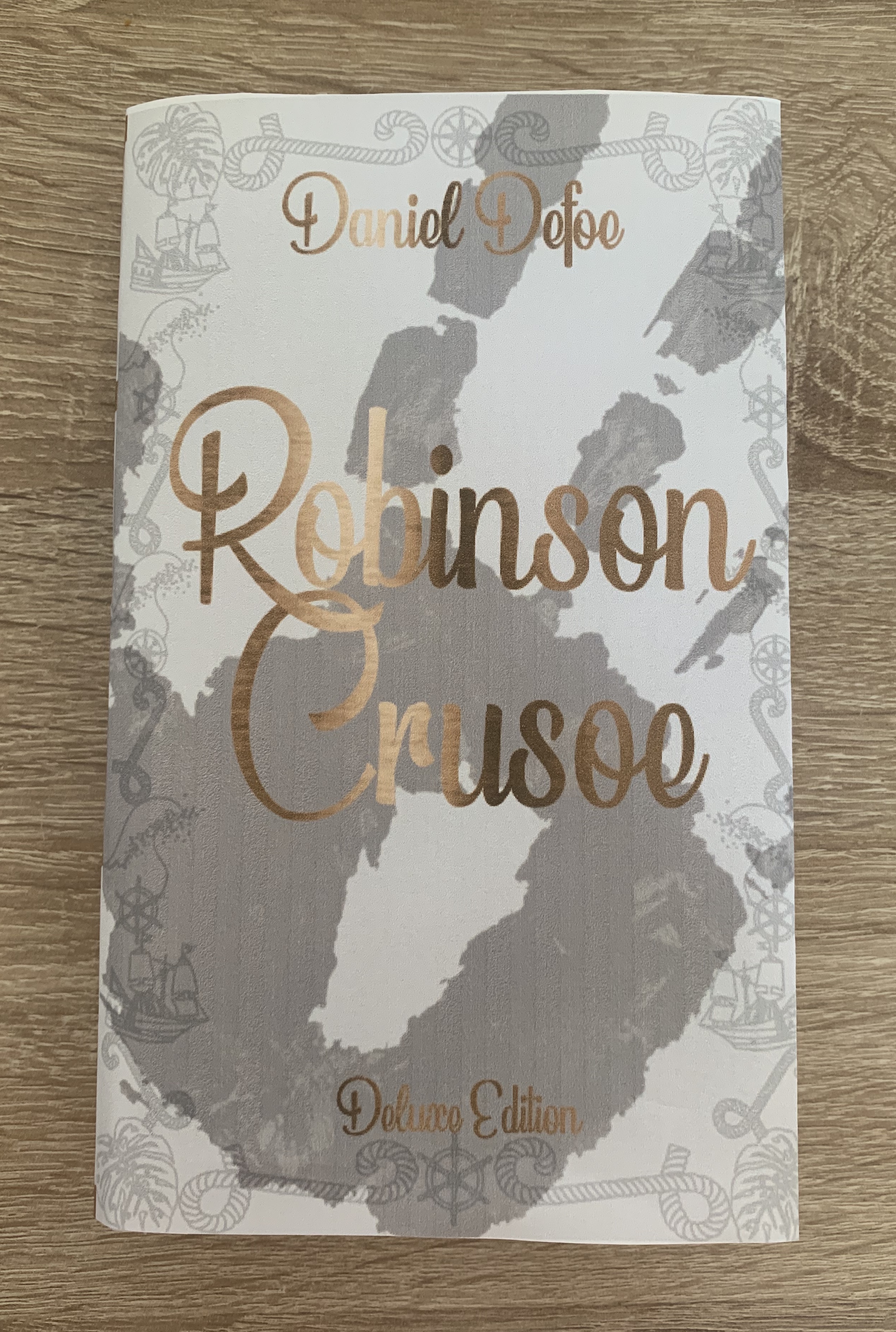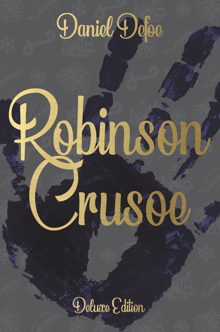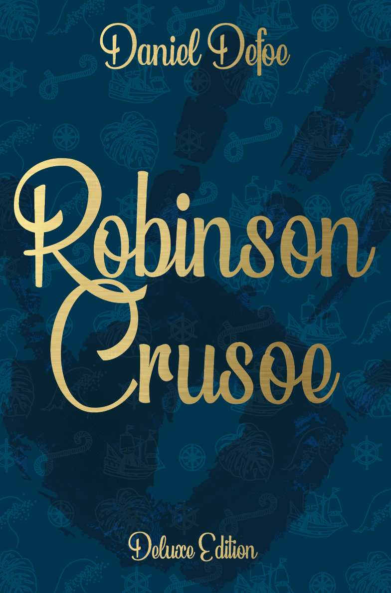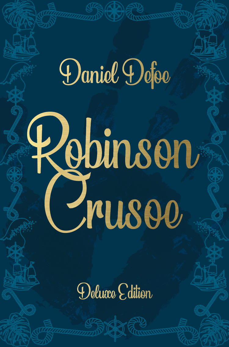 Part 2 Deluxe edition: Design a deluxe hardback collectors’ version of Daniel Defoe’s Robinson Crusoe, it should reflect the historical themes of the story and its associations. This version can present the content in a larger, finer, more luxurious way, suitable for armchair readers and classic book collections.