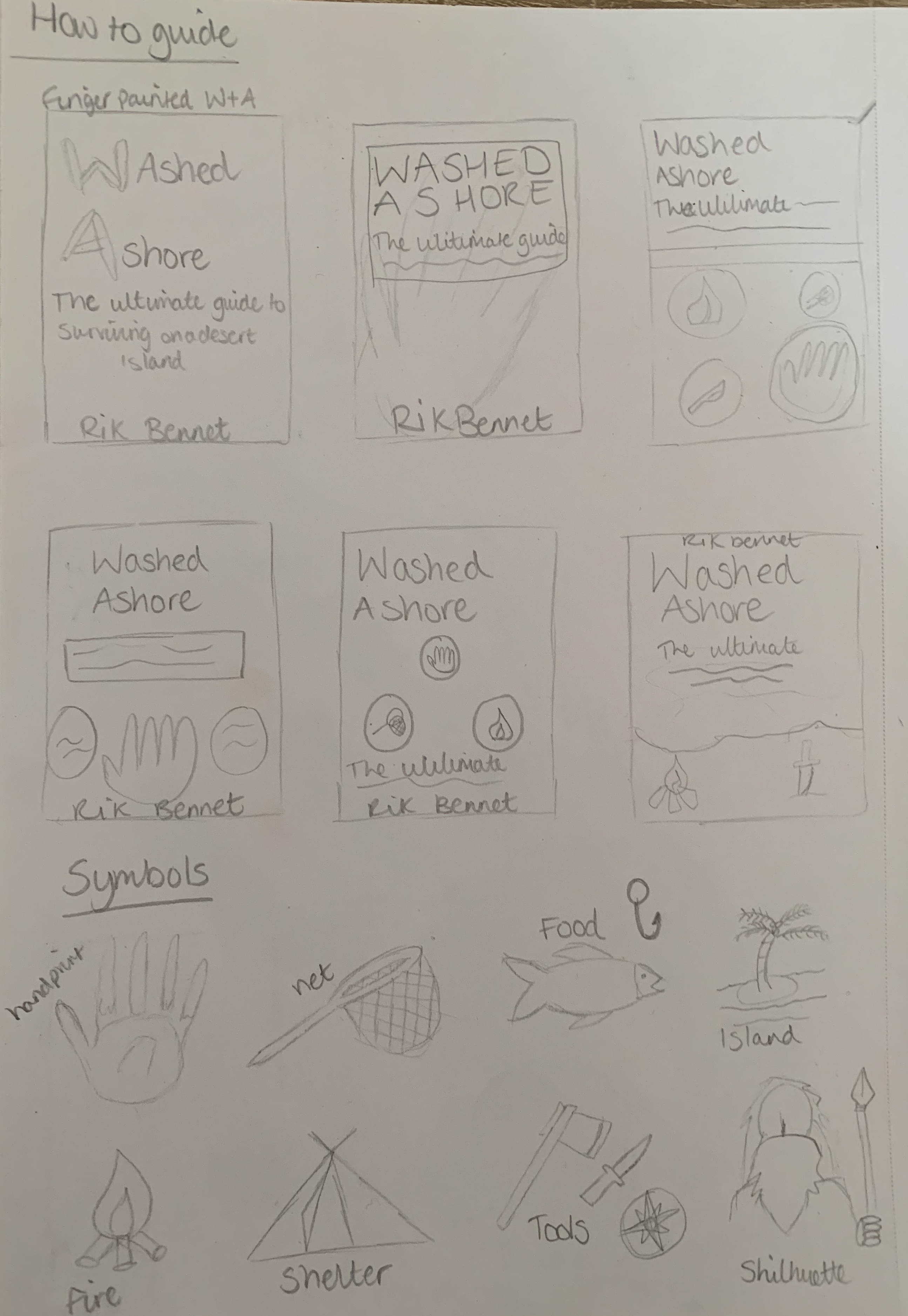 I created a few variations of the washed ashore cover following my sketches and with the key motifs in mind. Its fortunate that the main design feature of both my Robinson Crusoe design is the handprint which again works well for this genre. As you can see from the beach designs I lost myself slightly as they seem more fitting for a book rather than a guide, but by creating a few of the icons its helped achieve a more informative cover suitable for the guide genre.