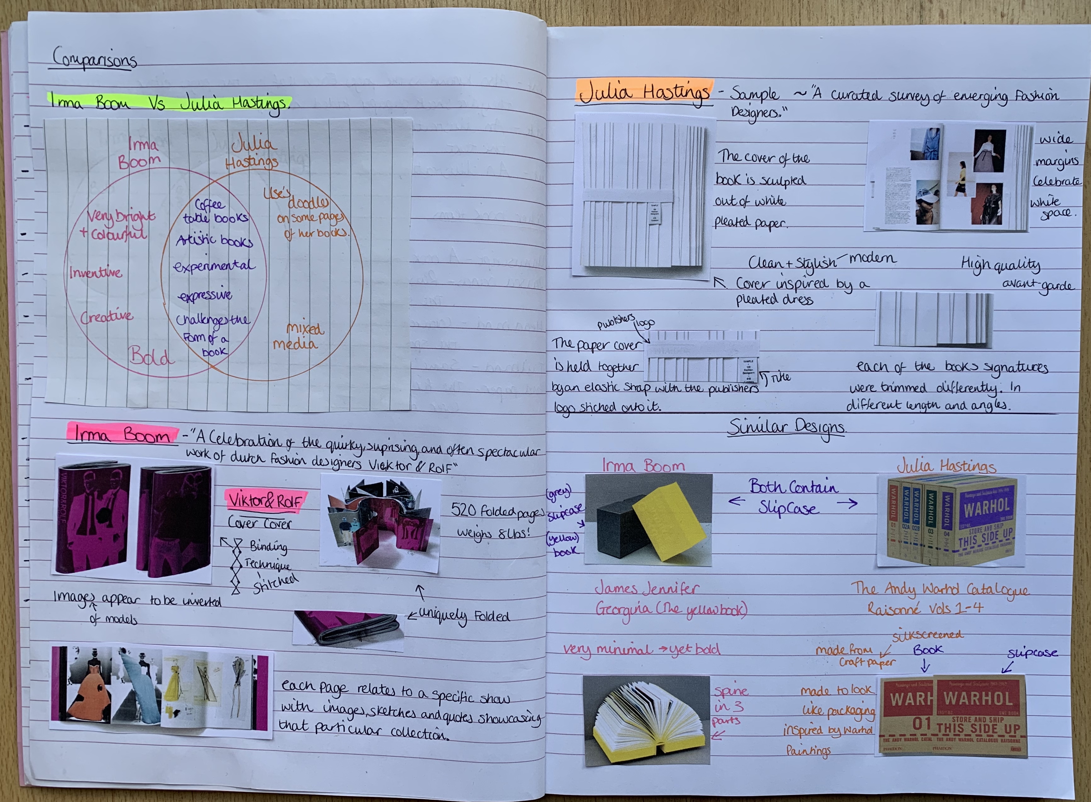 Although I am mainly focusing on Irma Boom’s ‘Viktor & Rolf Cover Cover’ and Julia Hasting’s ‘Sample’ I also found 2 more designs which I felt had slight similarities from both designers; these are ‘James Jennifer Georgina (the yellow book)’ by Irma Boom and ‘The Andy Warhol Catalogue Raisonne Vols 1-4 by Julia Hasting. It was interesting to see that both designers used slipcases which aren’t very common.