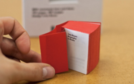 Irma Boom: The Architecture of the Book – 2013. This miniature book contains a complete overview of Irma Boom’s work in reverse chronological order from 2013-1986. The cardboard surround acts as a holder for the tiny red book with the dimensions of 5x4cm! Although this is not completely unusual for Irma, she often creates miniature models of books to present to clients to test ideas. Irma has said that ‘Creating models helps to oversee in a less confronting way how image and text is disrupted’. Upon first glance, it isn’t clear what the book actually contains. It wasn’t until researching I discovered that it is in fact a catalogue of her work. Irma has been creative in the way she created a surround/holder for the book, this makes it less likely to loose the book.