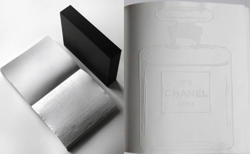 Chanel Limited Edition by Irma Boom – 2013. Totally unique, this book consists of white pages embossed to reveal patterns and images, this book contains absolutely NO ink! The book is the story of Chanel No.5 which, as the first synthetic fragrance in a radically simple bottle, was considered avant-garde in its time. Because perfume is impossible to see once applied, Irma Boom said, “I wanted to make a book with content not printed.” The text and images are embossed on soft paper, it is surprisingly readable. However It only works in its physical form, as a PDF would be include white pages.