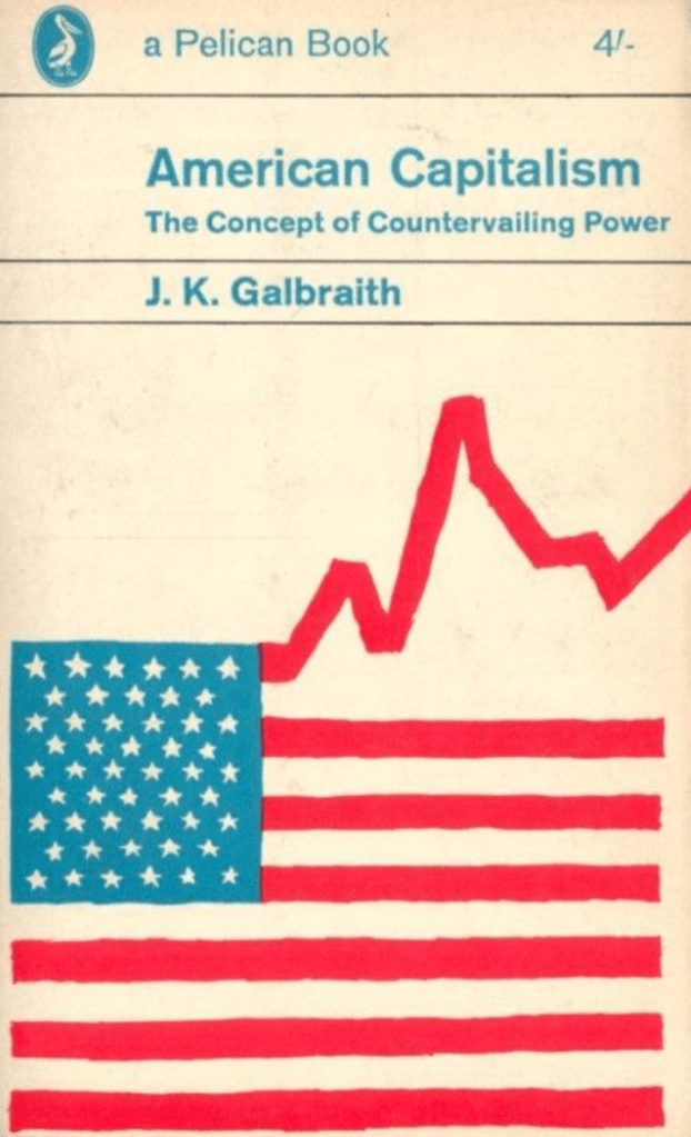American Capitalism by JK Galbraith – 1963 – Pelican. American Capitalism contains a critique of the view that markets, left to their own devices, will provide socially optimal solutions. The cover to this book is very clear about what the contents are about, Birdsall has created the cover in an expressive way which makes it easy for the reader to know what to expect.