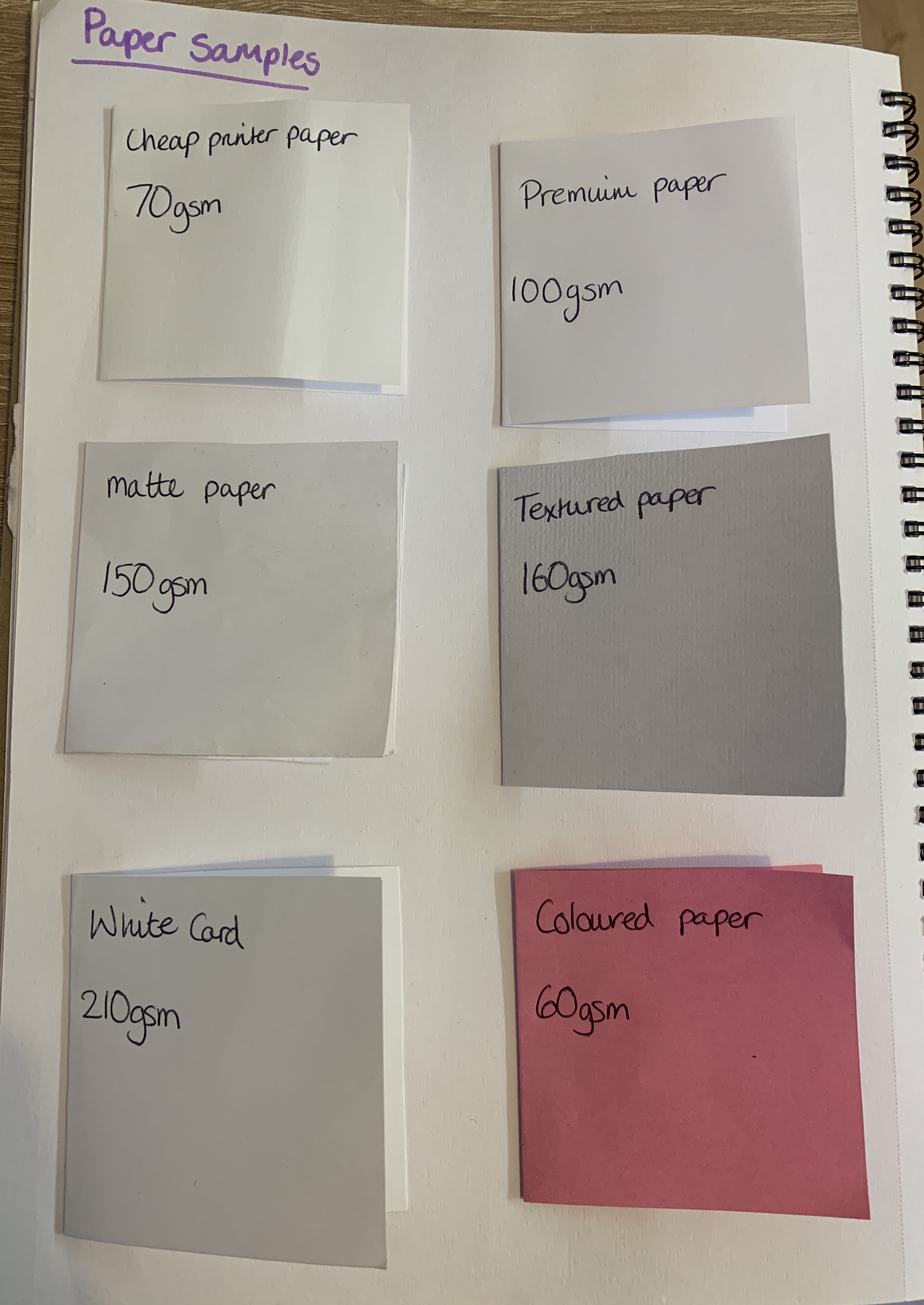 It was useful to look at the papers that I had in the house and to add these notes in my sketchbook, this may come in useful in the future when printing things to achieve the best quality depending on the task. Im glad I requested the two sample books from existing companies, this is a useful tool to see and feel the paper in person and to compare different paper types/weights. Im sure these guides will come in useful for the duration of this course!