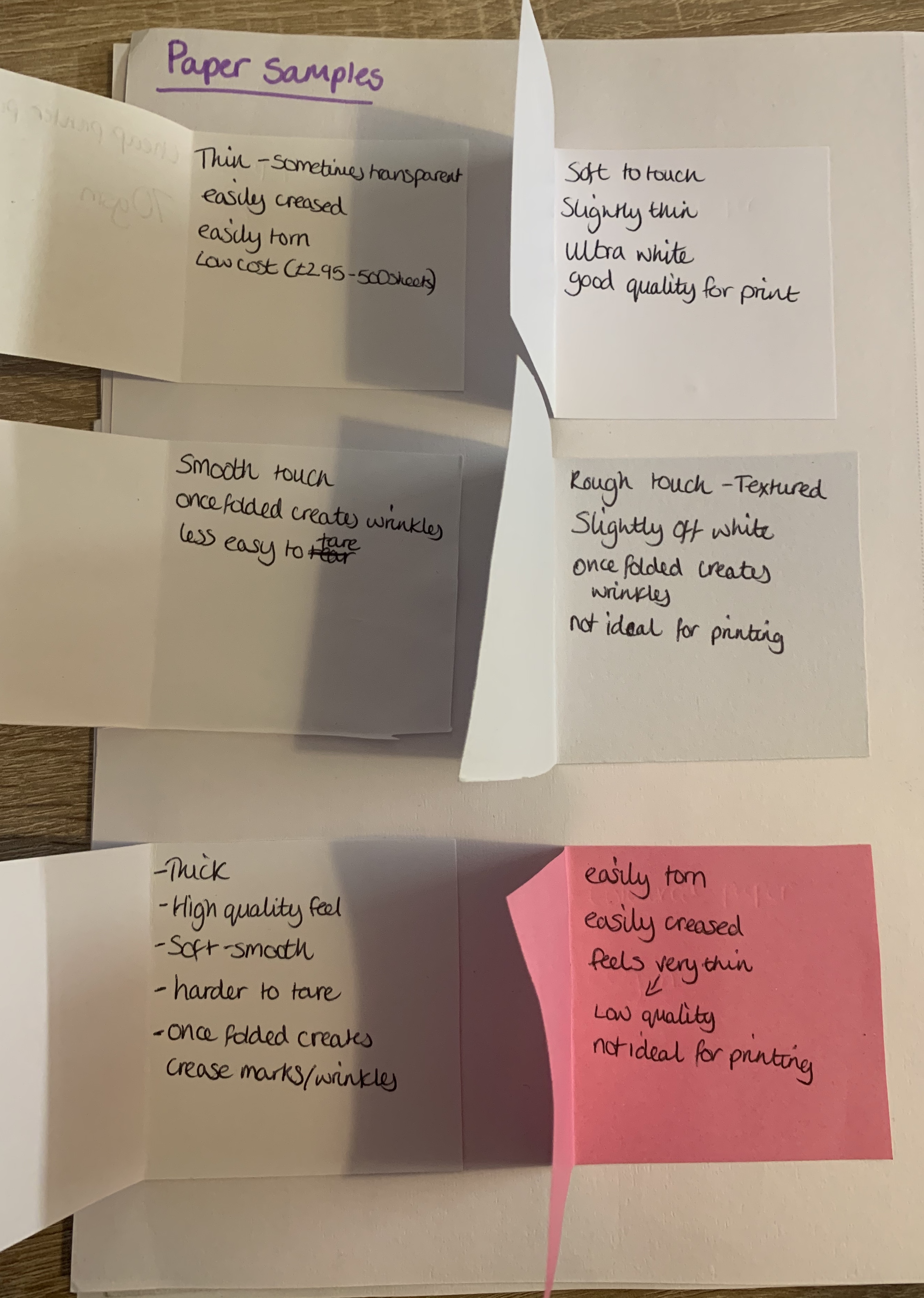 I started off by looking at different paper samples I had laying around the house, these consisted of; cheap printer paper, premium paper, matte paper, textured paper, white card and coloured paper all with a variety of different weights.