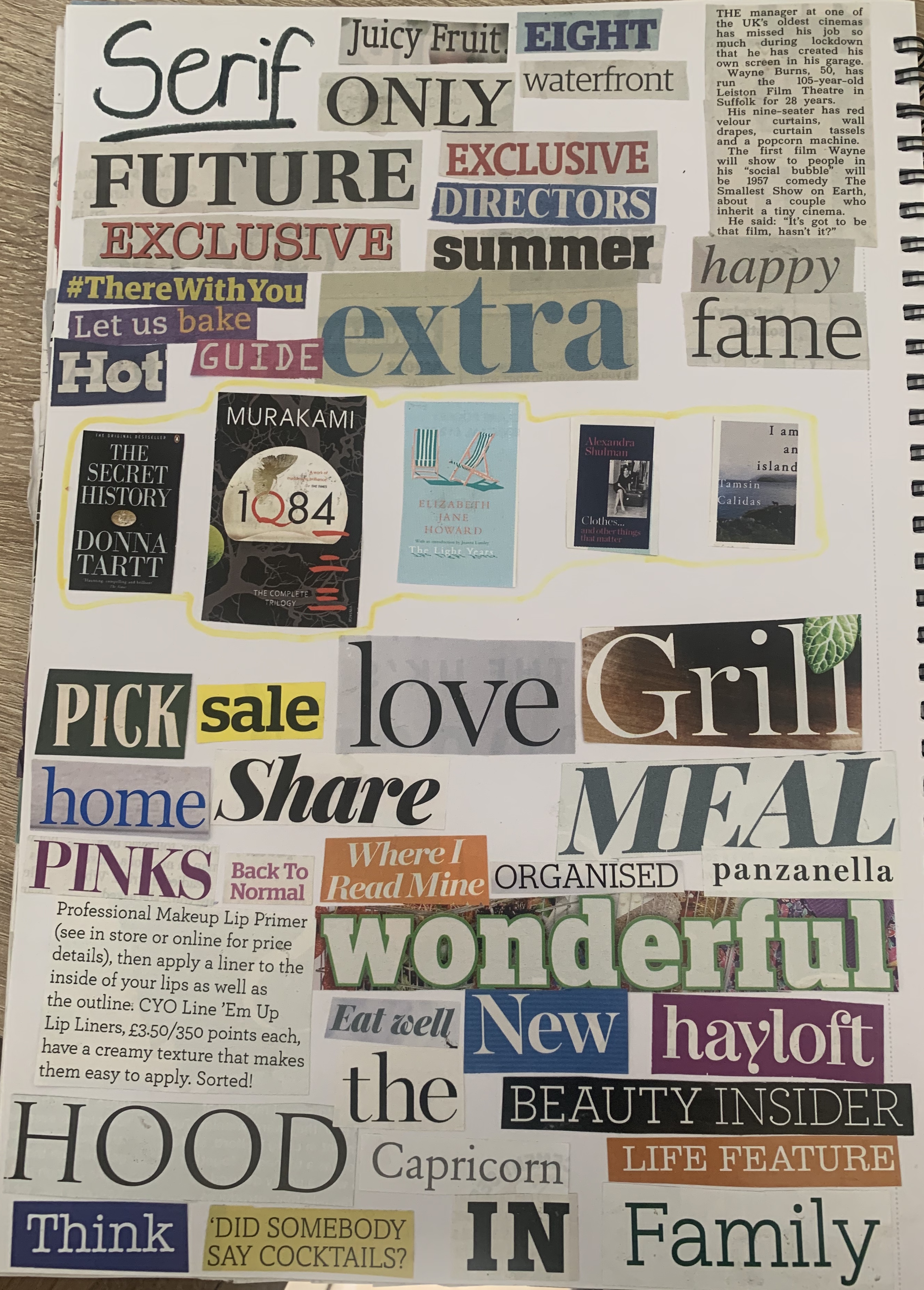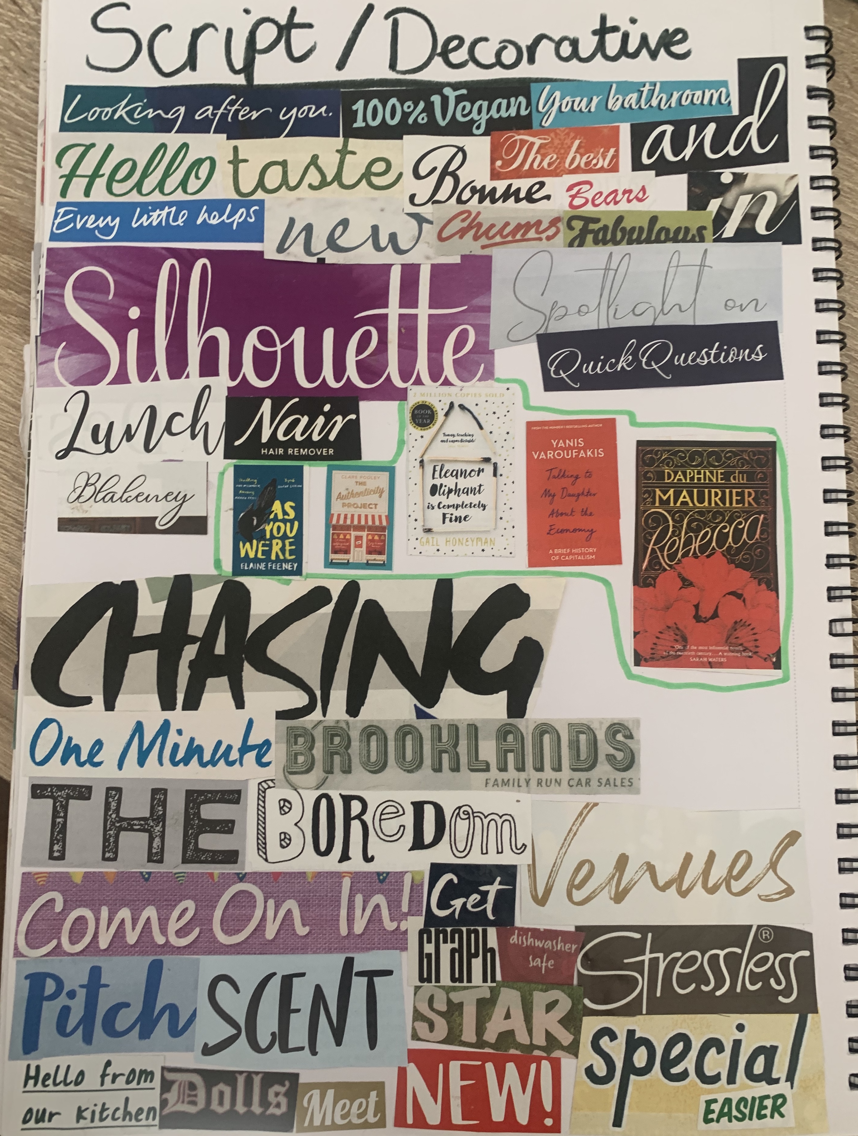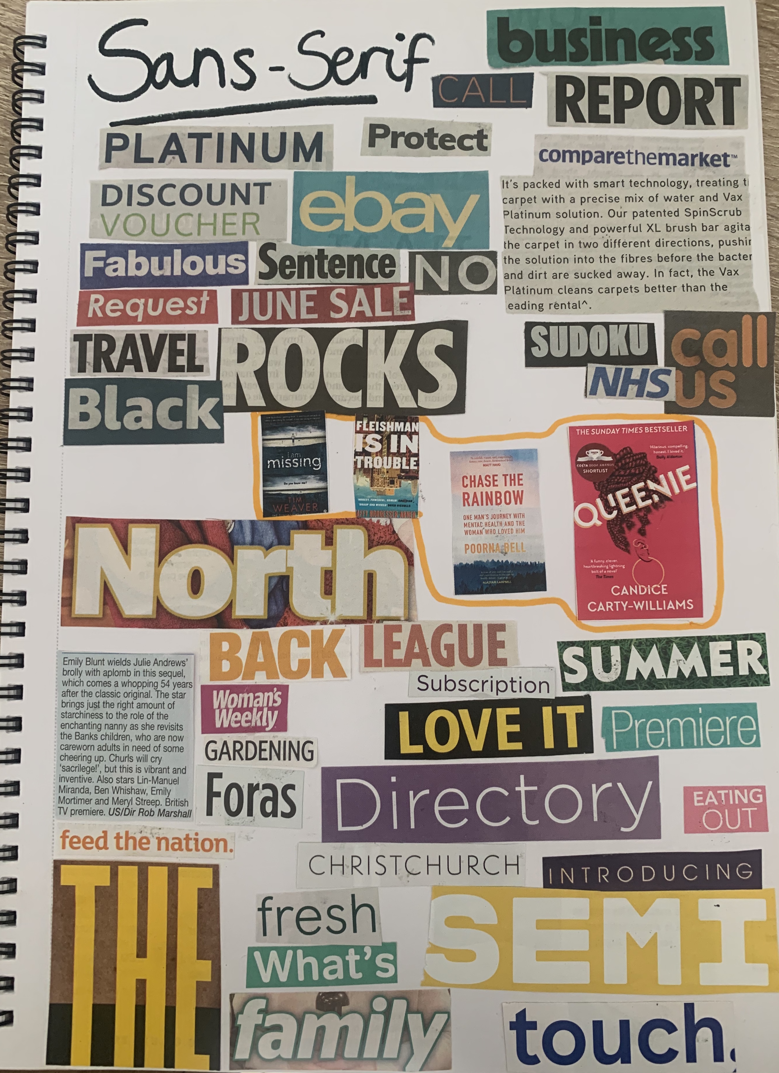 Im glad I made the two collages, as whilst writing my reflection above I found myself referring back to the newspaper and magazine collages to see the varieties and quantities of typefaces used within. So both ended up become beneficial which was a relief that I hadn’t wasted my time, nor pages in my sketchbook!