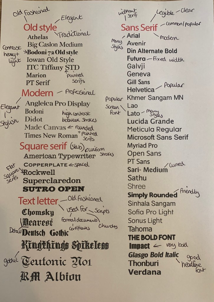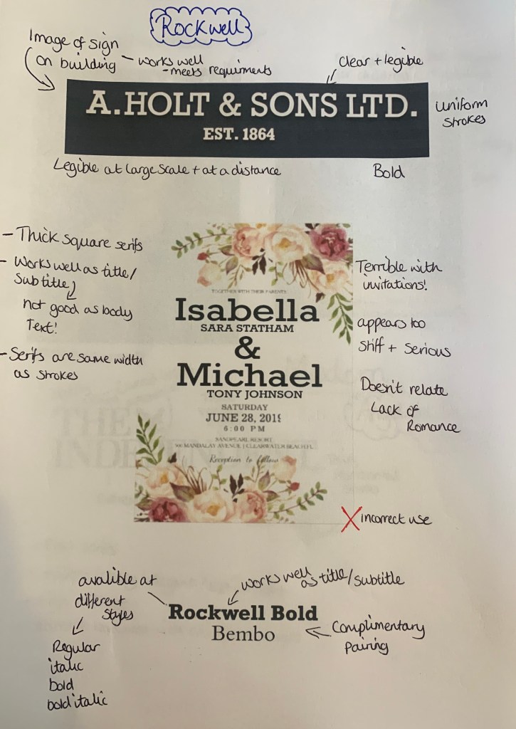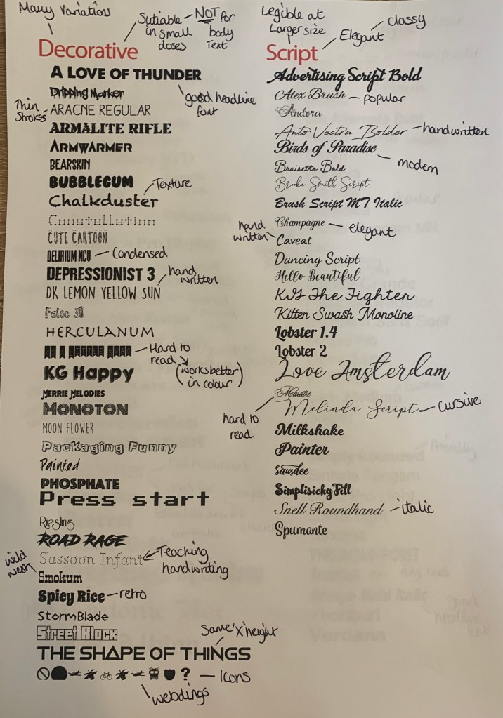 Each page contains the list of typefaces found on my computer along with a brief description of the category, an anatomy diagram and examples of other typefaces which I haven’t got downloaded. Once printed I was able to make brief notes along side some of the typeface.