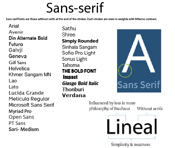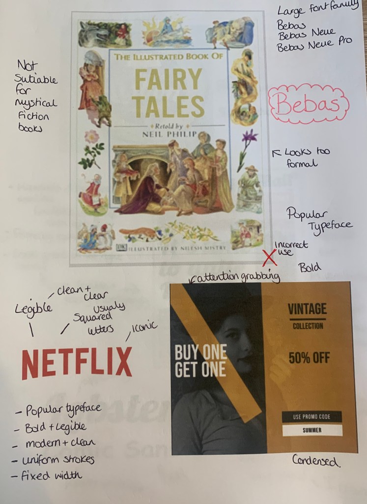 I collected a number of typefaces and arranged them into the correct groups. I noticed that Sans-serif tend to be used more commonly as titles, especially in newspapers – a clear bold font allows things to be read from a distance and to catch the readers attention. I also found sans-serif to be the chosen typeface in most adverts within the newspaper. The body text within papers is Serif, this has been said to help the reader skim read the text and for it to be easier to be read on a small scale.