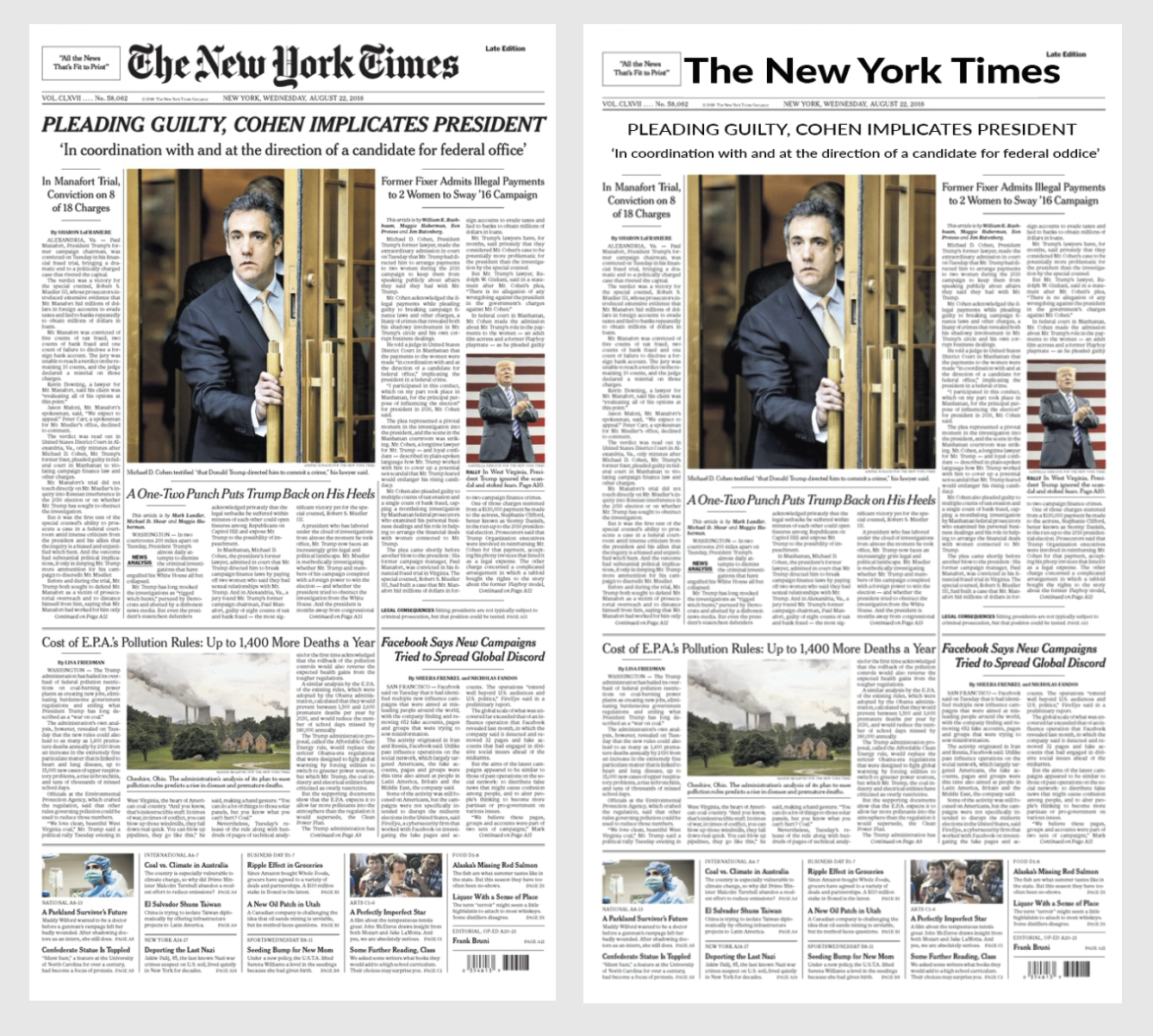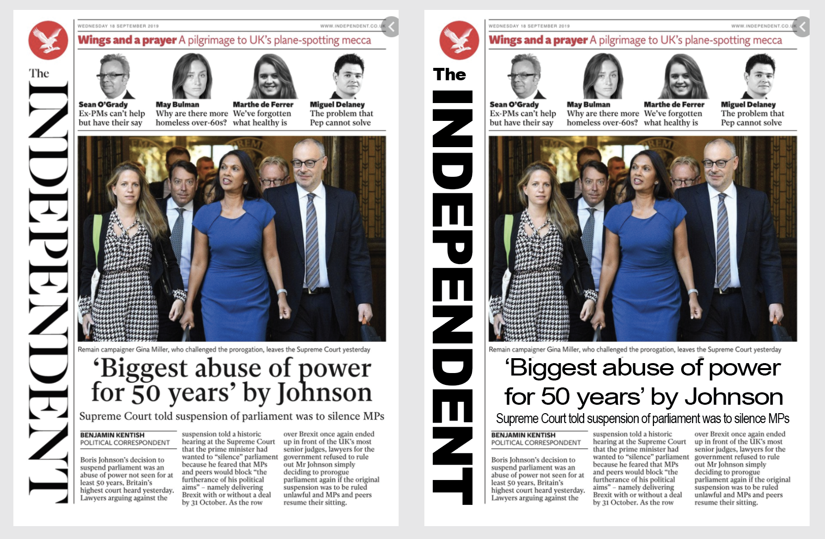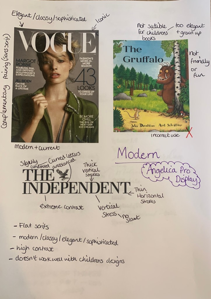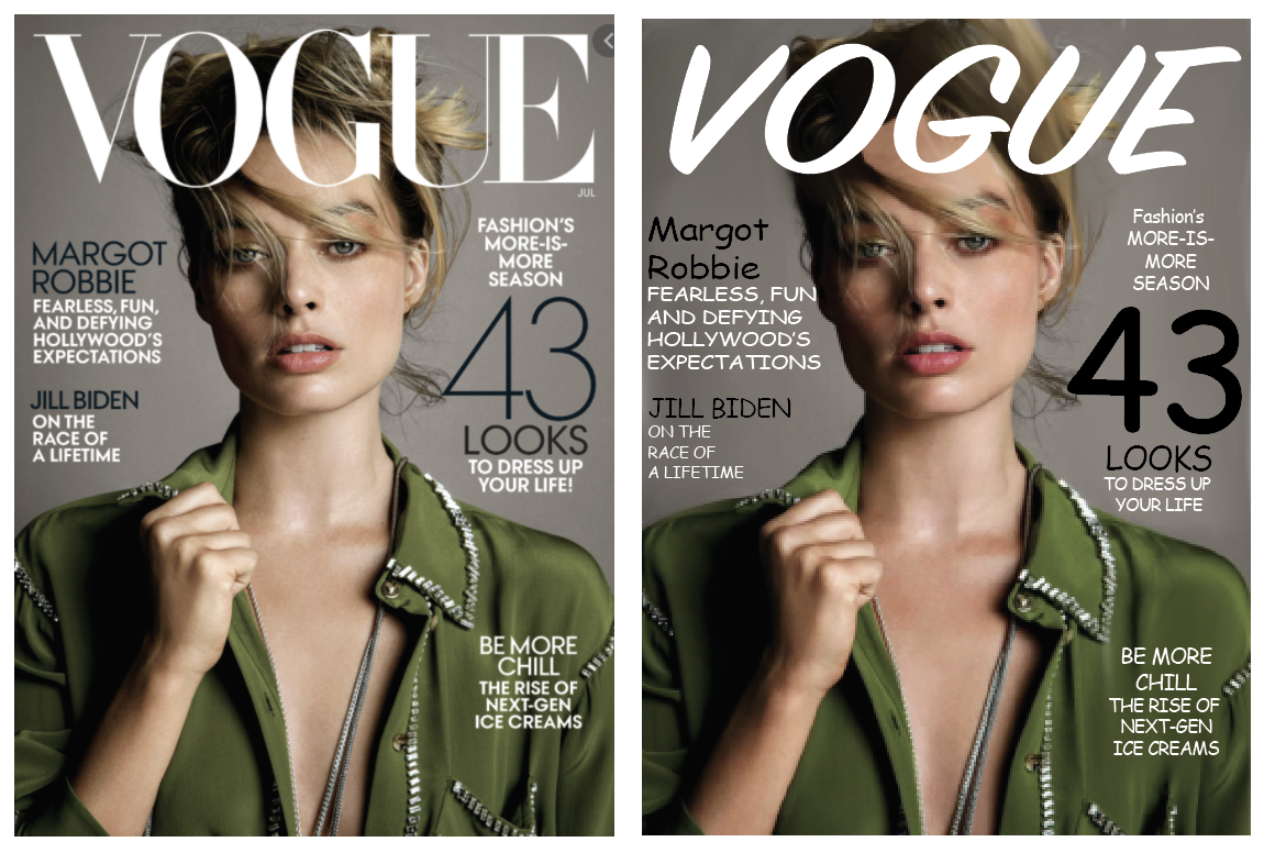 In both of the ‘re-designs’ this automatically takes away the seriousness and class away from both the magazine and newspaper when compared to the original. It shows how delicate the typeface is and how sophisticated it makes things seem; for example the Vogue magazine with the alternative typeface makes it seem like a cheaper gossip magazine, rather than the global successful fashion magazine that it is. The same with The Independent, it looks as if it could be a cheaper news paper in which some may say sells fake news.
