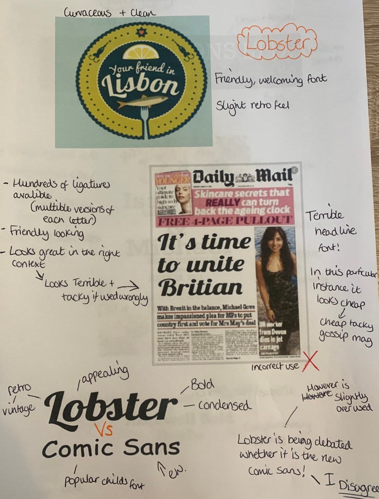 Lobster seems to be used vastly across the design world in many countries. Upon research of this typeface I discovered that it isn’t loved by all, with many asking if this is the modern day Comic sans. I feel Lobster is much more elegant font, with its neat details, strong personality, and a large number of ligatures, which have been carefully designed. – So I strongly disagree with this being compared to Comic Sans.