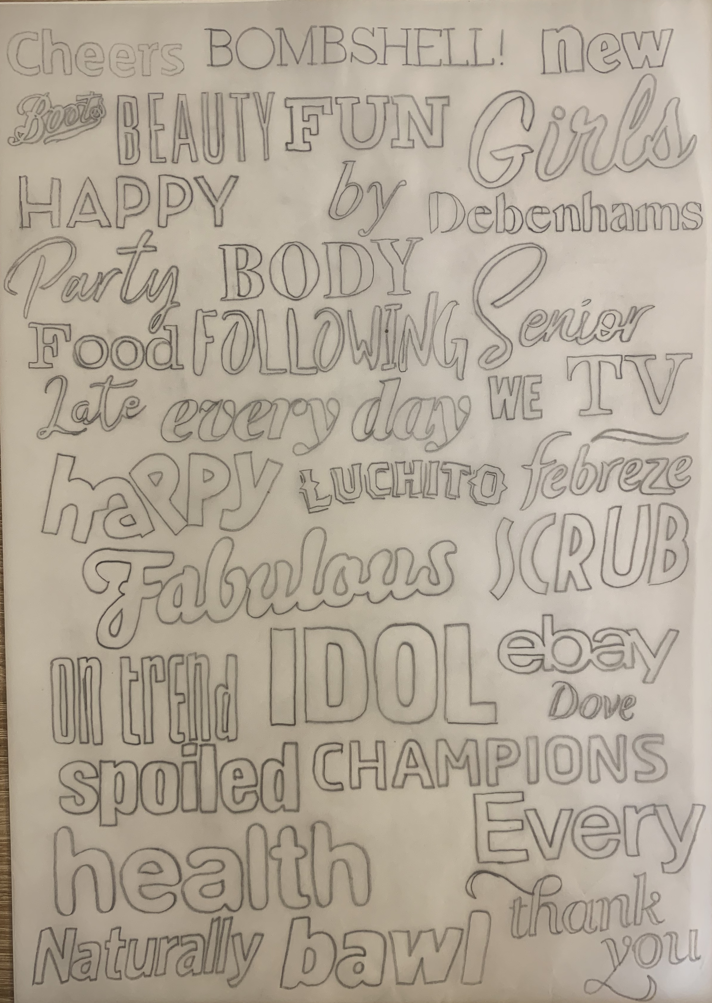 I used a mixture of magazines, leaflets and newspapers to trace over as many different typefaces as possible. Firstly I drew the outside of the letterforms to focus on the structure of the strokes, serifs and curves of the letters, this made me pay close attention! I then coloured these in to see the full effect of the typefaces. I found the script typefaces most challenging due to the various stroke widths and smoothness of the curves.