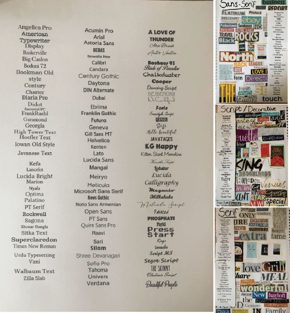 I then sorted through the fonts I have on my computer, I set each typeface to 14pt so I could see how each font varied with weights and x-height etc, I then cut each column and attached it to the collages.