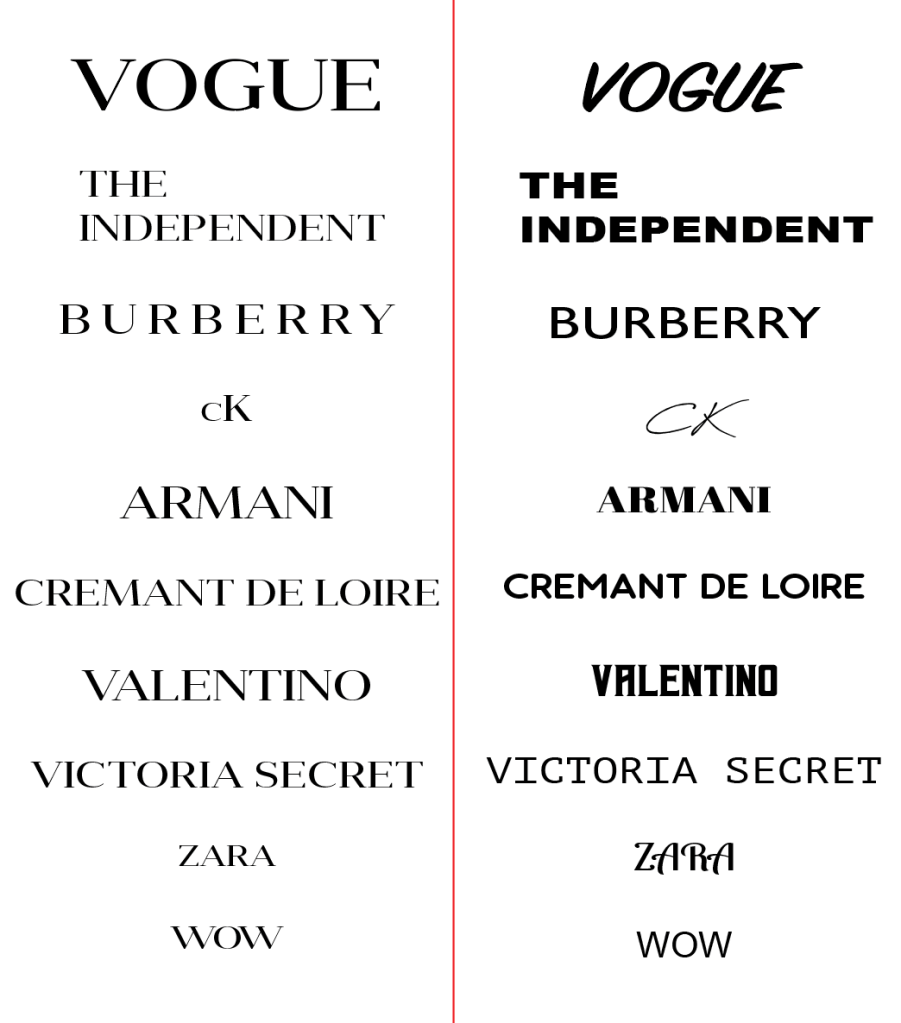As you can see they change the look completely, this shows the importance of choosing the right typefaces. Although they have been changed to a mixture of typefaces, non of them work well or live up to the ‘high standards’ as the Angelica Pro Display font gives for said ‘brands’. They appear to look cheaper, unrecognisable and less professional. To give a higher impact I have used the alternative typefaces in replacing the original.