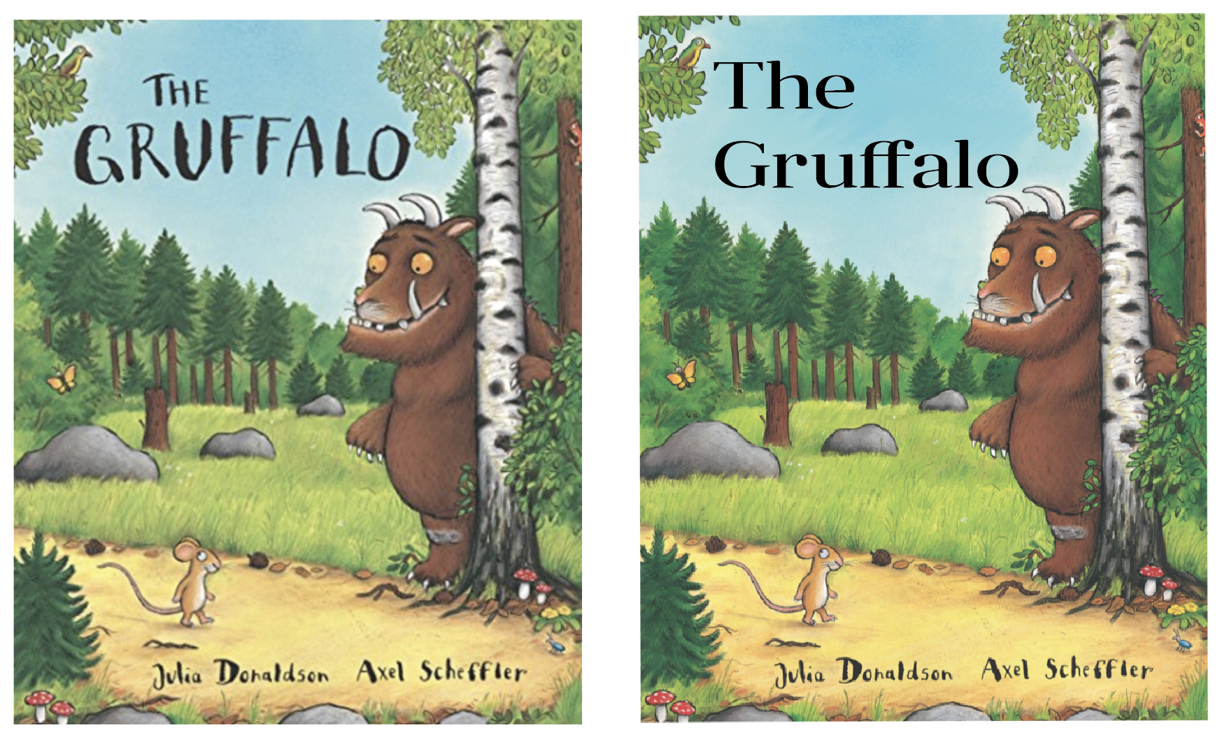 Angelica Pro Display would make a terrible body text font as when the letters are sized down to a smaller size, it becomes totally unreadable and a sight for sore eyes. I then replaced the font on a popular children’s book which I feel changes the cover, it makes it feel more serious and formal rather than the playful fun story that it is.