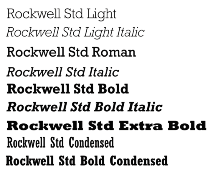 Rockwell is a square/slab serif typeface designed by the Monotype Corporation and released in 1934. This typeface is distinguished by a serif at the apex of the uppercase A, while the lowercase a has two storeys. Because of its monoweighted stroke, Rockwell is used primarily for display or at small sizes rather than as a body text.