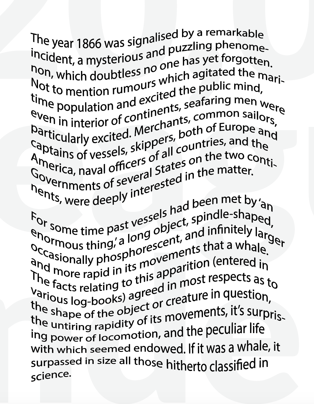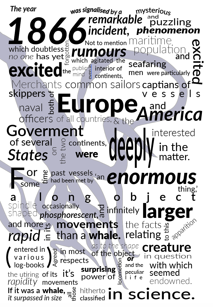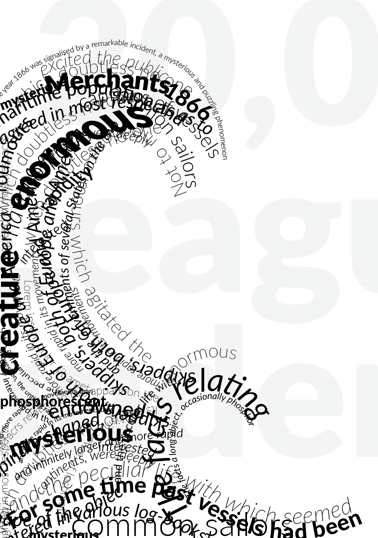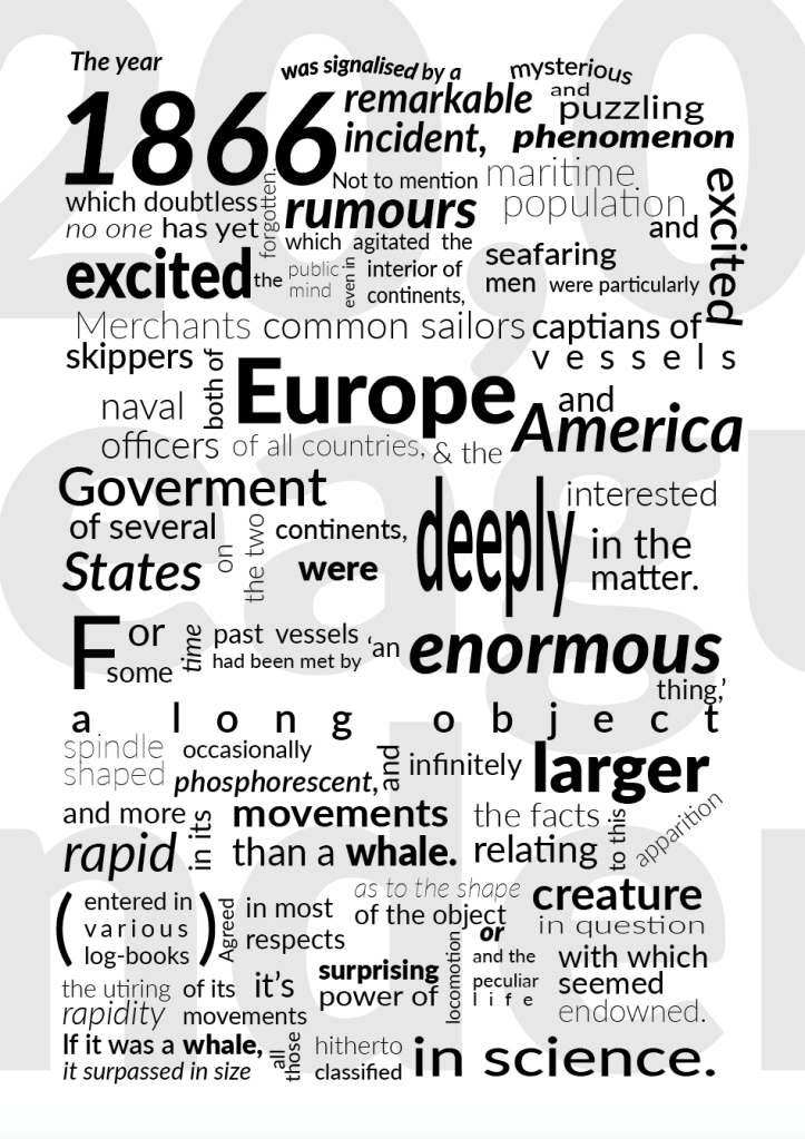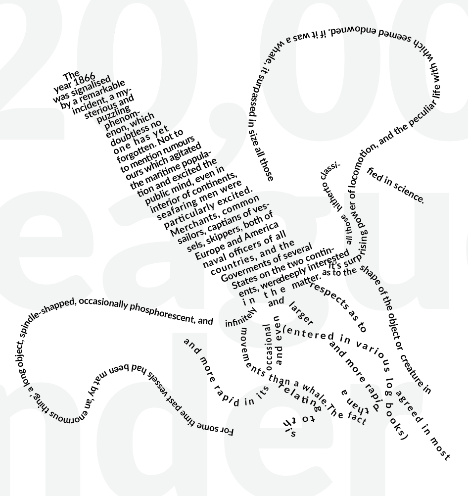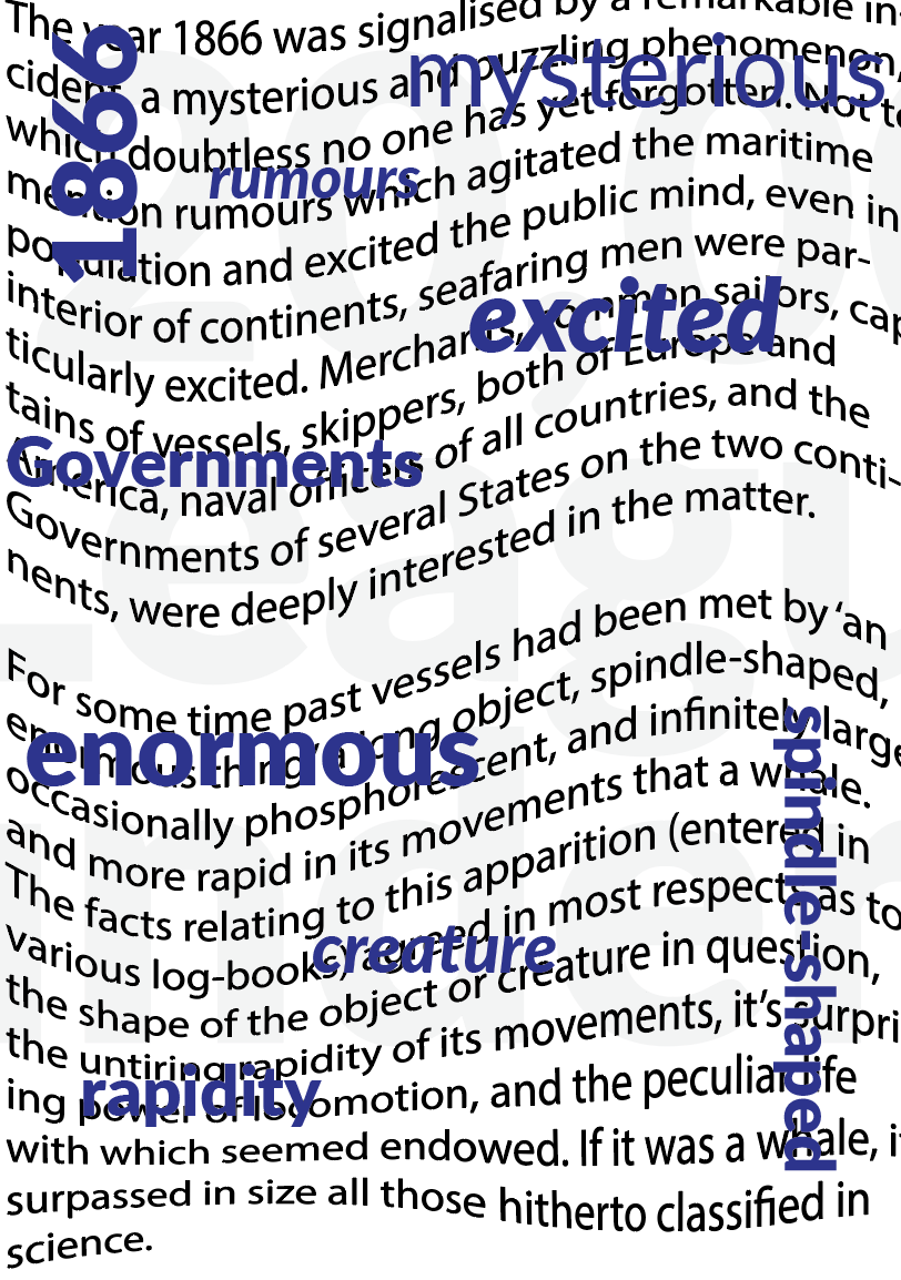 Below is an extract from Jules Verne’s 20,000 Leagues Under the Sea. Using a single typeface of your choice, lay out the test in as inventive a way as possible. Experiment with the letters and words, using typographic principles you researched in earlier exercises to significantly alter the arrangement of the text, its rhythm and readability.