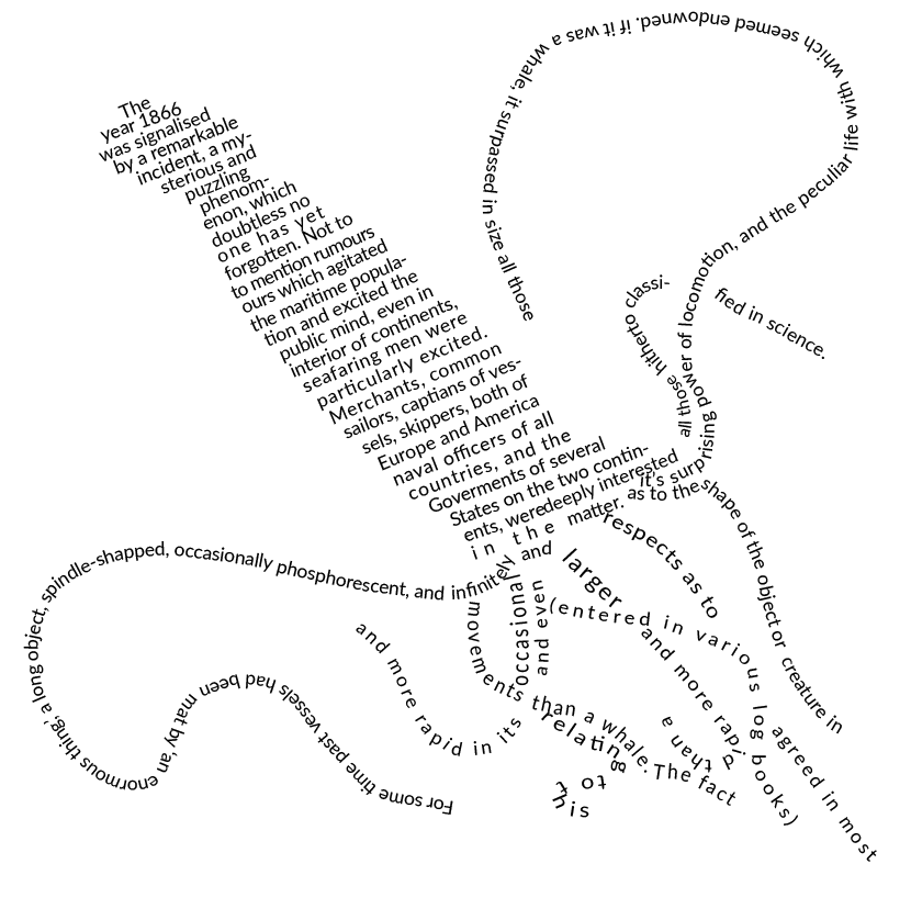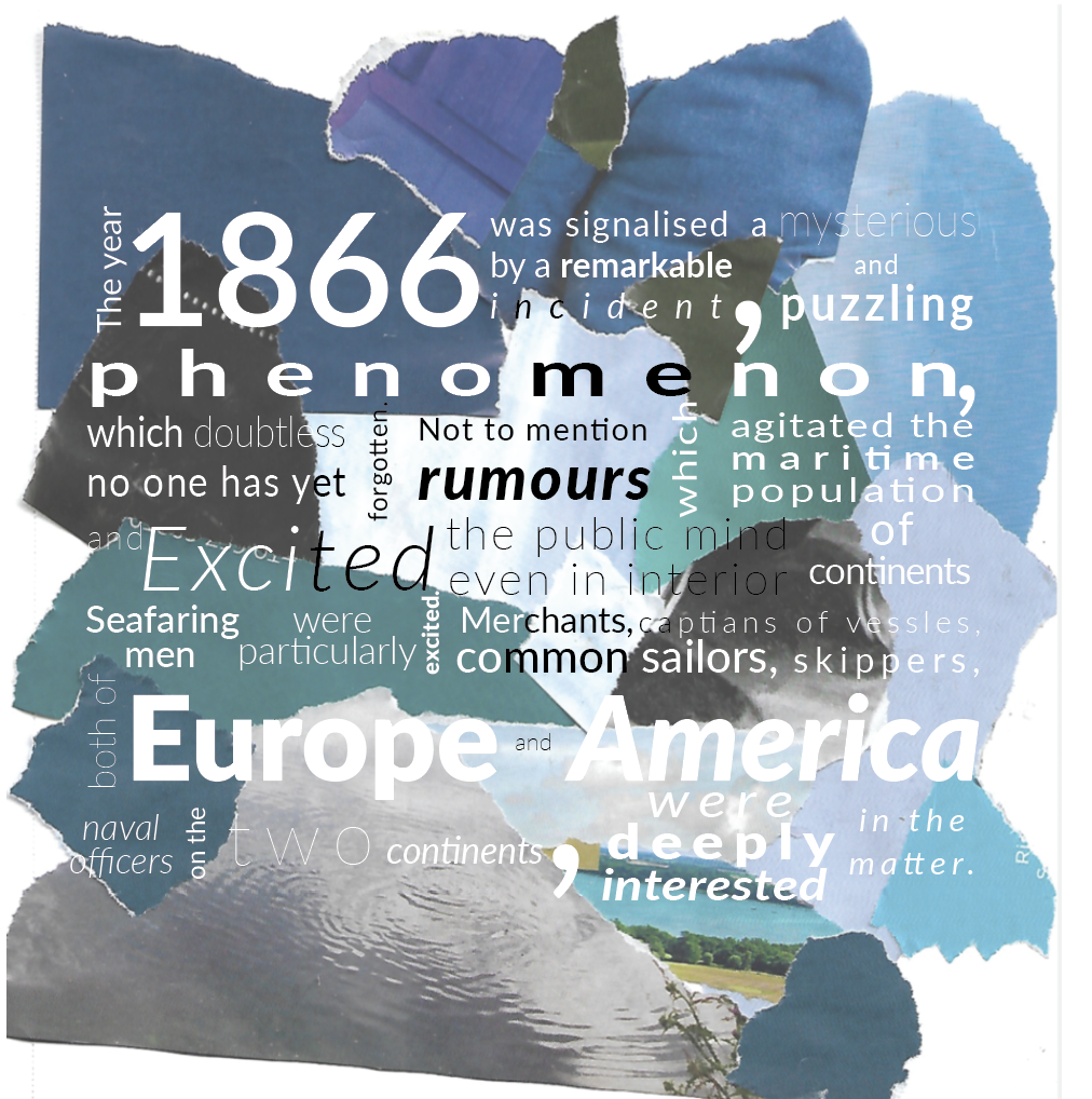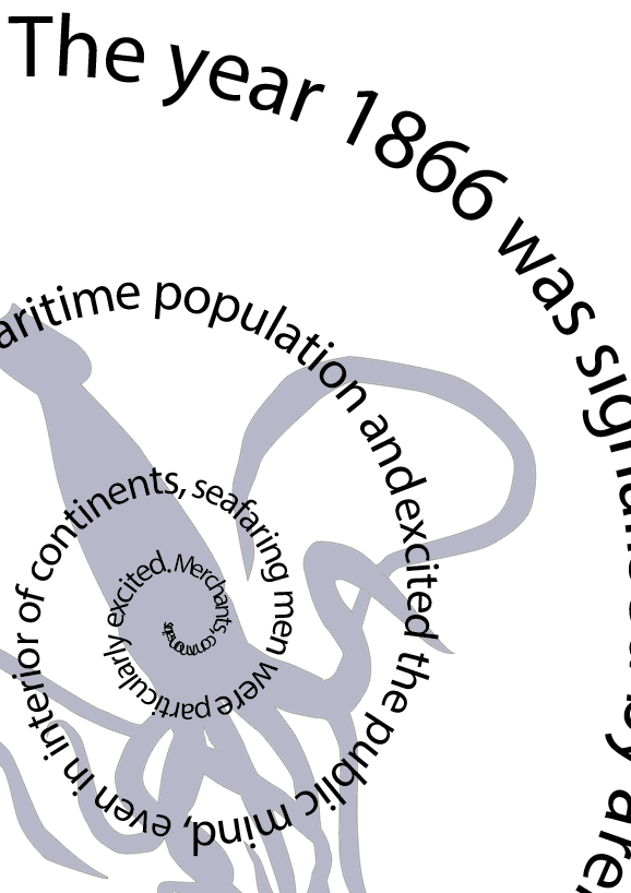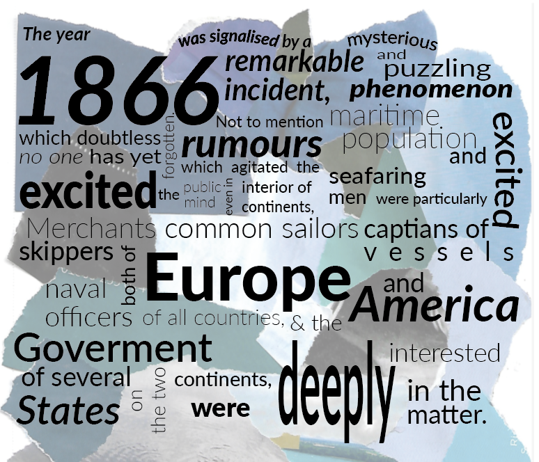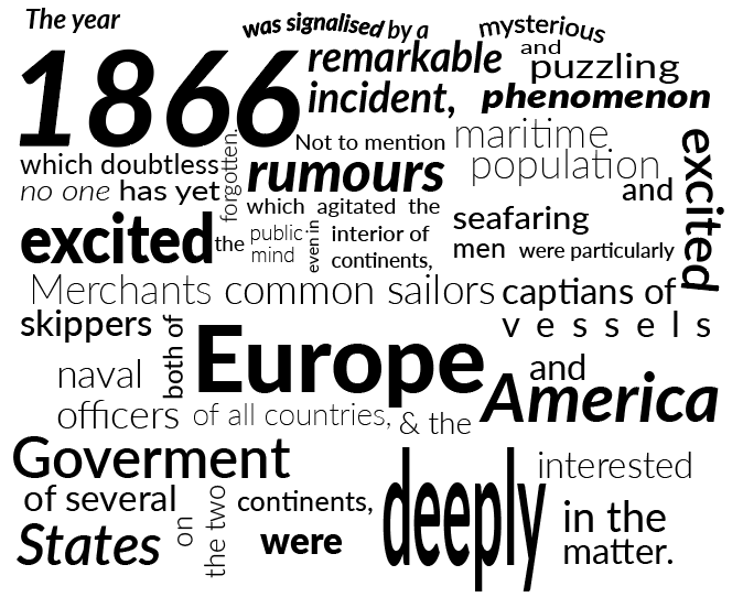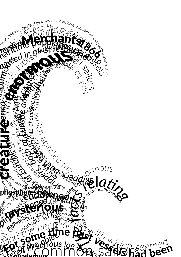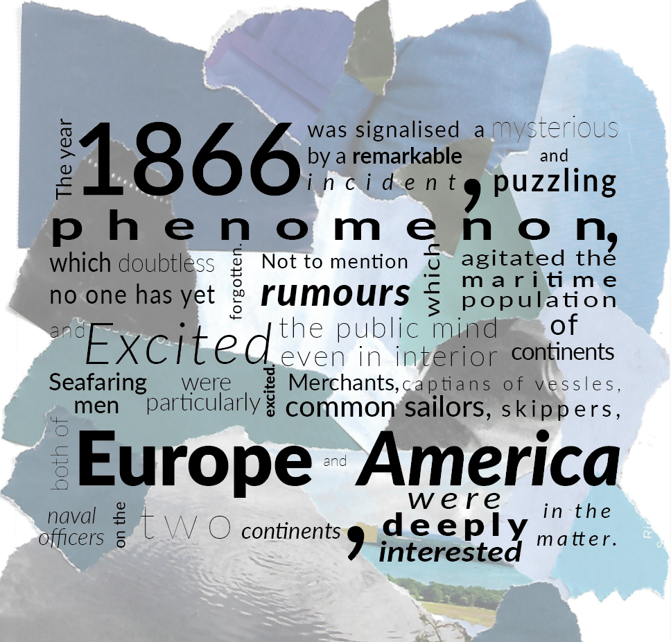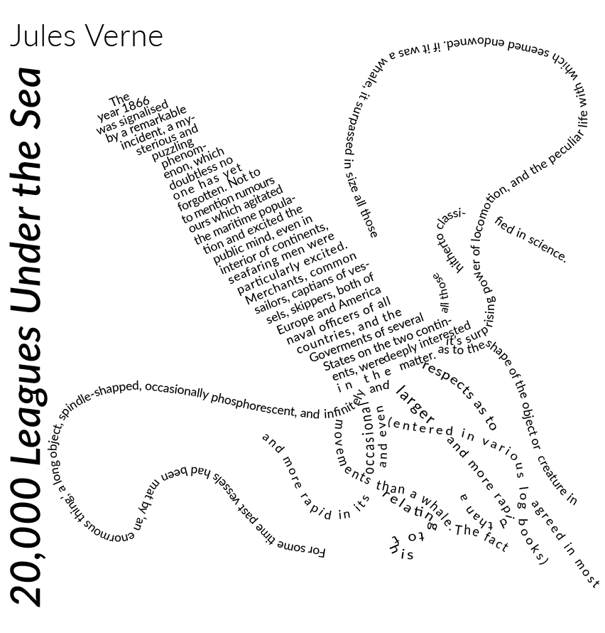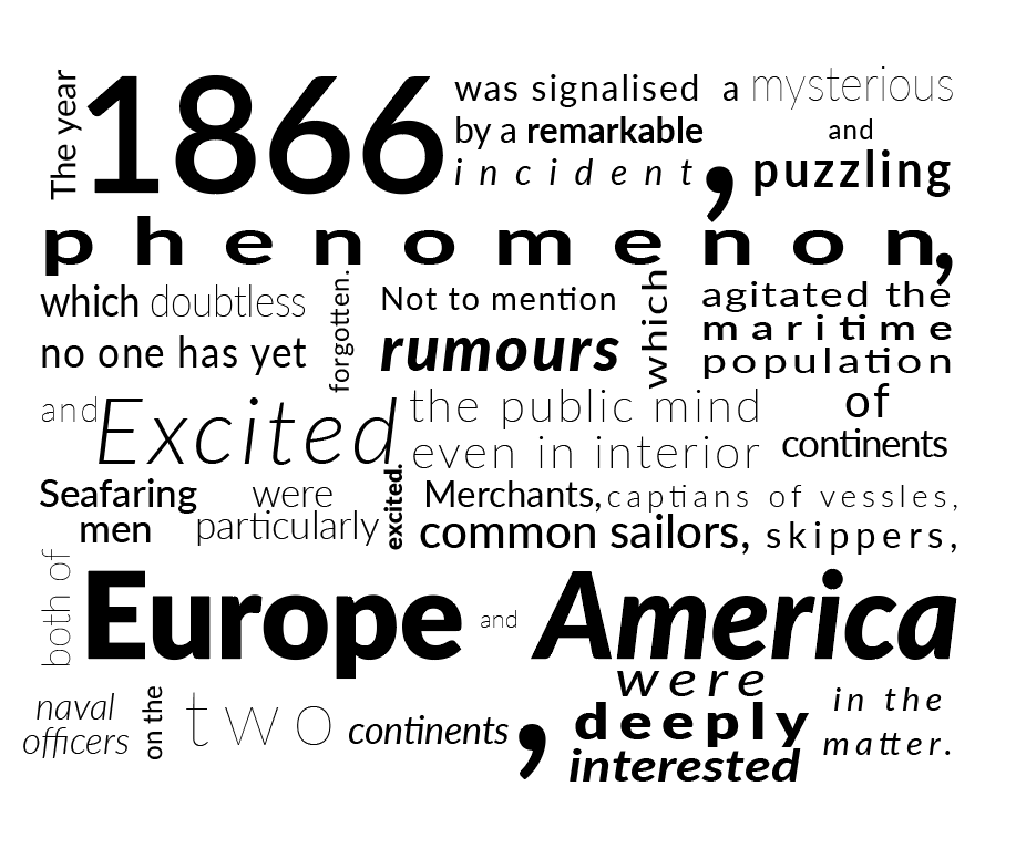 Below is an extract from Jules Verne’s 20,000 Leagues Under the Sea. Using a single typeface of your choice, lay out the test in as inventive a way as possible. Experiment with the letters and words, using typographic principles you researched in earlier exercises to significantly alter the arrangement of the text, its rhythm and readability.