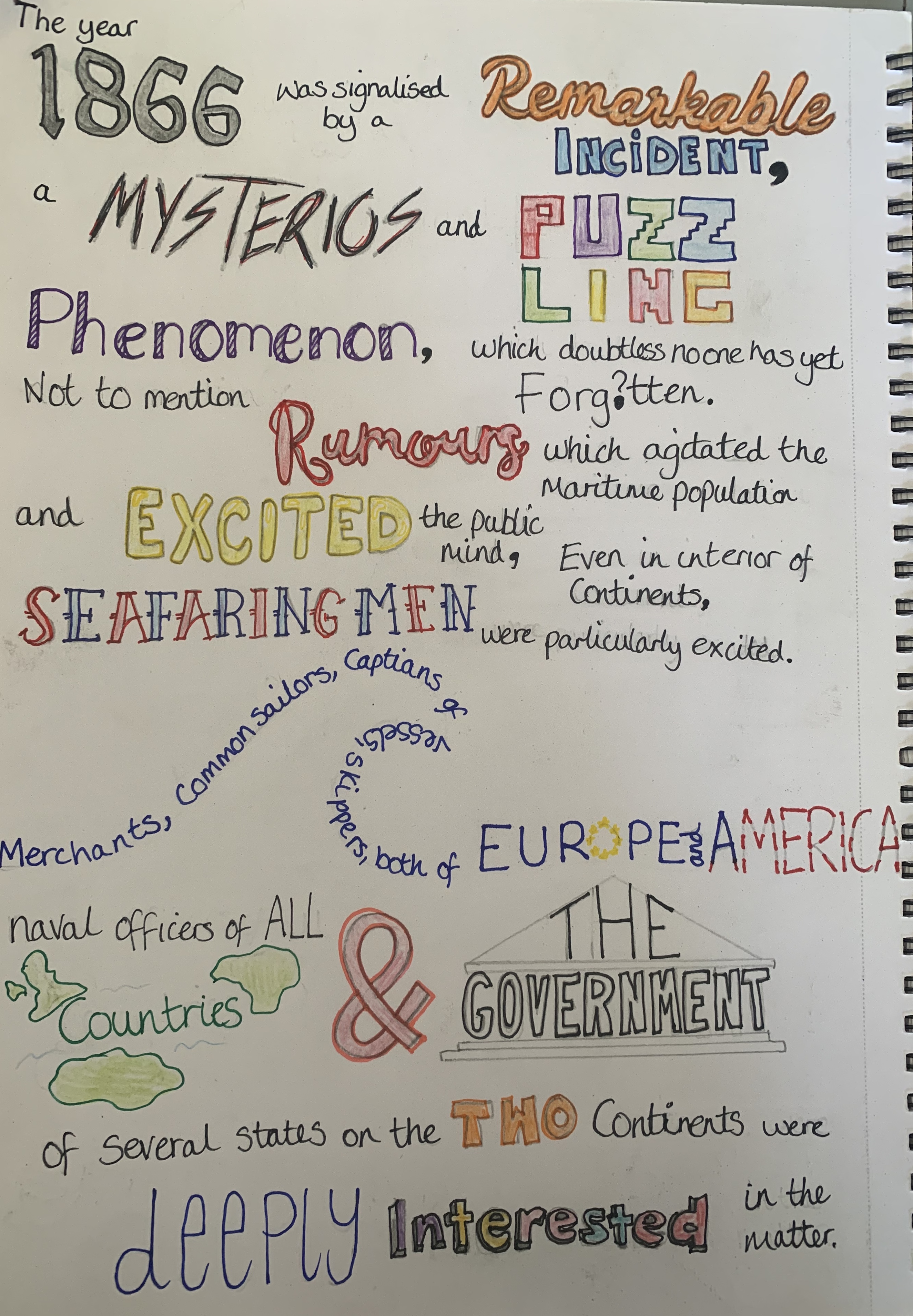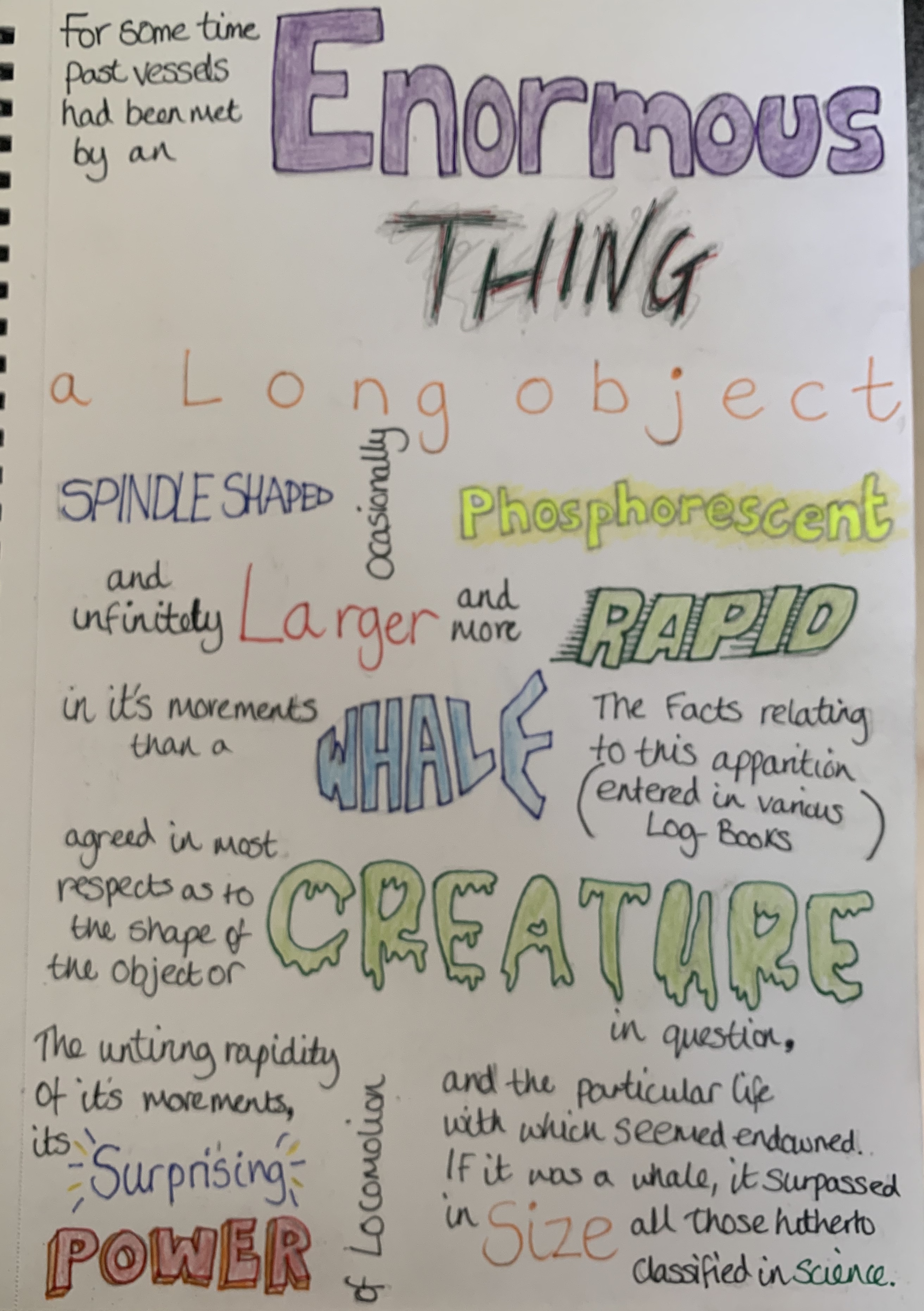 I then decided to write out the first chapter of 20,000 Leagues under the sea using some of the visual representations of the words. Some words are more successful than others, however I still feel that the meaning is expressed correctly. Perhaps if this was created digitally it may look neater however to me looks rather messy. Im glad I experimented with my sketchpad but I would much prefer to work digitally for this exercise. Also it wasn’t until after completing this I remembered the brief stated to use one typeface!