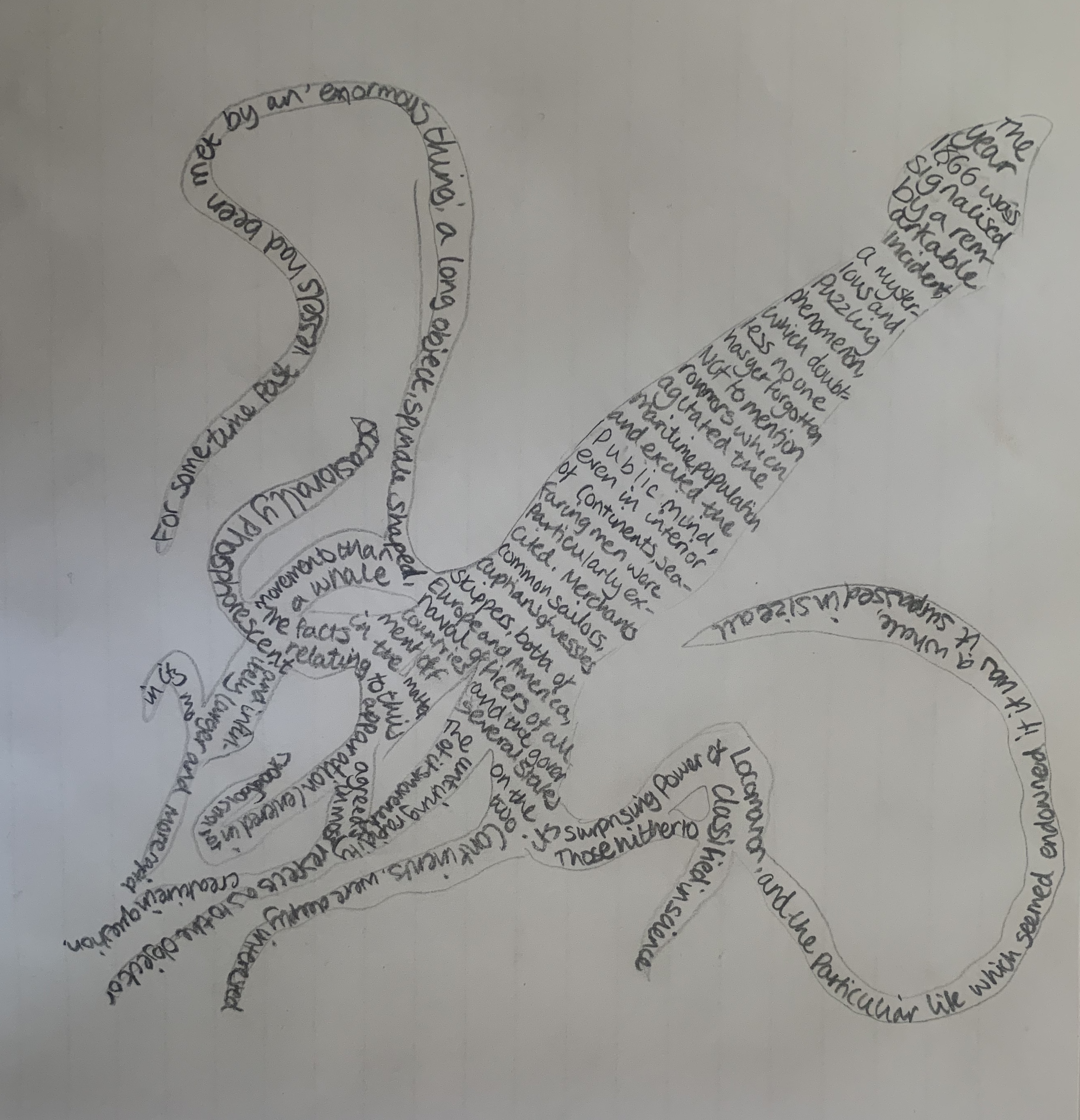 The image to the left is where I found inspiration for this design, I sketched out a drawing of a giant squid the simply filled the shape with the words from chapter 1.