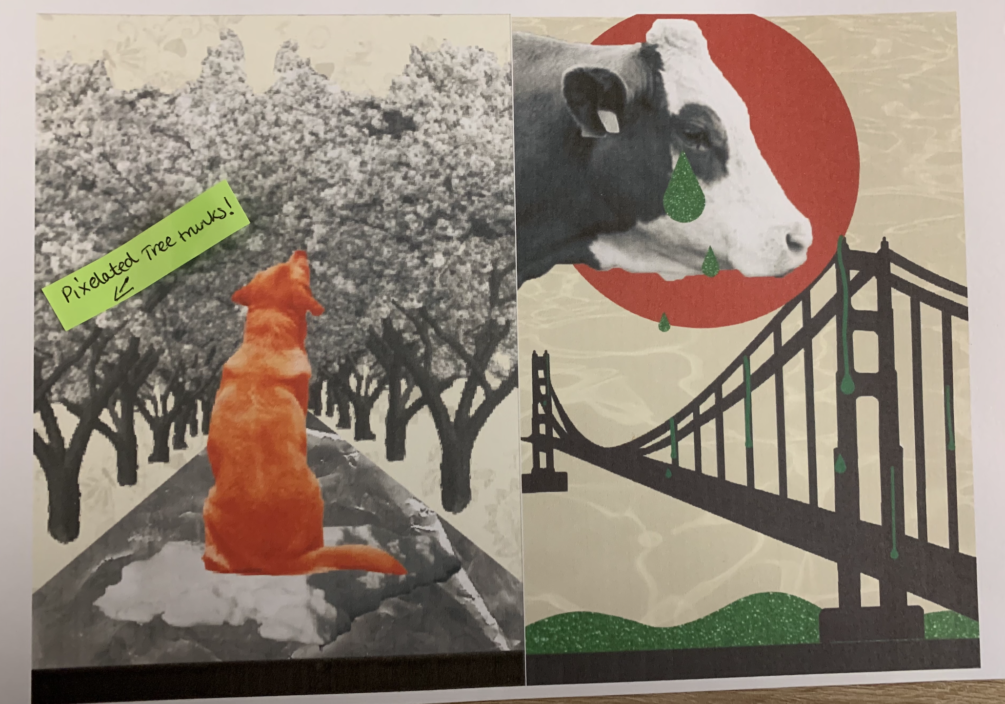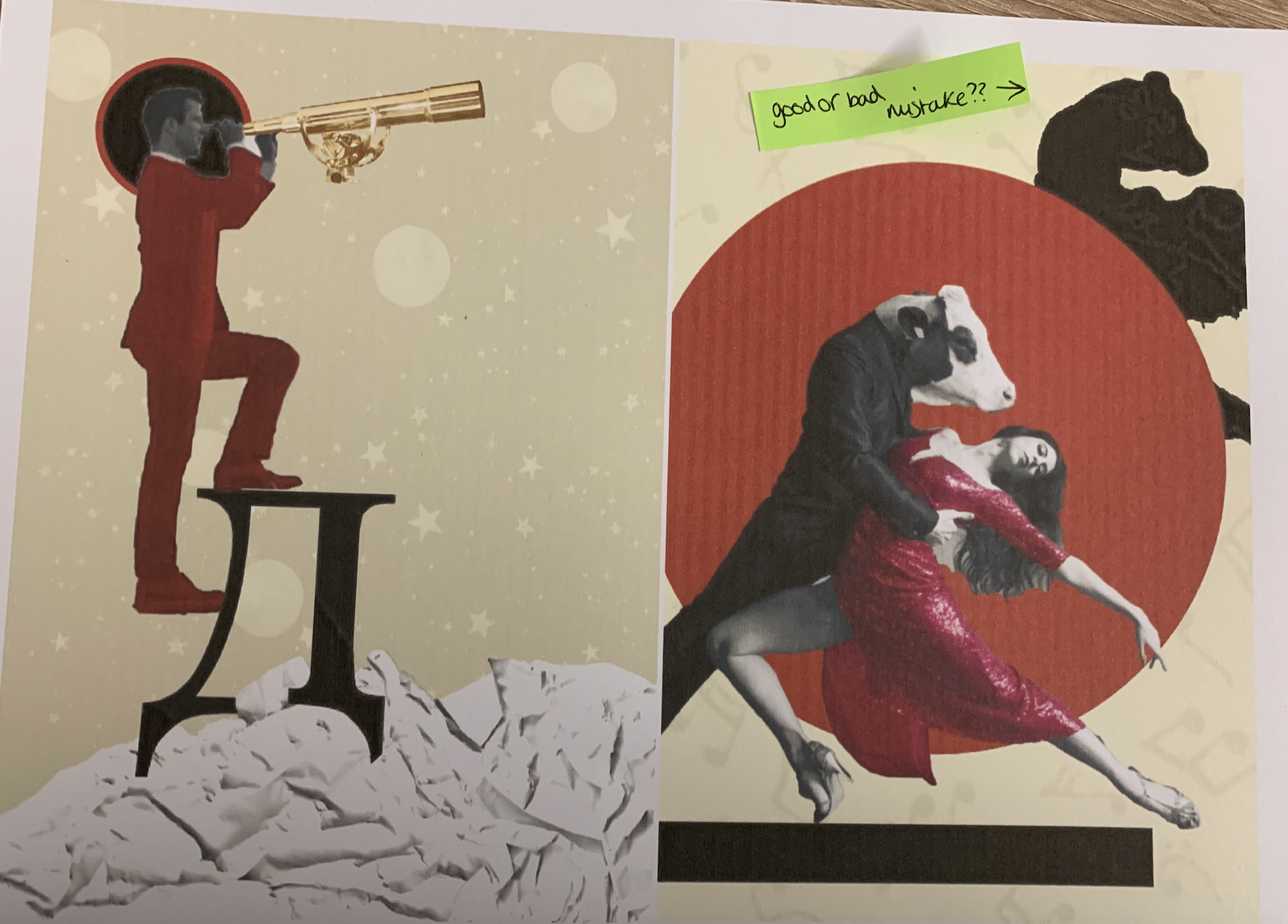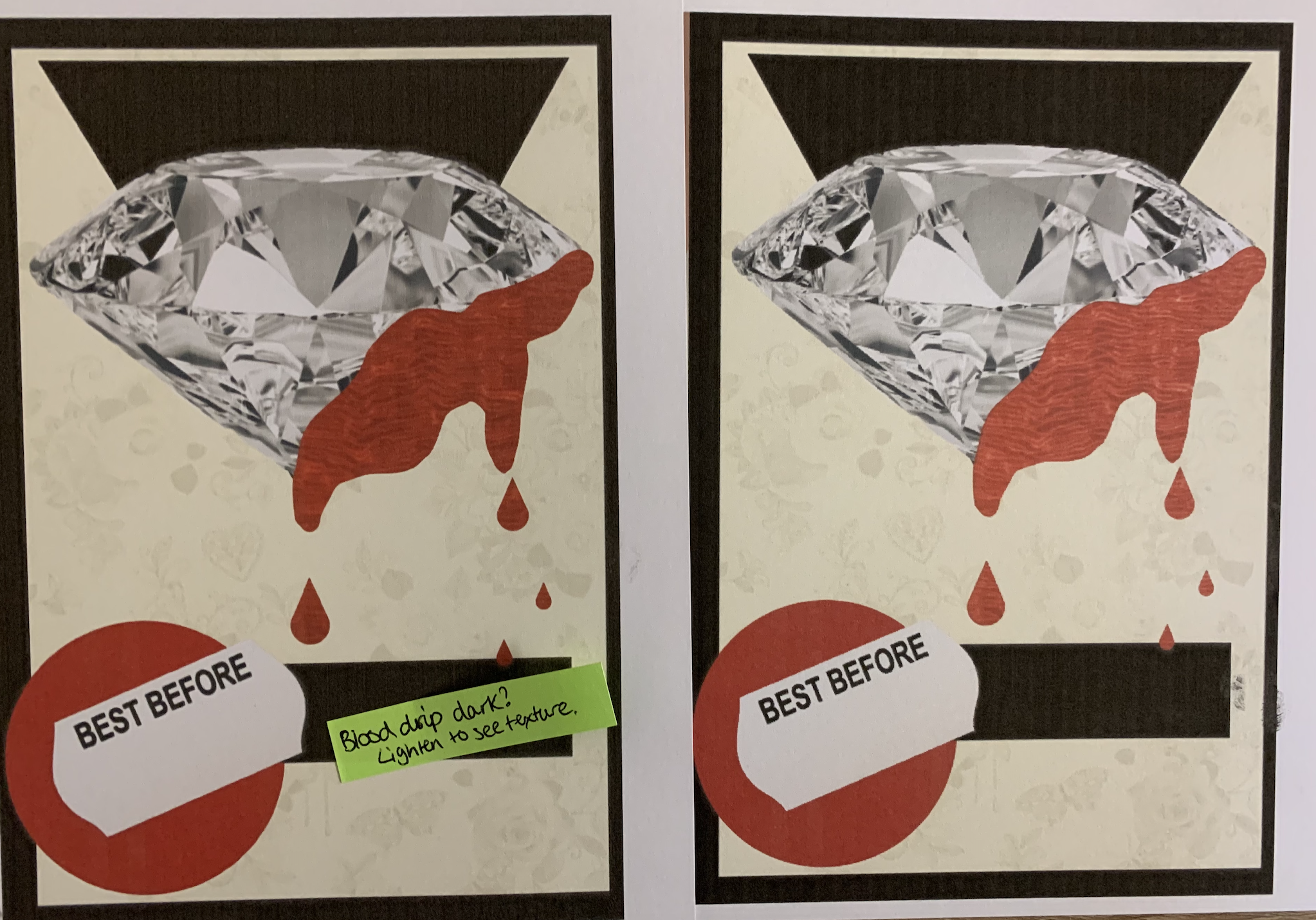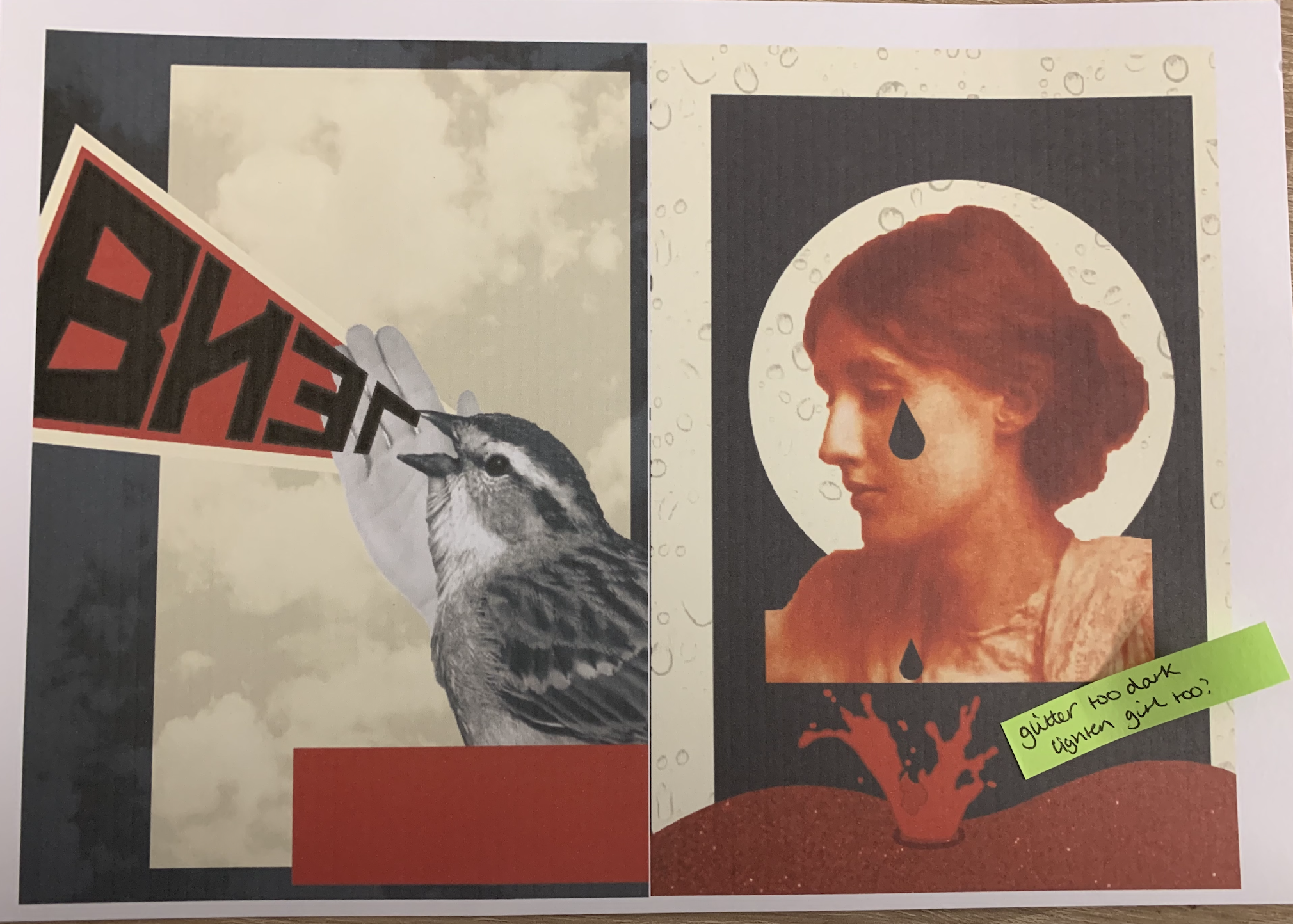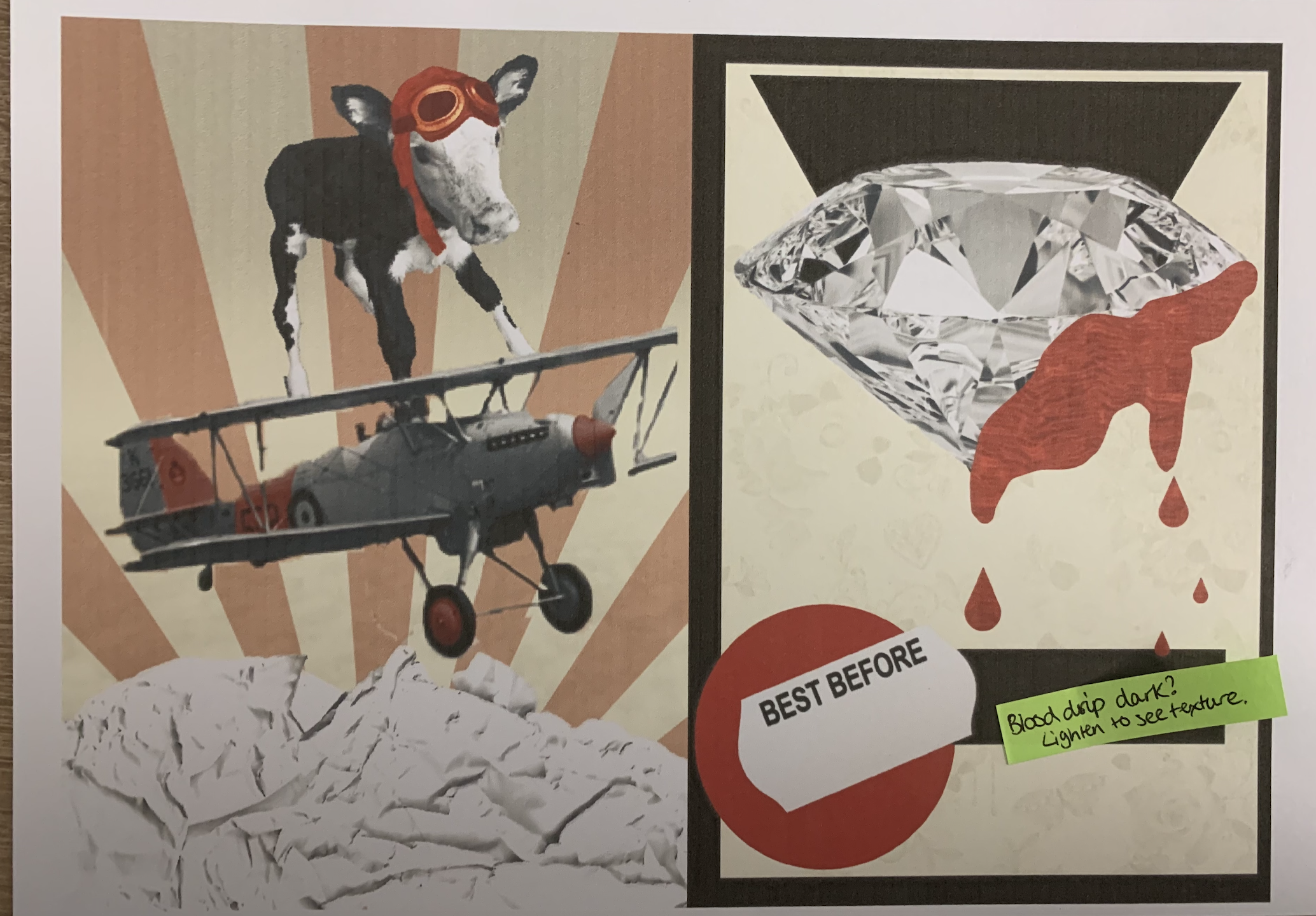 My only concern for my designs are if they are too similar – should I of stuck to the theme so strictly? I tried to differ each image, especially the backgrounds (speaking of, I need to lower the opacity on the yellow overlay on some of the designs as the background images aren’t seen as clearly as others). I am also hoping once my designs are printed out at a larger scale and on better quality paper that the finer details will be more apparent such as the use of printed mixed media so that the different textures can be seen etc.