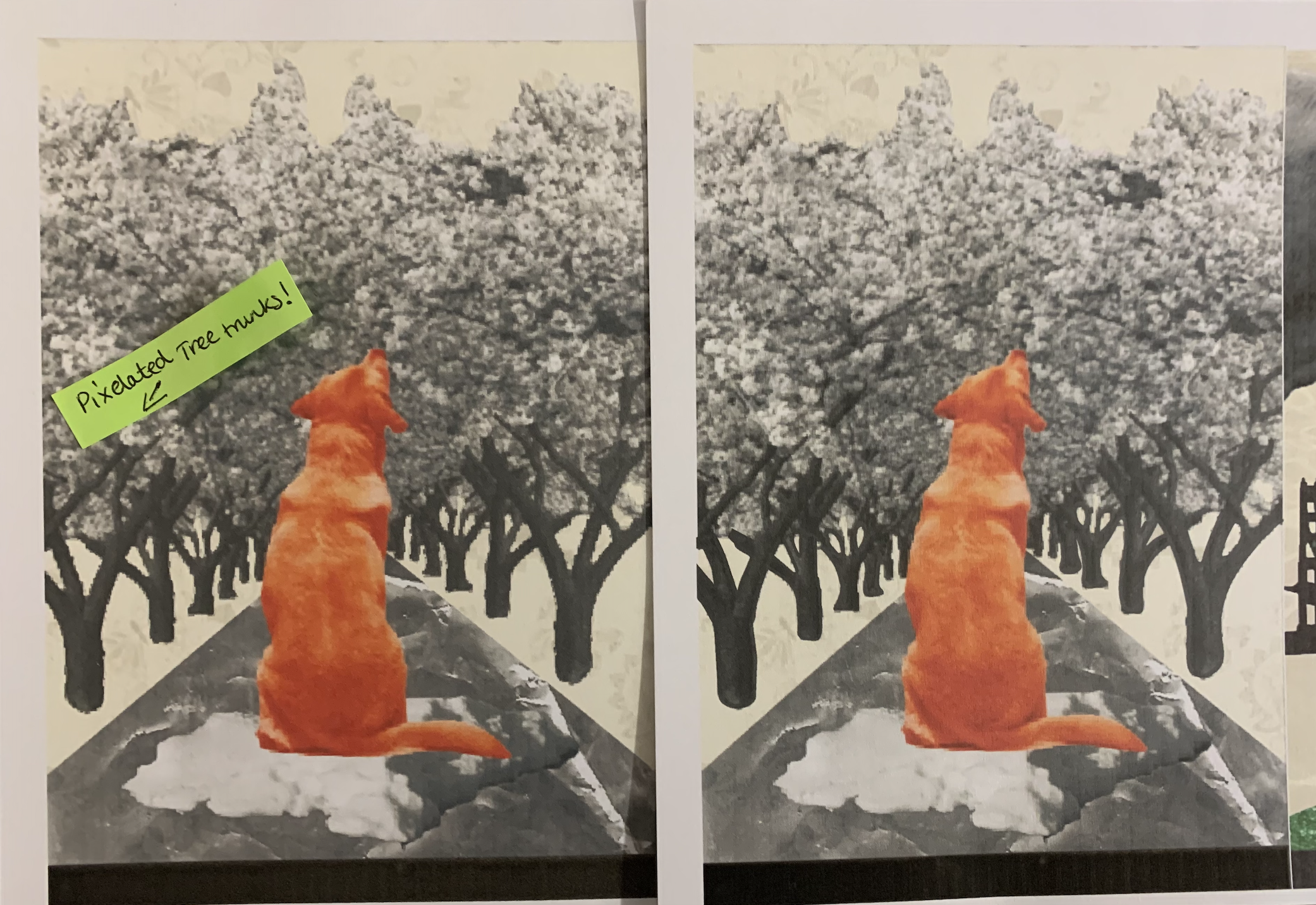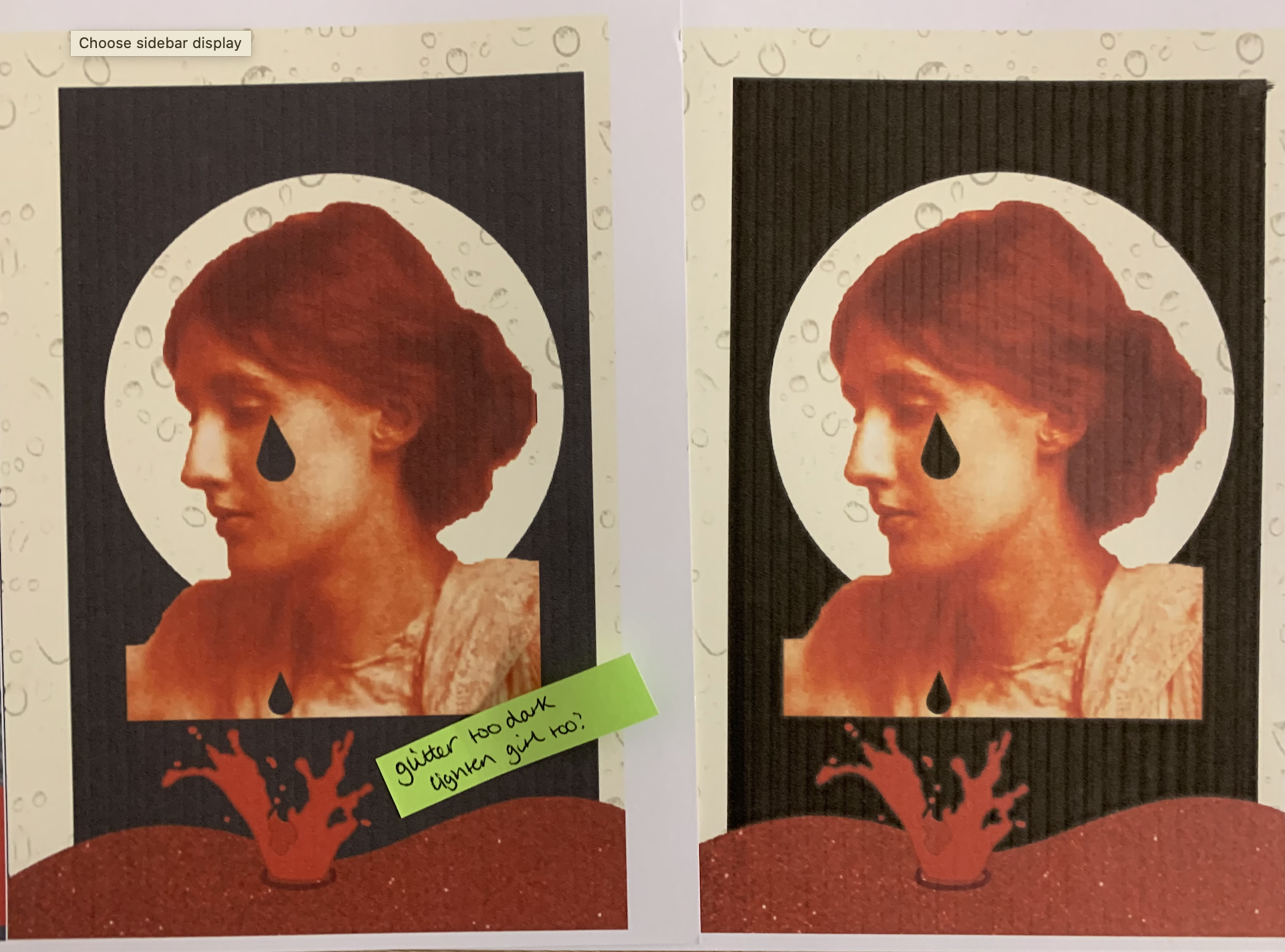 Seeing the images printed in a larger form enabled me to see the errors and quality within. I seemed to have a slight printer issue with ink when printing out my images, I made notes for the images which I wasn’t happy with, I felt that a lot of the red images printed darker hiding the texture of the mixed media paper. I simply lightened these and correct the issues and reprinted as seen below side by side of the before and afters.