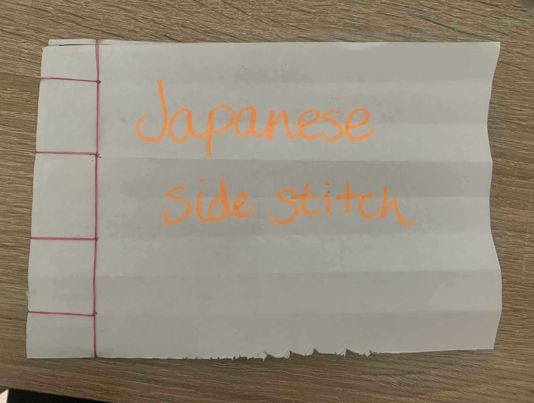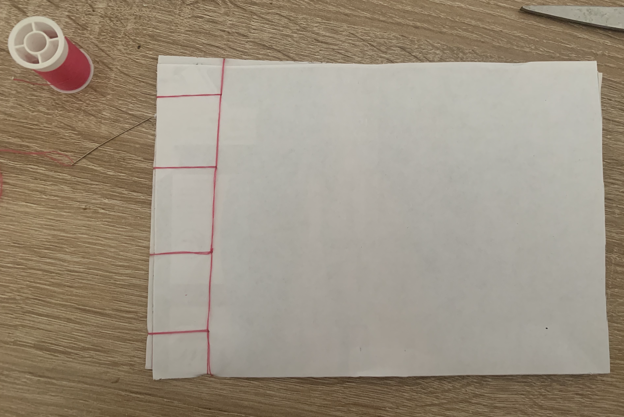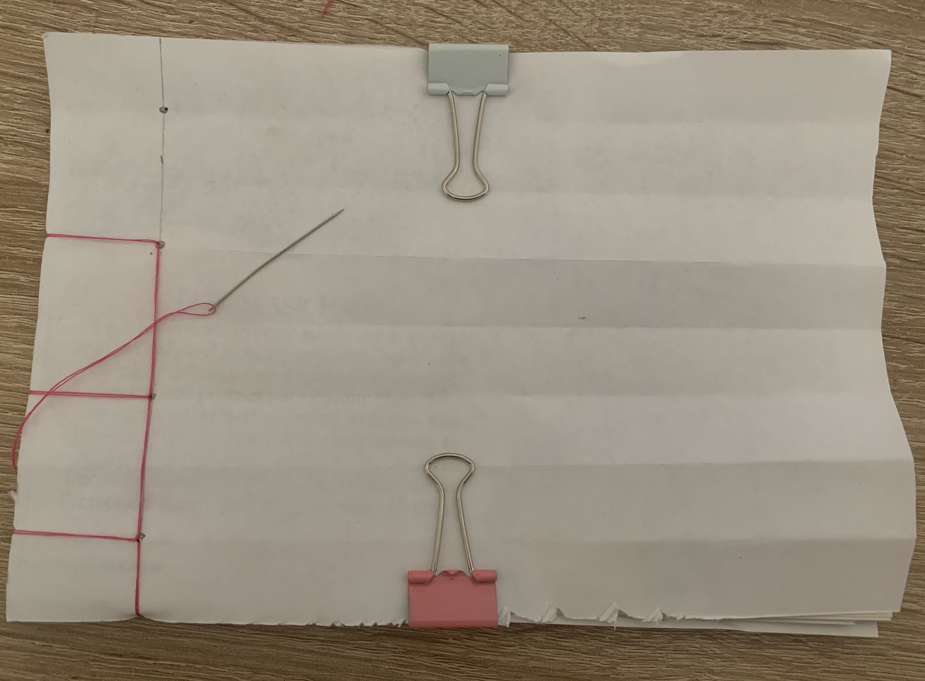 I started off by following the example in our course materials. This was an easy and fast technique which feels as though it has a strong bond between the pages. I used bright pink thread so that the binding technique is clear.