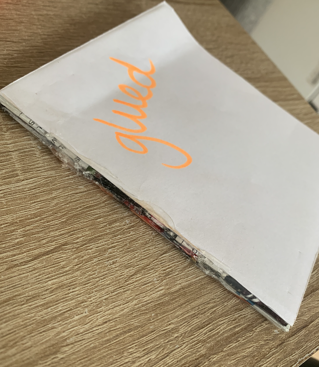 After the complications with the previously glued book I went and and get some PVA glue and decided to try a different technique, This time I attempted the ‘Perfect’ binding technique commonly seen in magazines. For this I used the rough copies of my images which are single sided printouts. This technique feels as though it could fall apart however that may because of the quality of glue? Although this was the easiest technique to do by simply applying layers of glue I feel its the least successful.