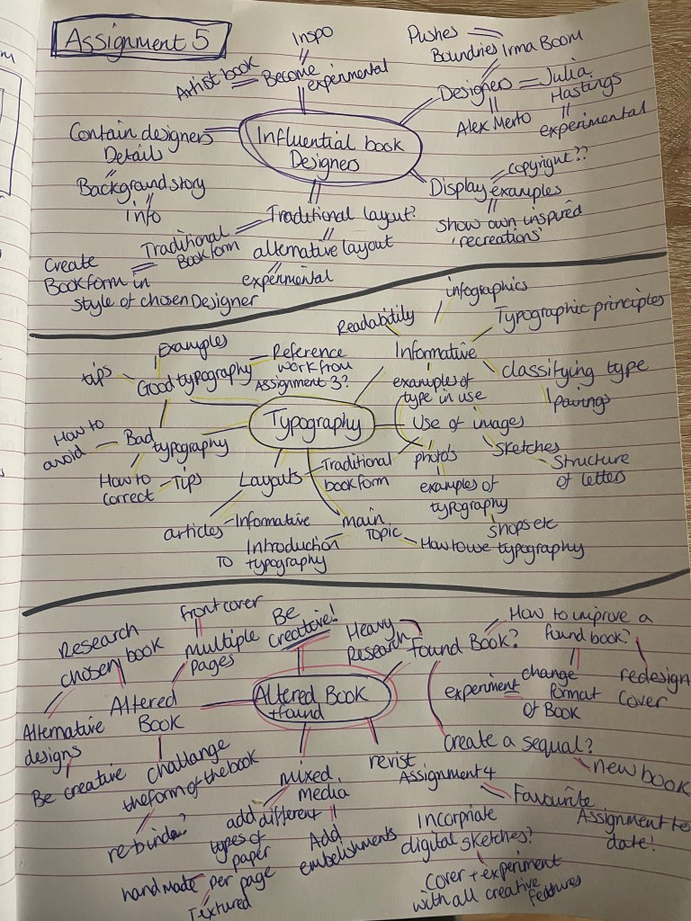 Before decided what my book will be about, I decided to create a small mind map for each topic to see which I felt more inspired and creative by. I felt that the ideas naturally flowed with both typography and the altered book options. My only concern about choosing found & altered books is that I end up repeating and creating something very similar to Assignment 4, so with a long think and a few days break to ensure I’m not rushing my choices I have decided to choose Typography as the topic of my book. (Plus I’m intrigued to see something which I design in book form! I feel this could become very rewarding and something I can keep hold of once printed)